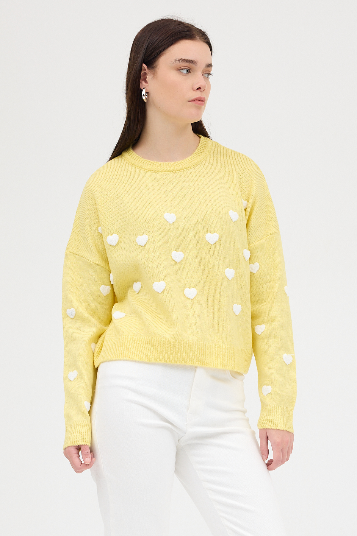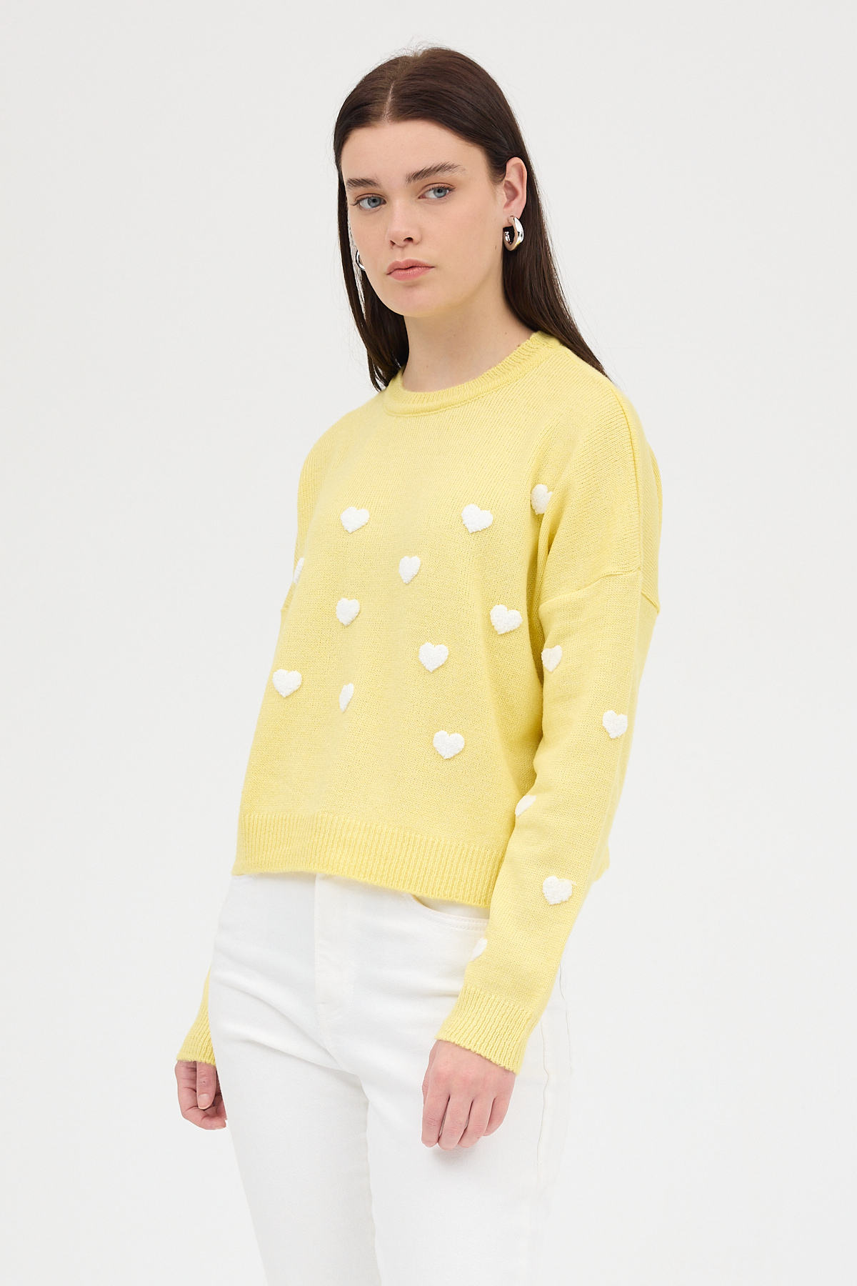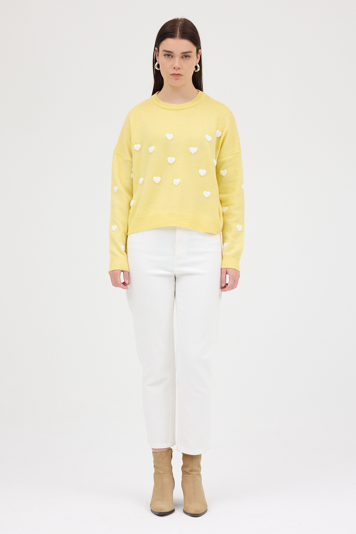Sarı Kalp Nakışlı Bisiklet Yaka Crop Kazak 2337