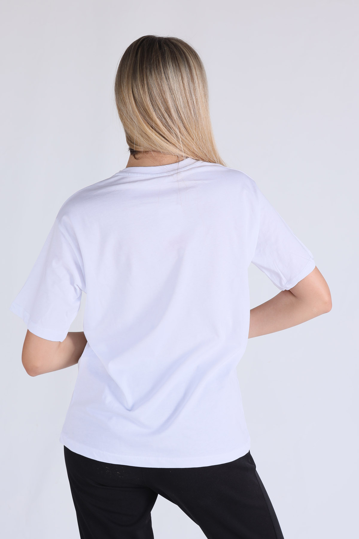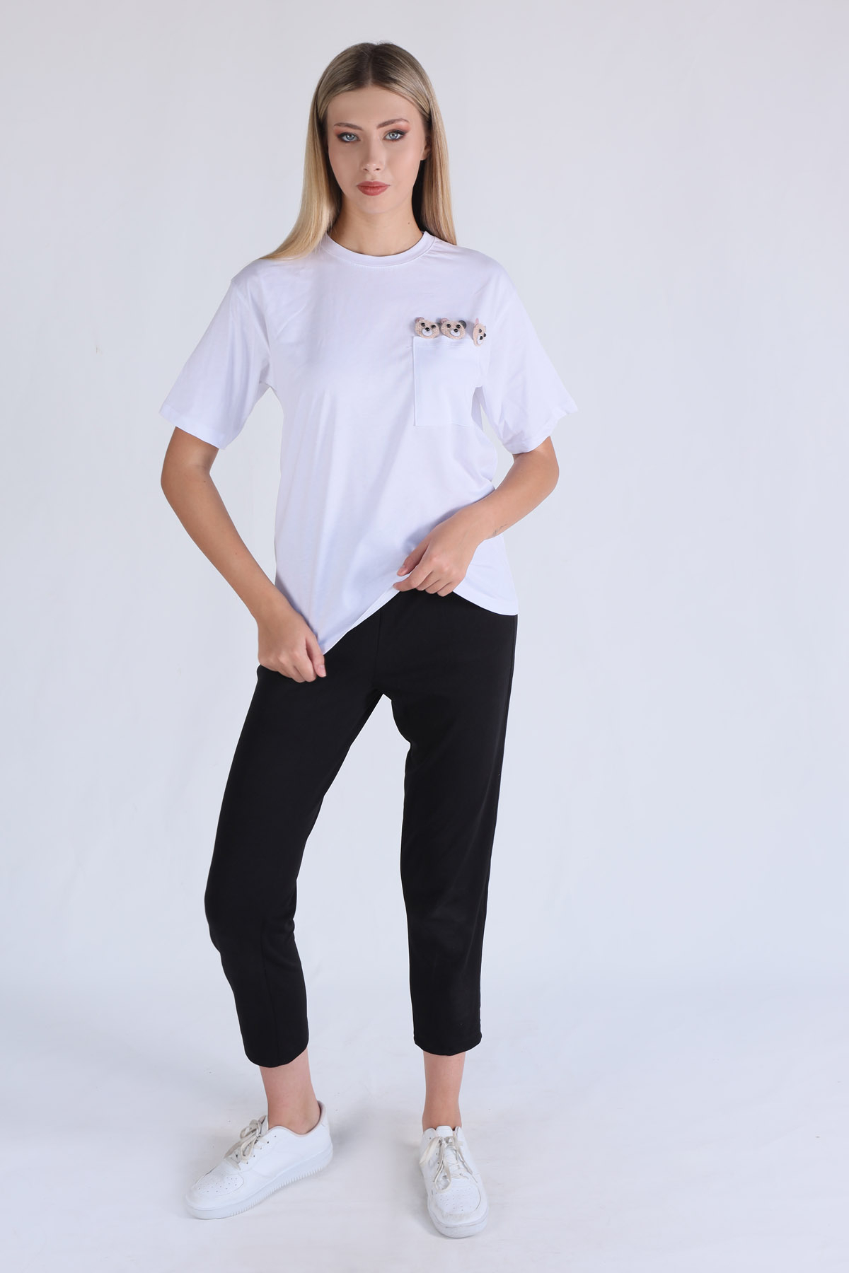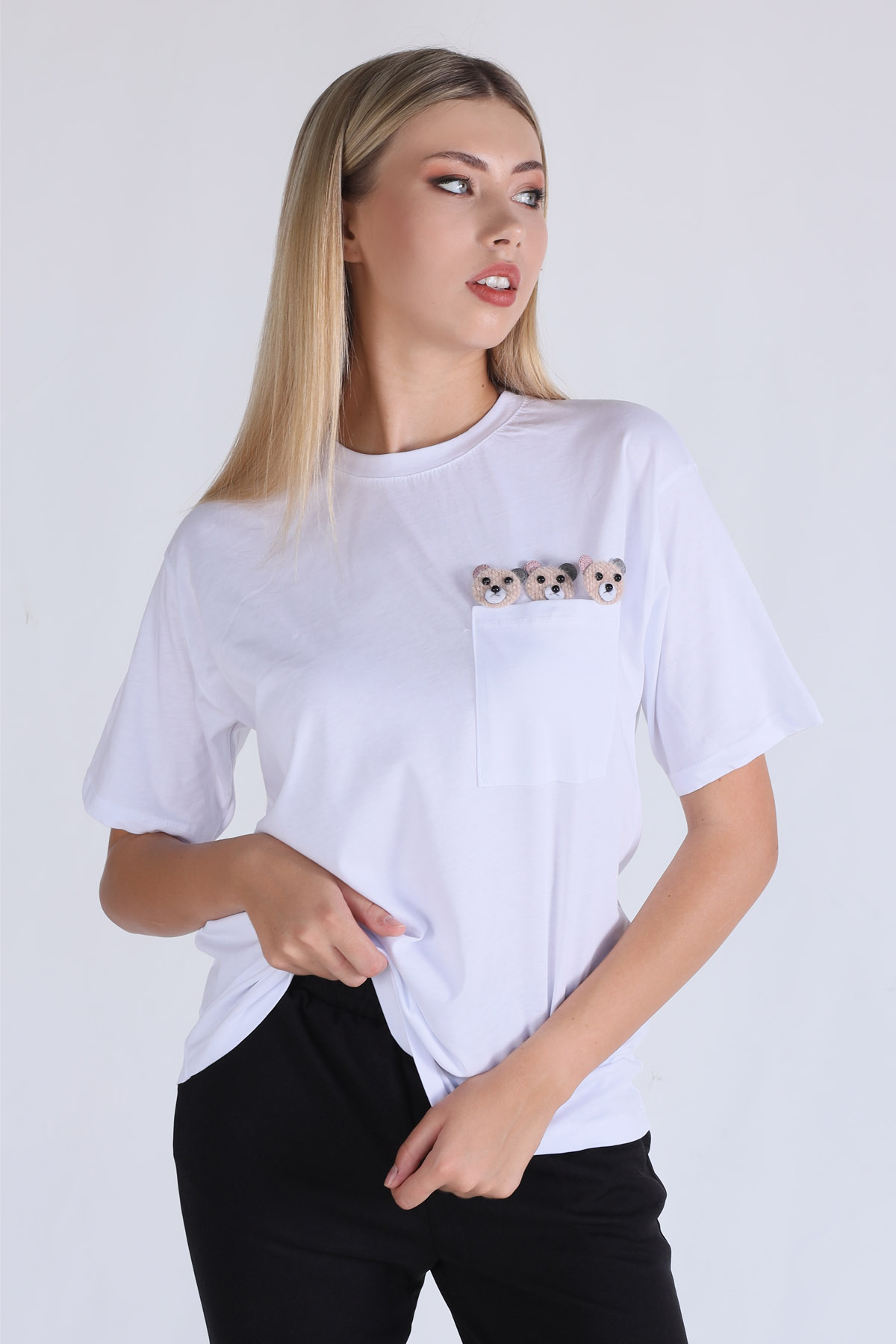 Beyaz Cep Ayıcık Aksesuarlı Tişört 23398
