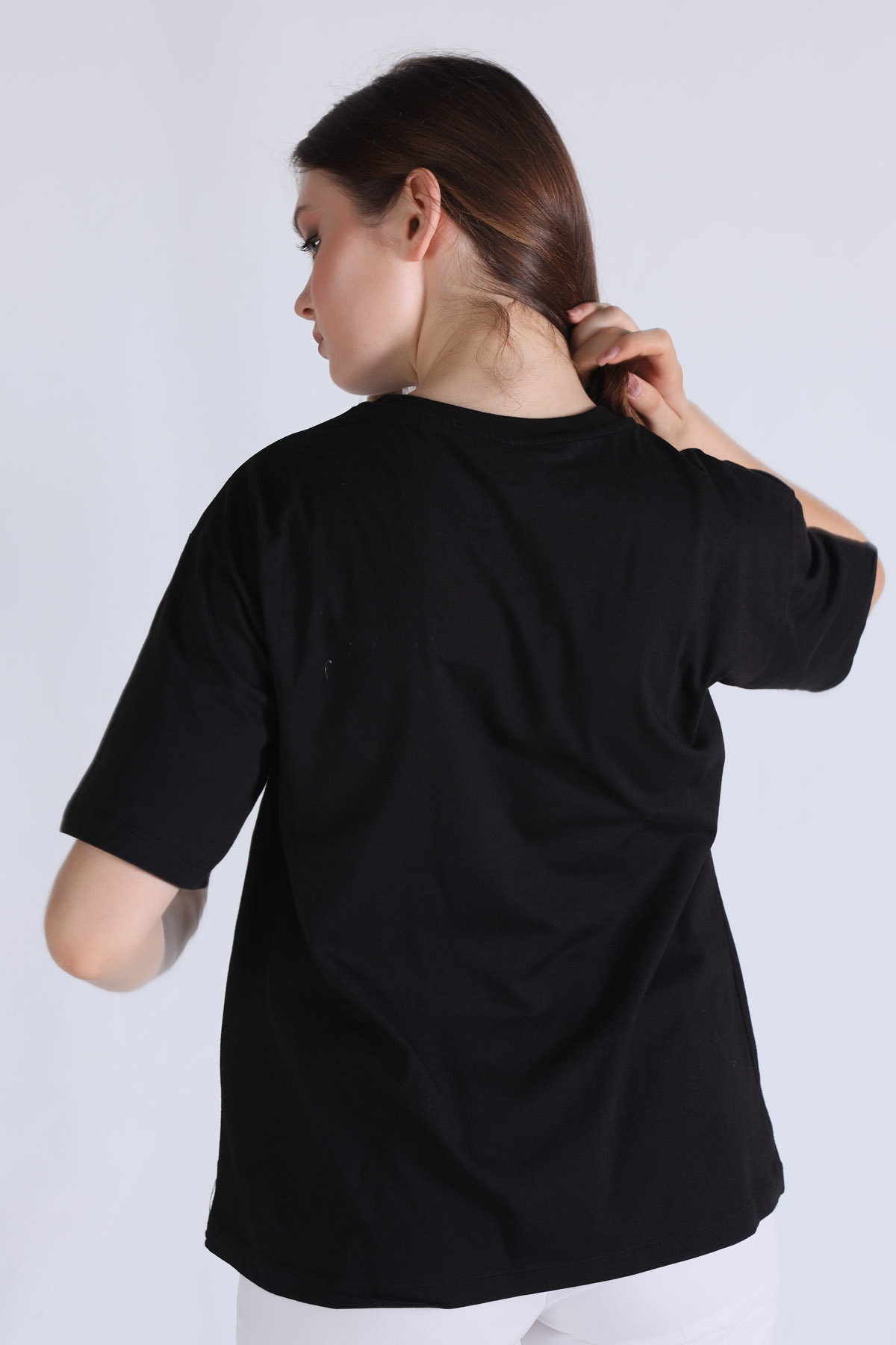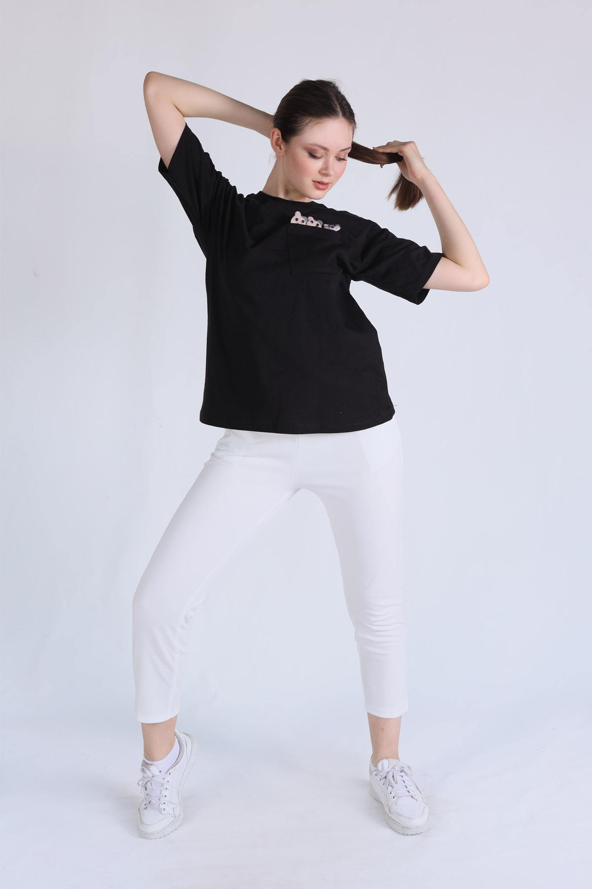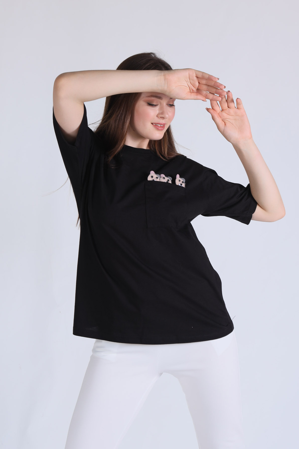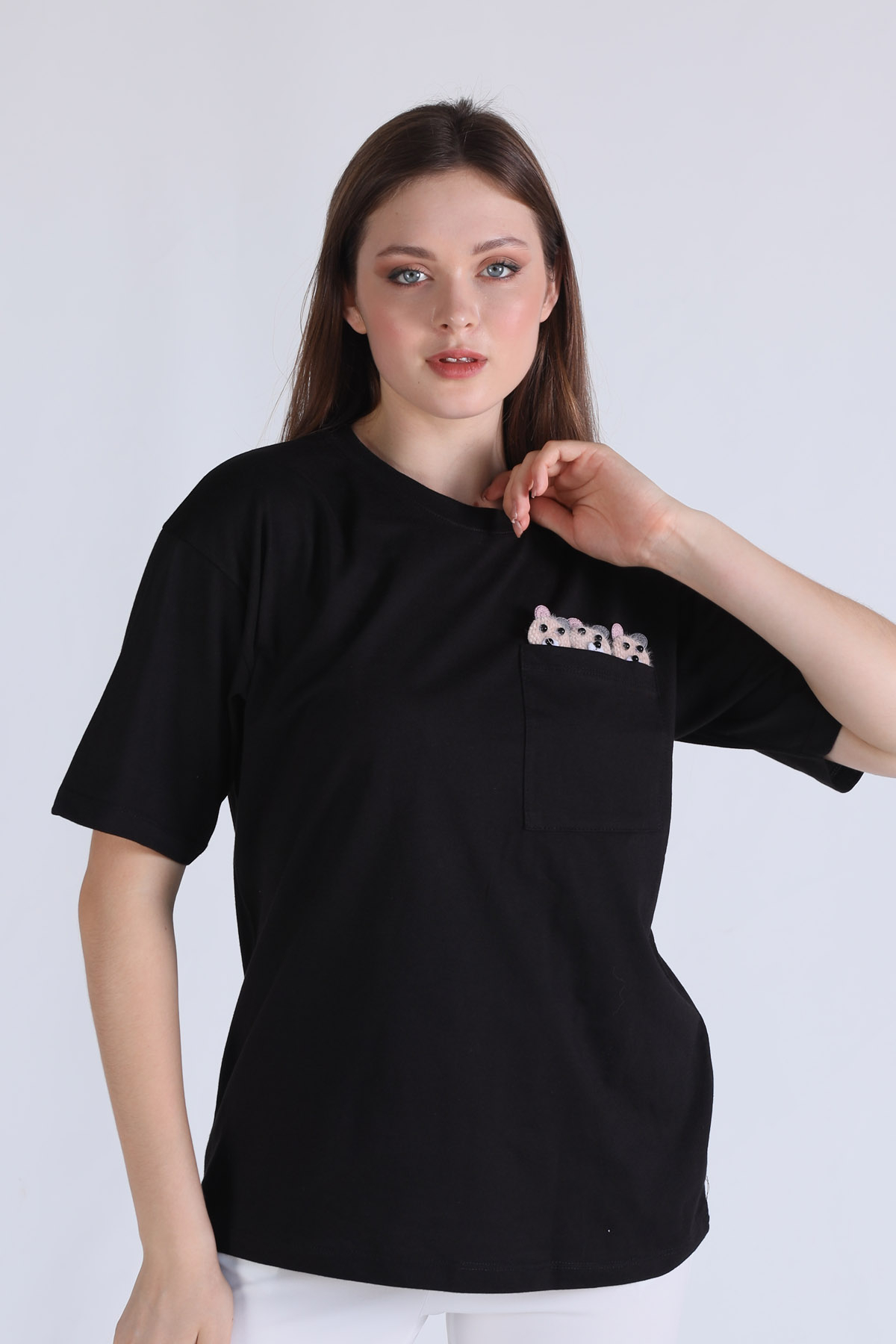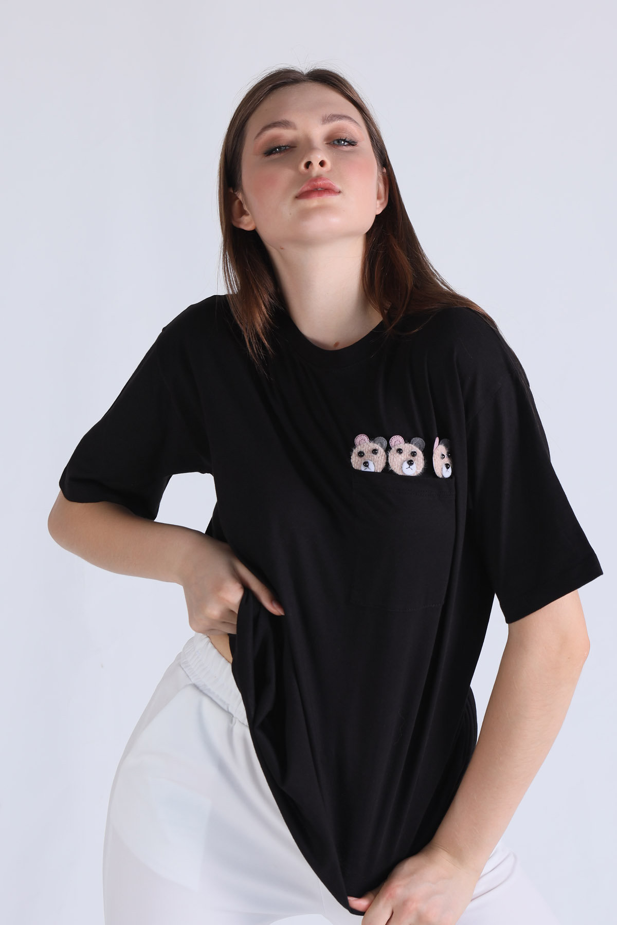 Siyah Cep Ayıcık Aksesuarlı Tişört 23398