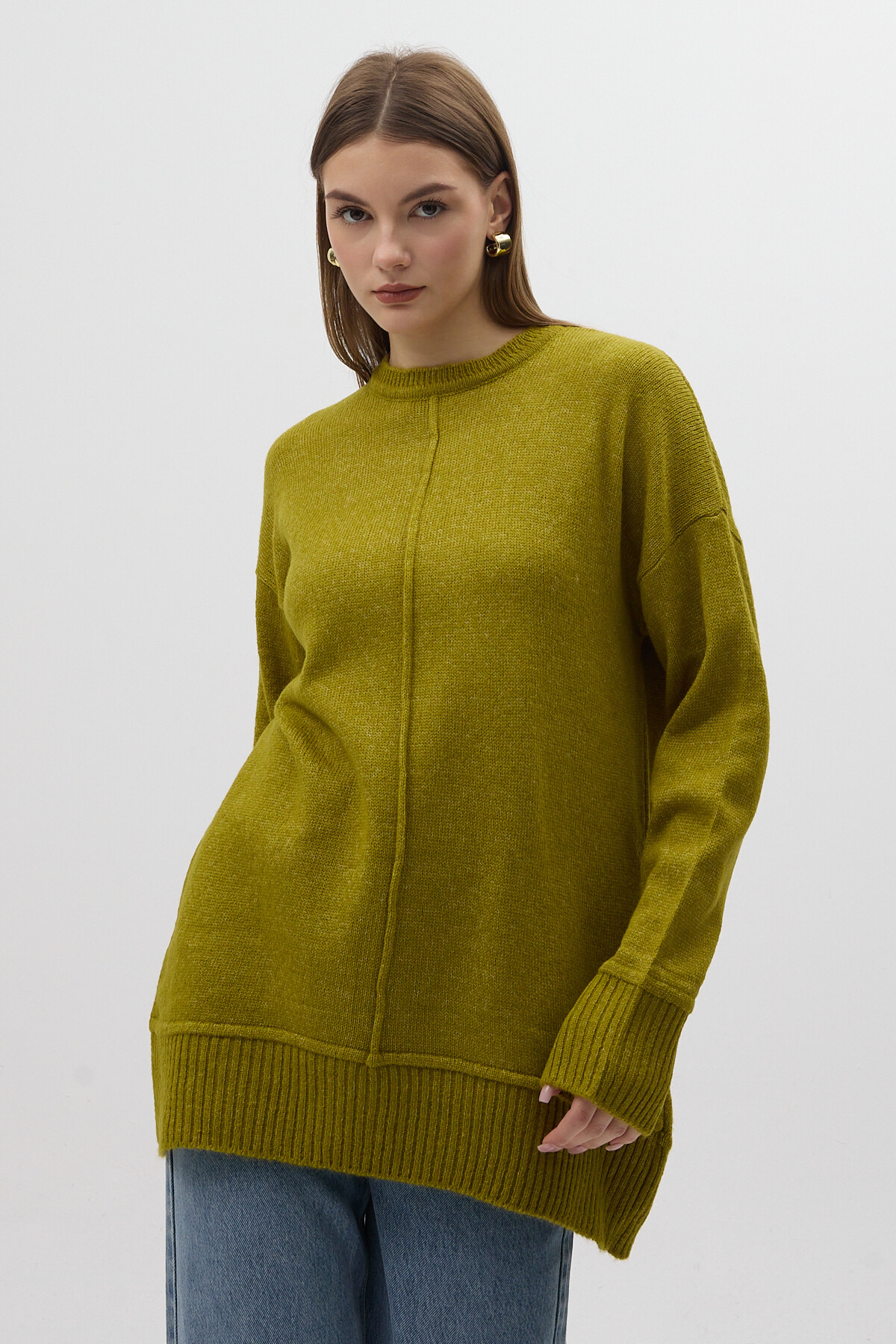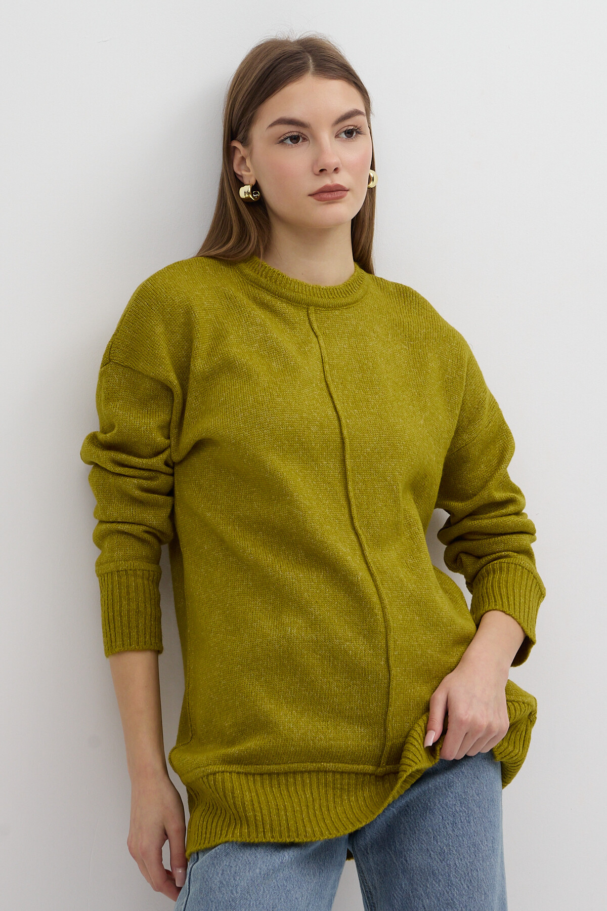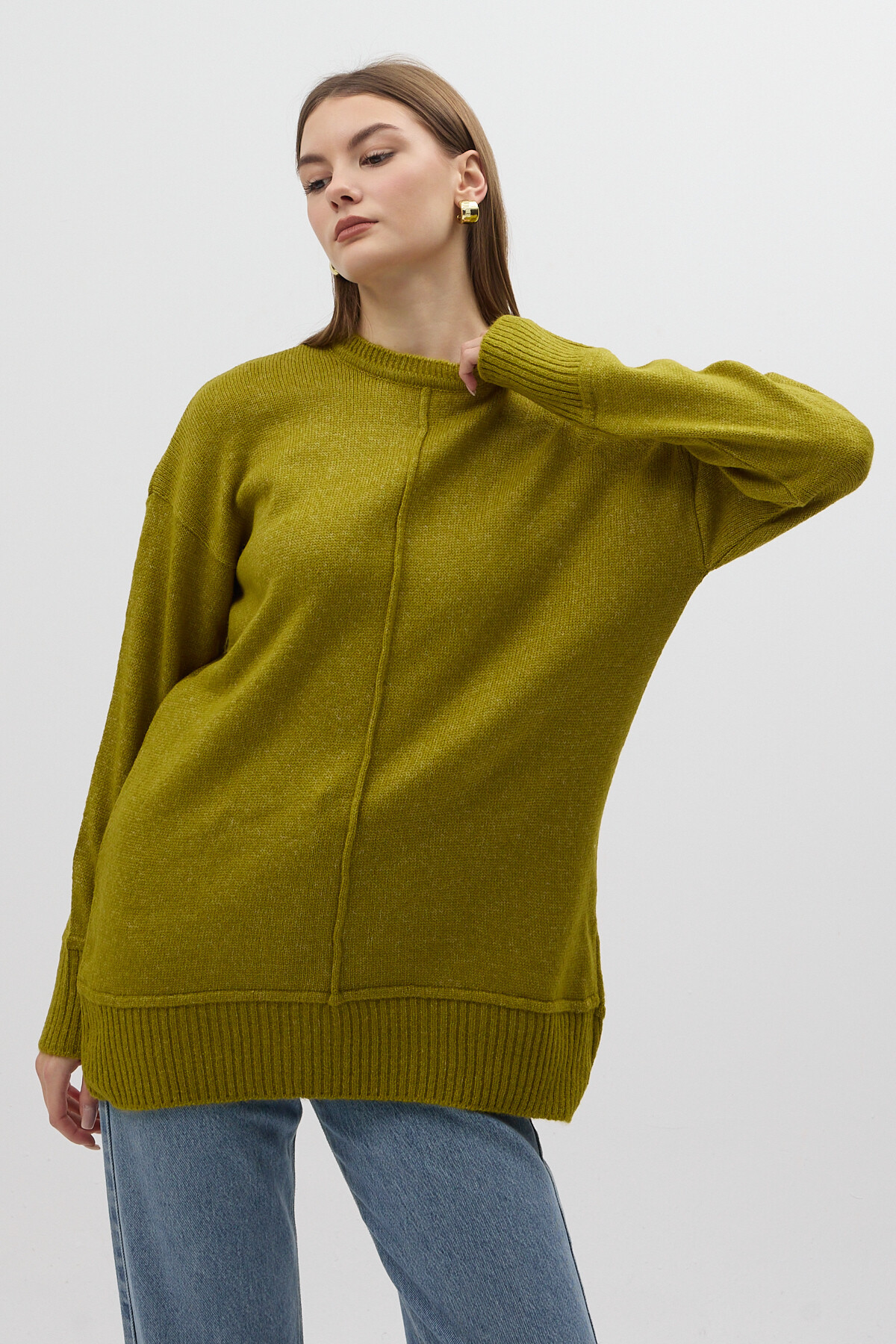 Olive Yeşili Bisiklet Yaka Ön Dikiş Detaylı Kadın Kazak 2345