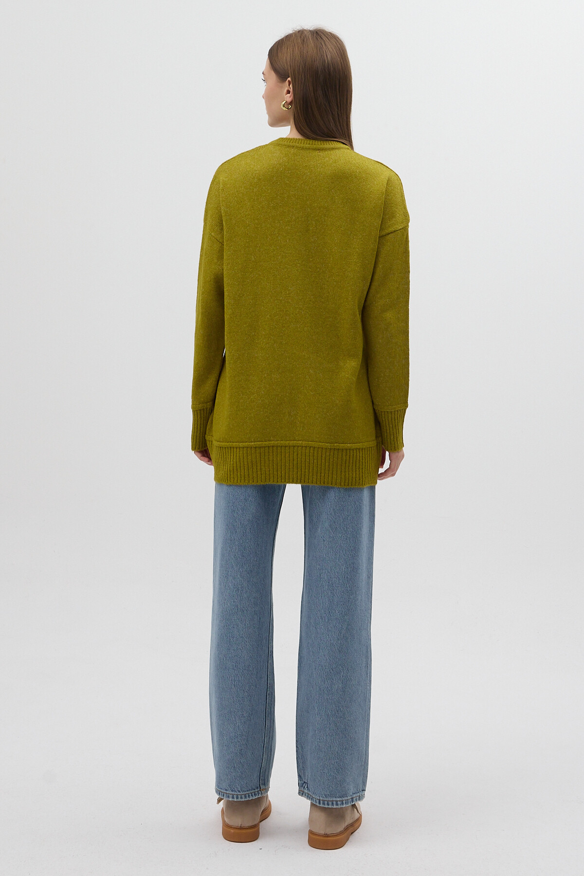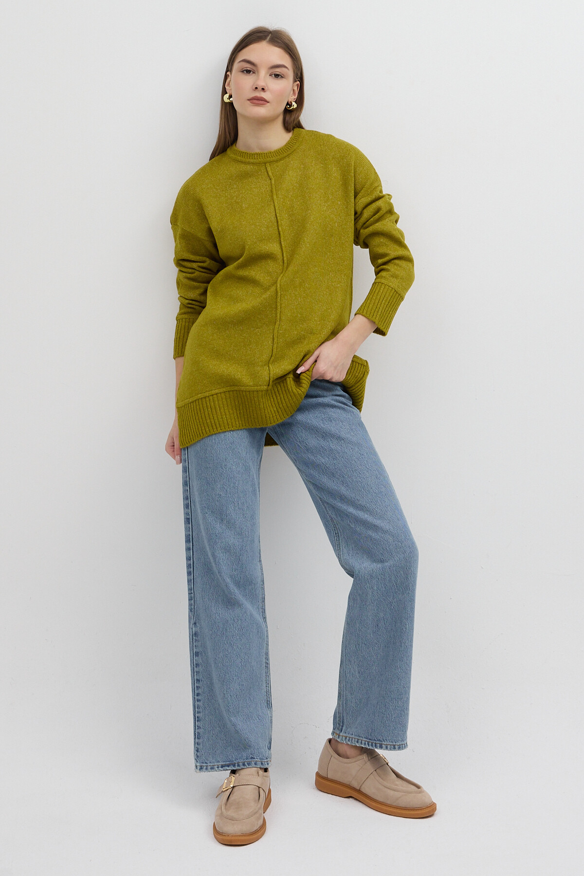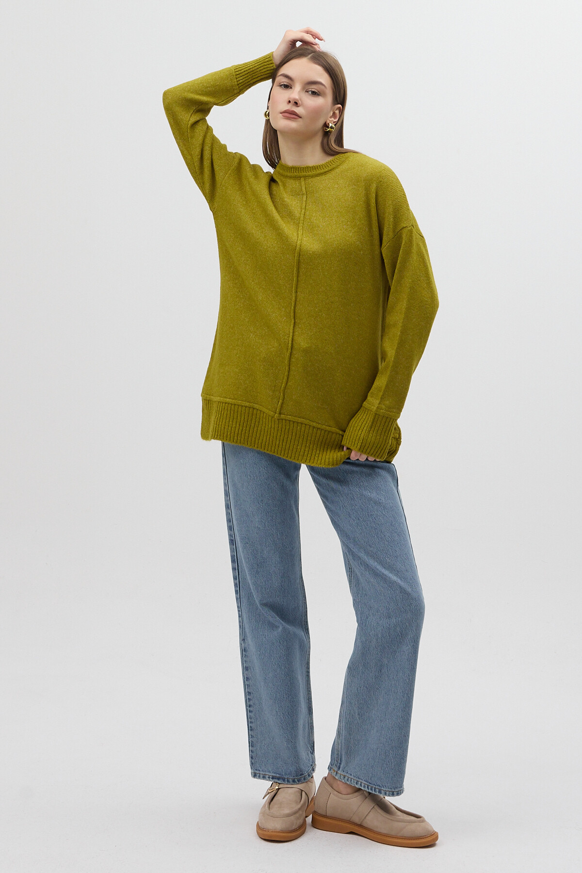Olive Yeşili Bisiklet Yaka Ön Dikiş Detaylı Kadın Kazak 2345