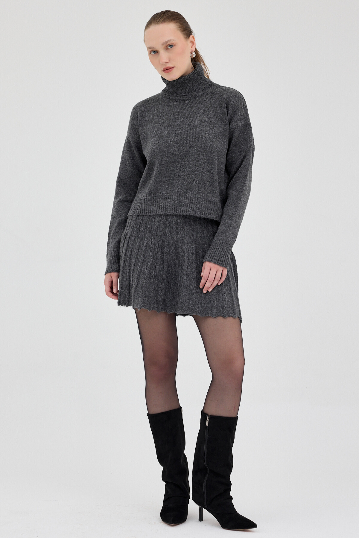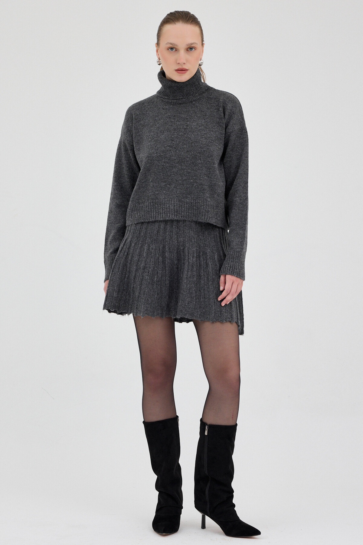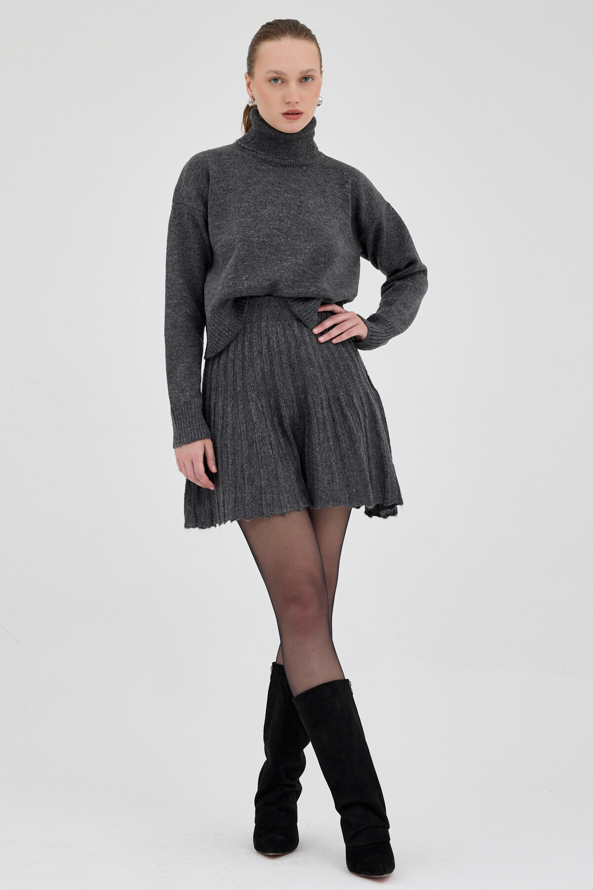 Antrasit Boğazlı Triko Kazak ve Pileli Mini Etek İkili Takım 2361