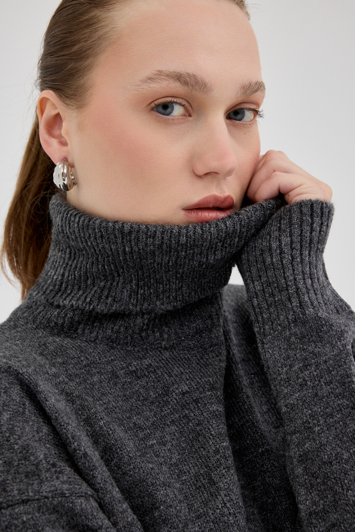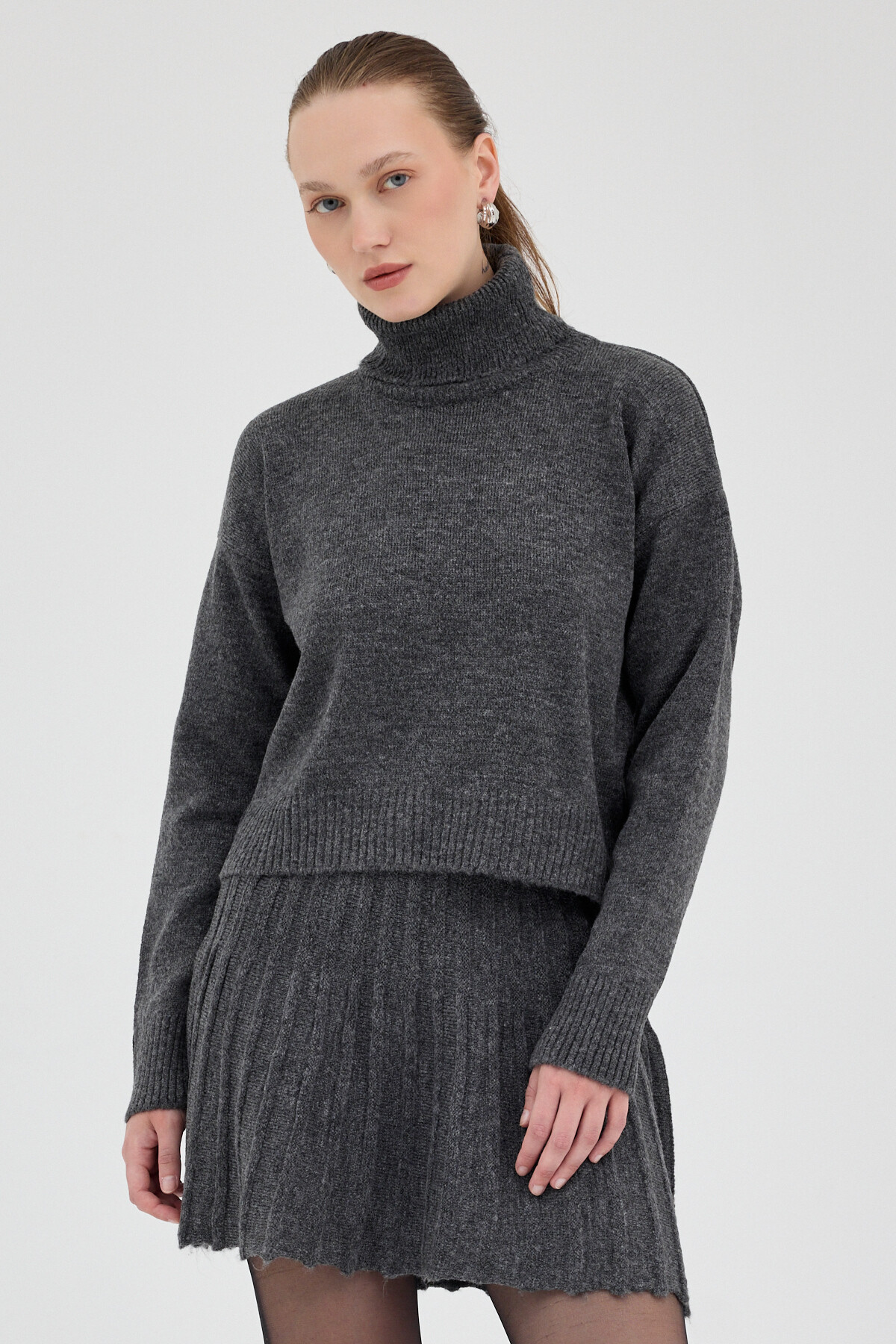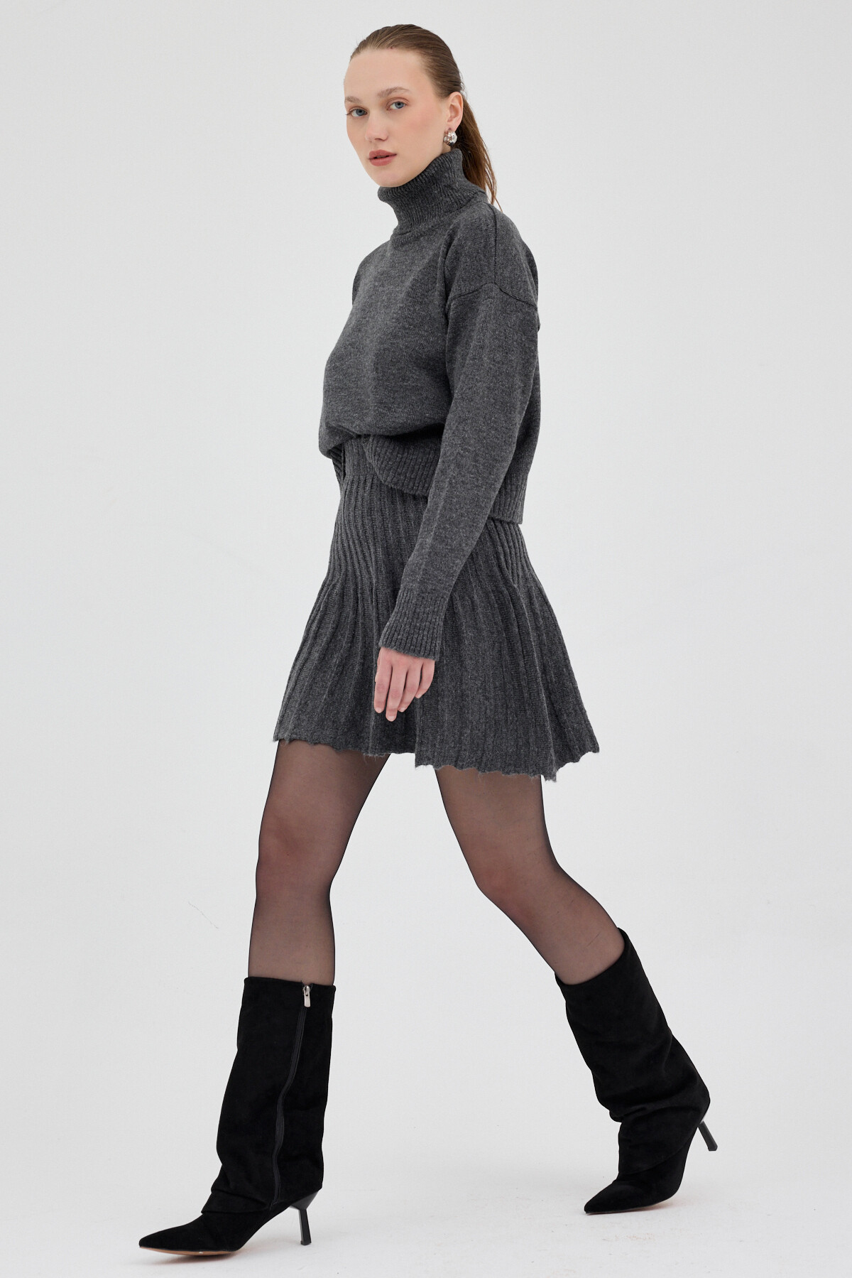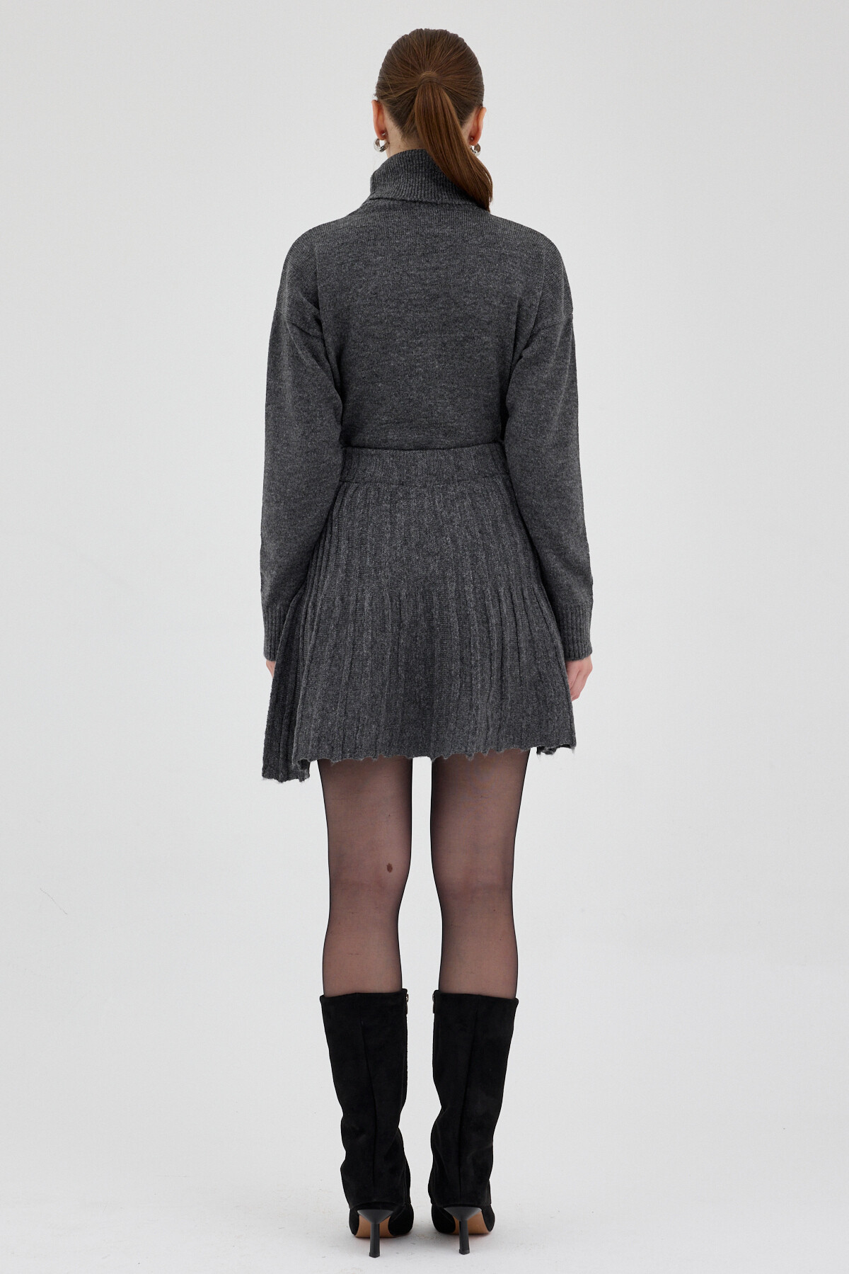 Antrasit Boğazlı Triko Kazak ve Pileli Mini Etek İkili Takım 2361
