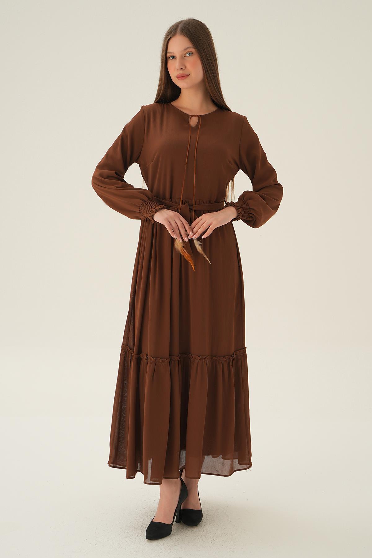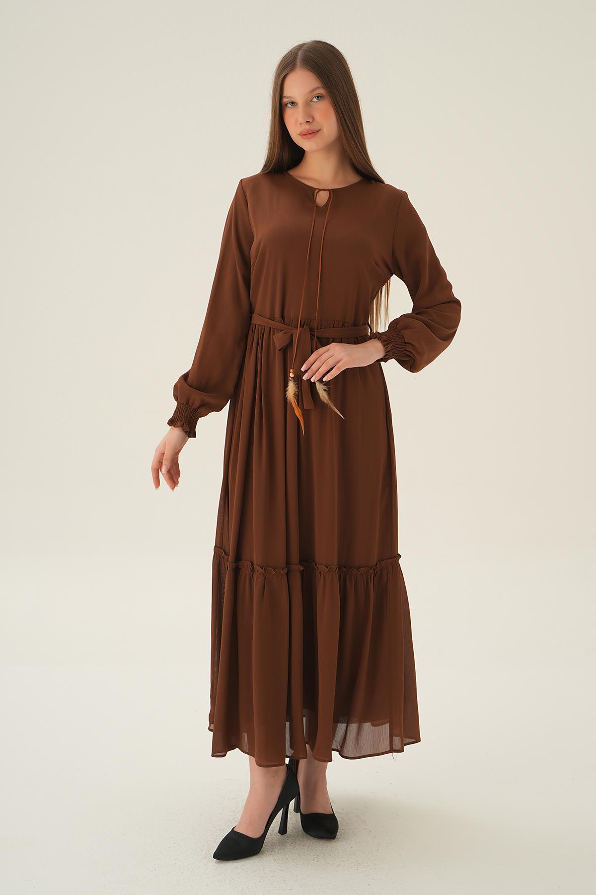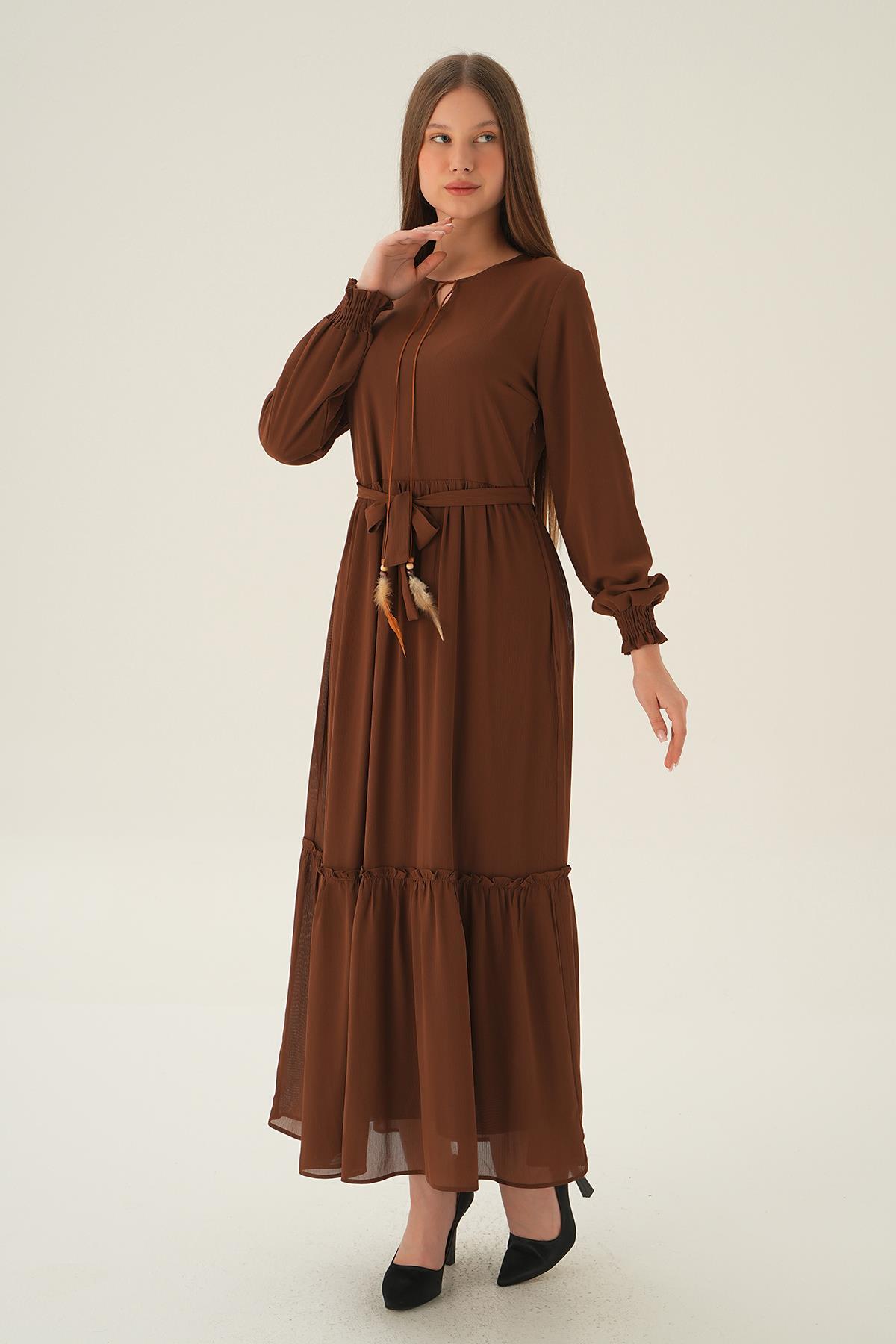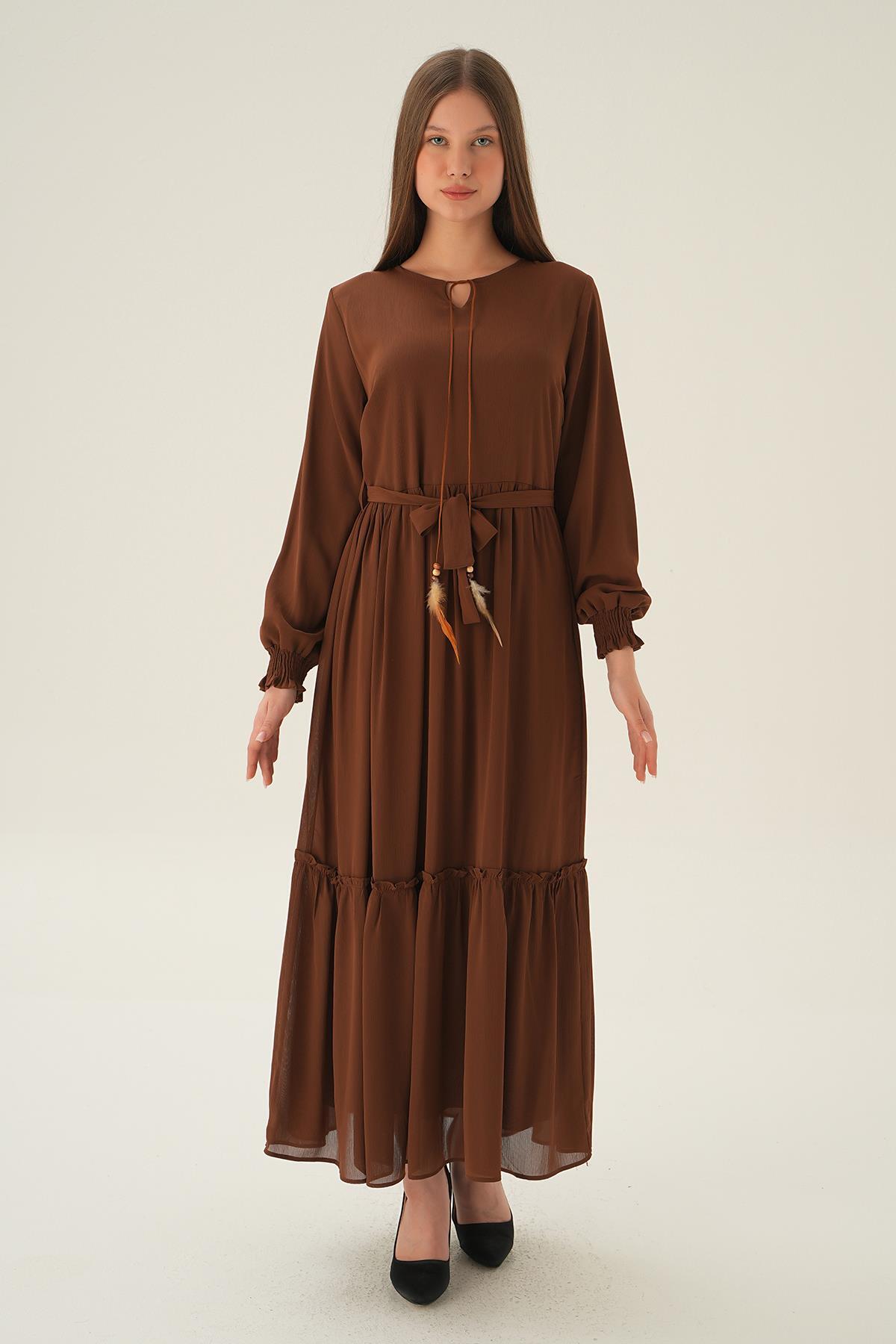 Kahve Kol Lastik Uzun Elbise 2634