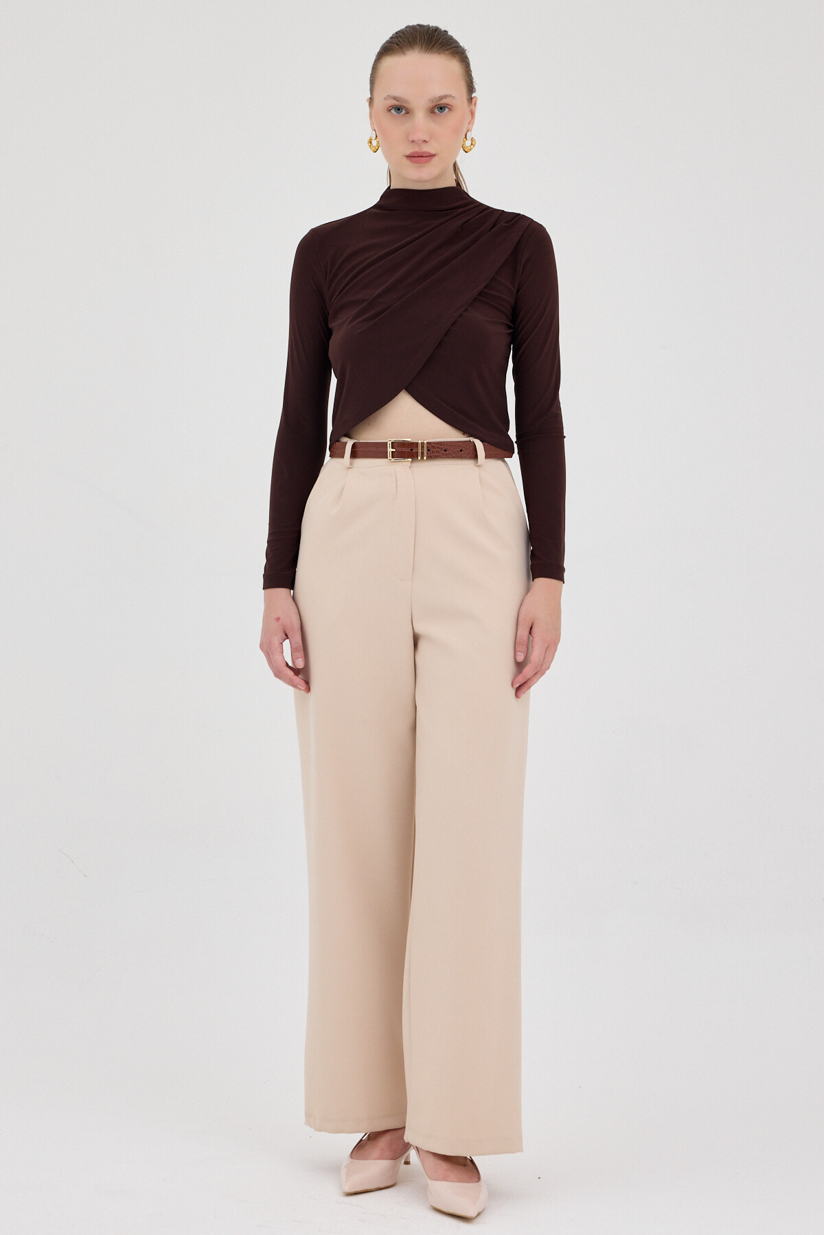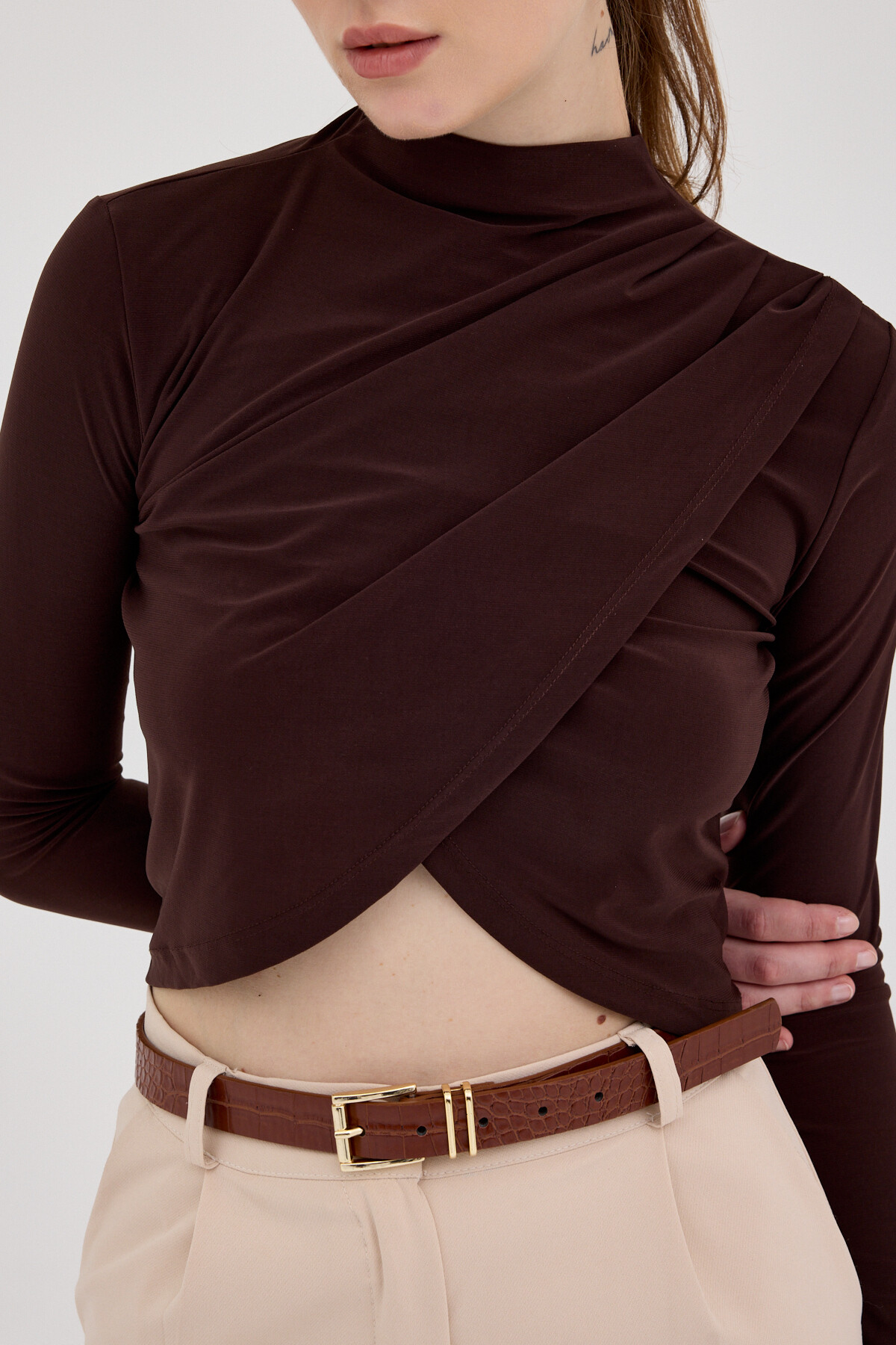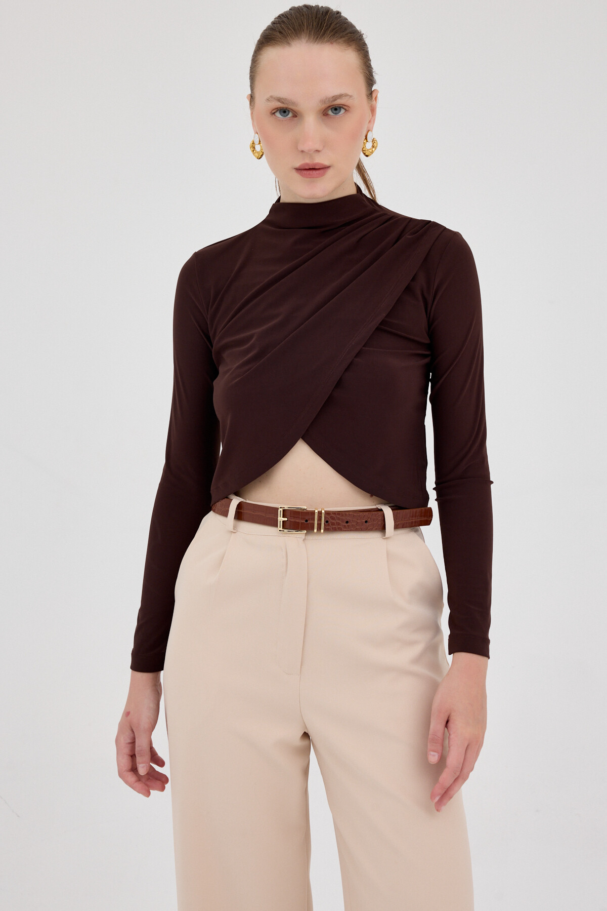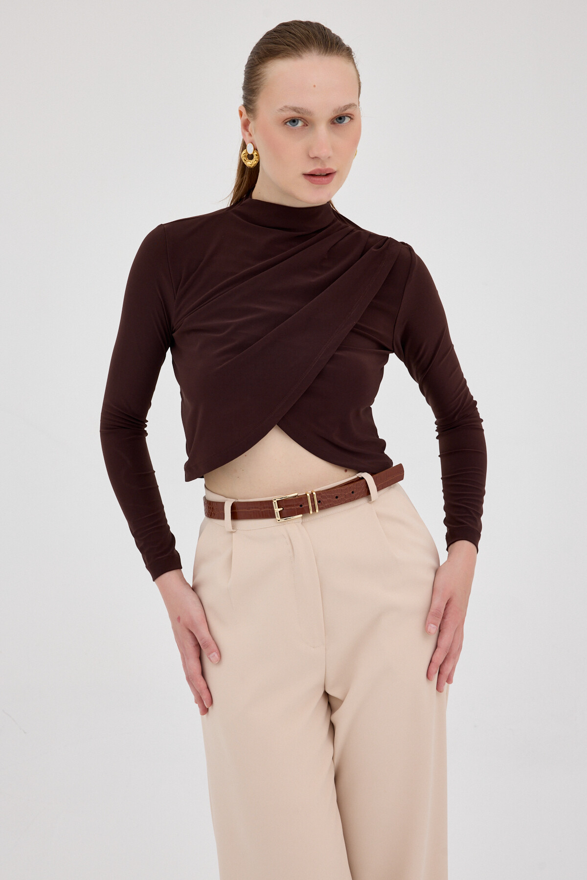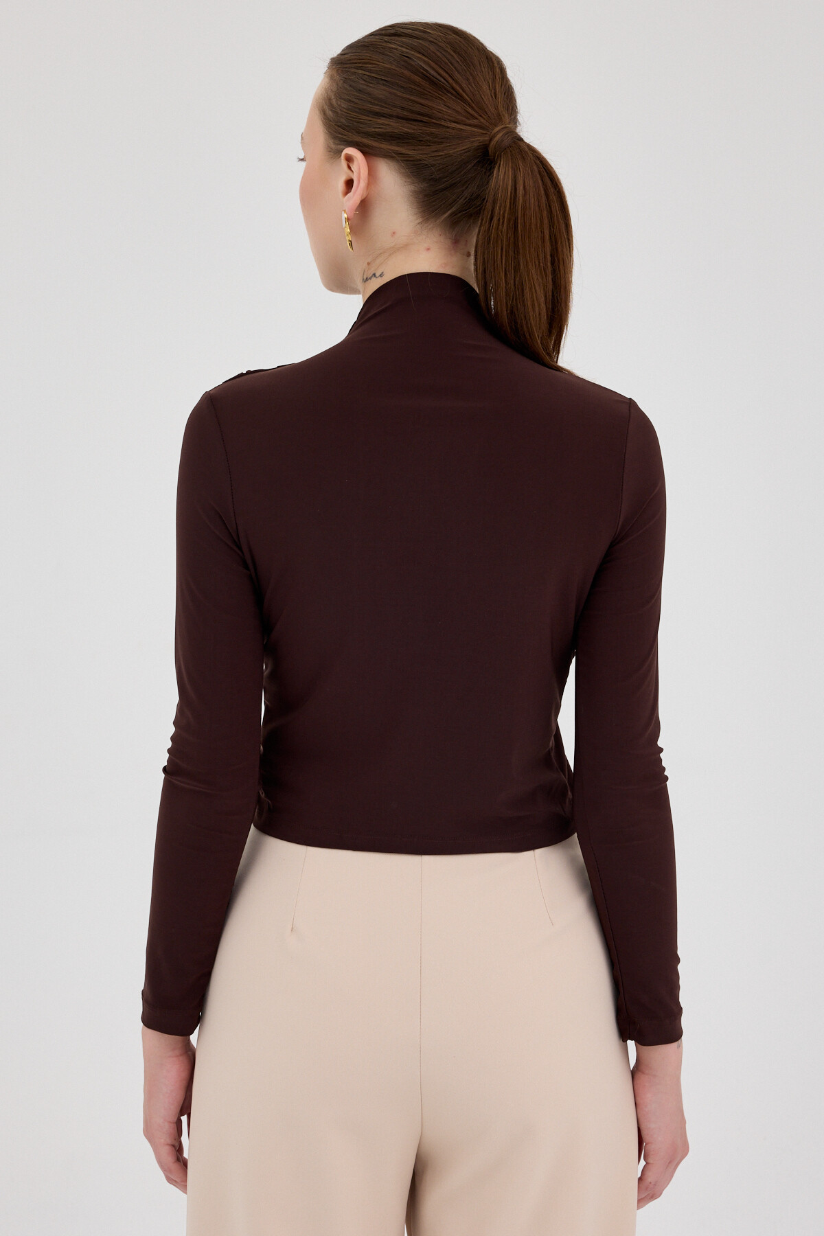 Acı Kahve Drapeli Yüksek Yaka Uzun Kollu Bluz 2379