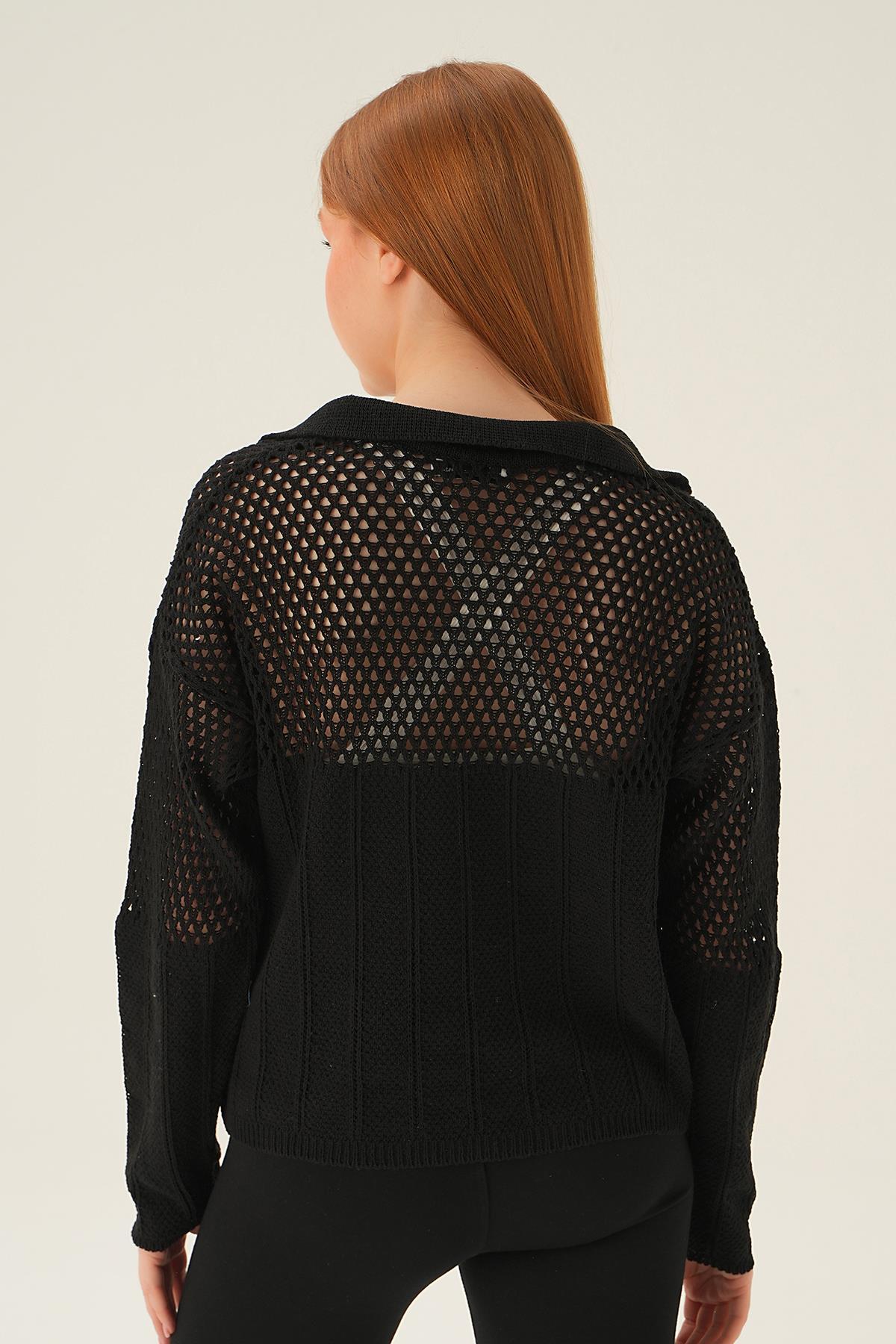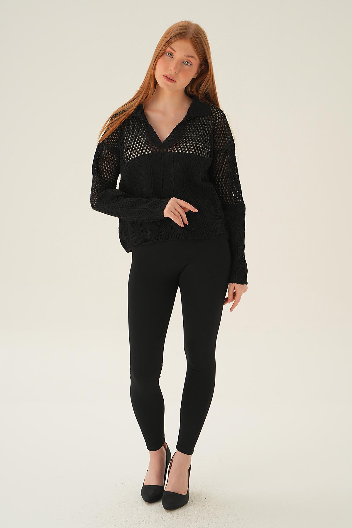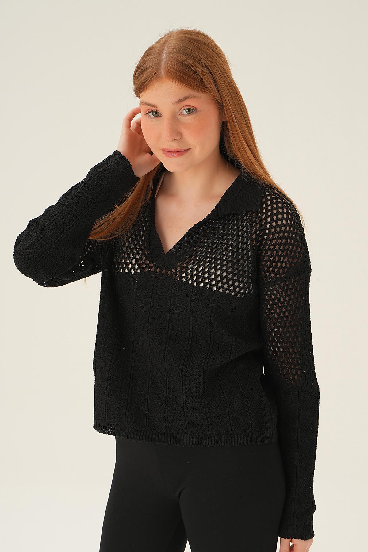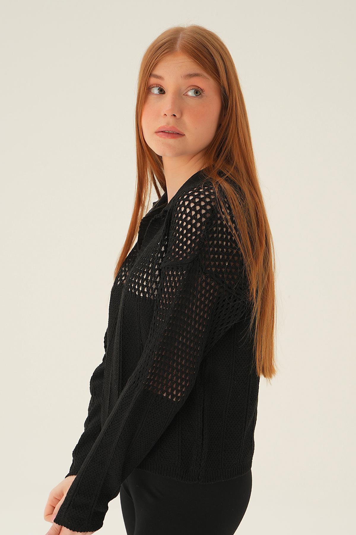 Siyah Polo Yaka Ajurlu Bluz 2405