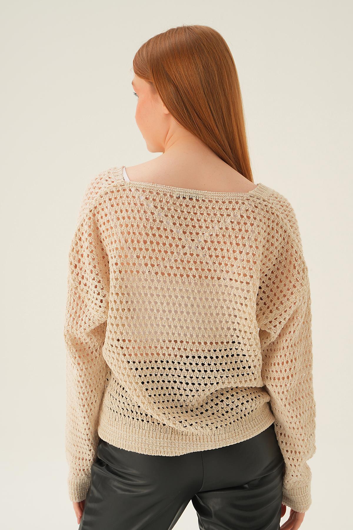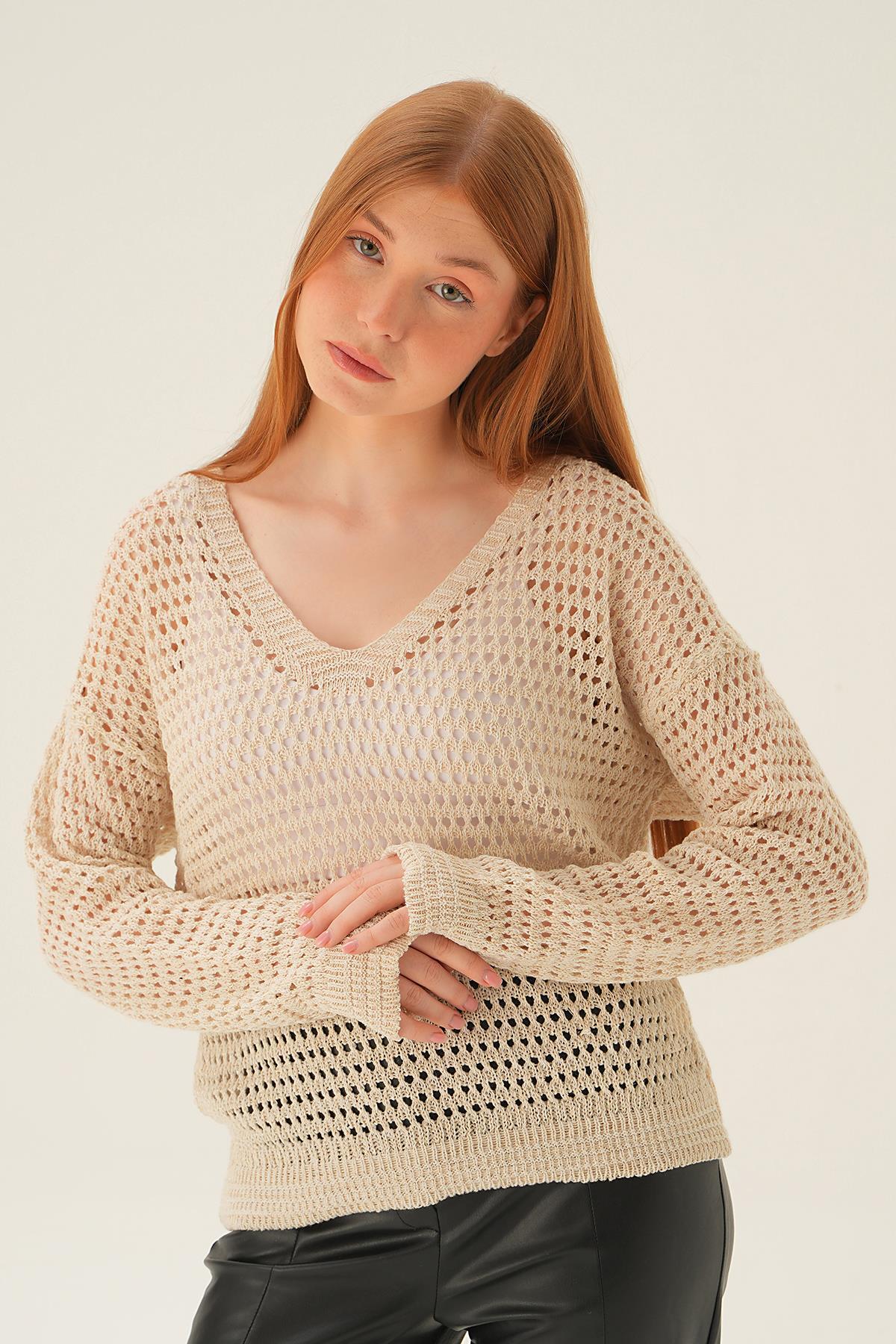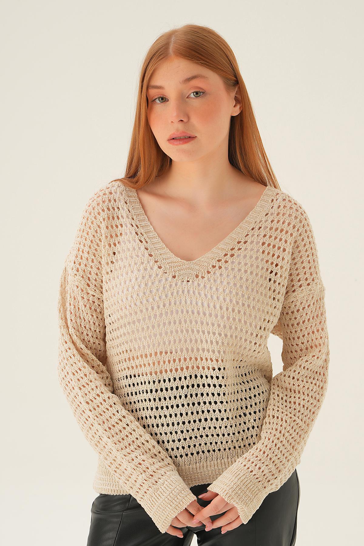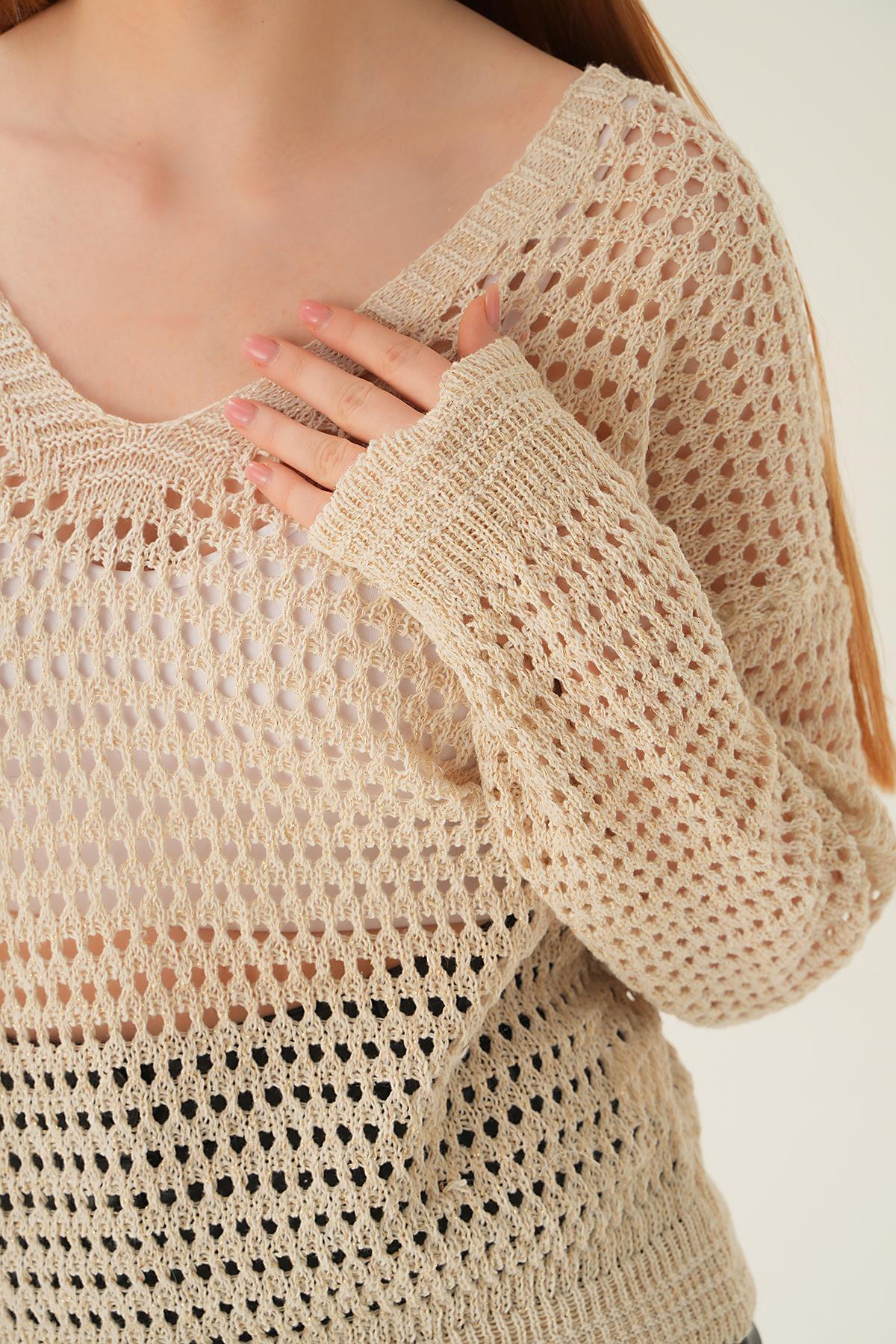 Bej Gold Simli V Yaka Bluz 2406