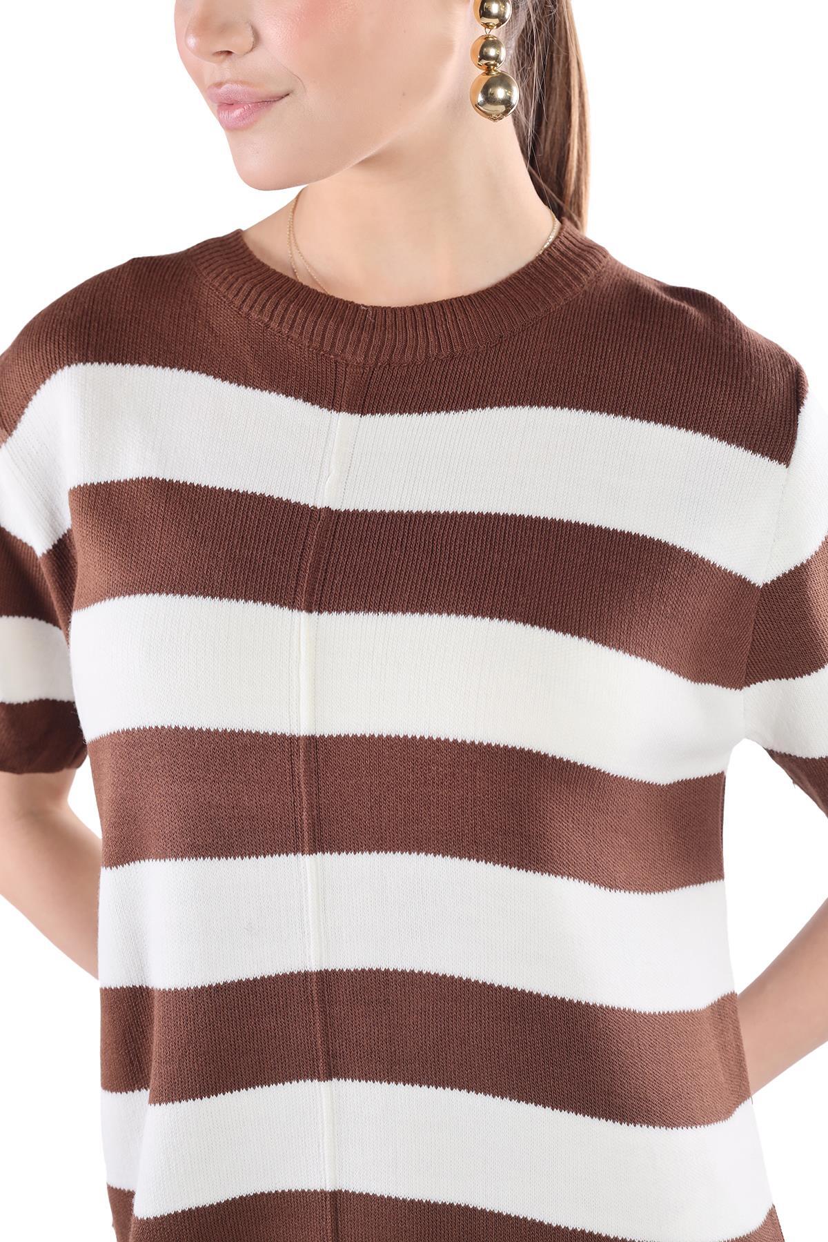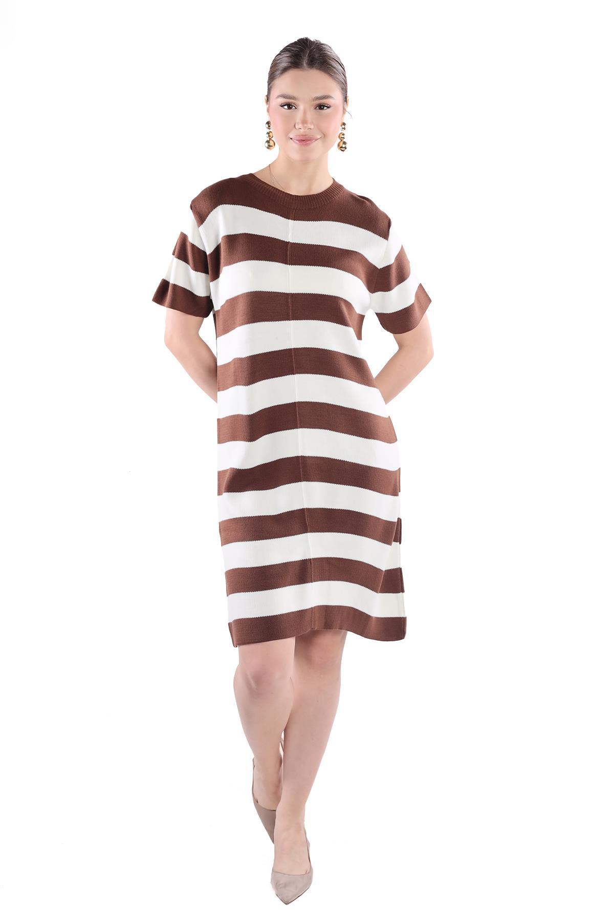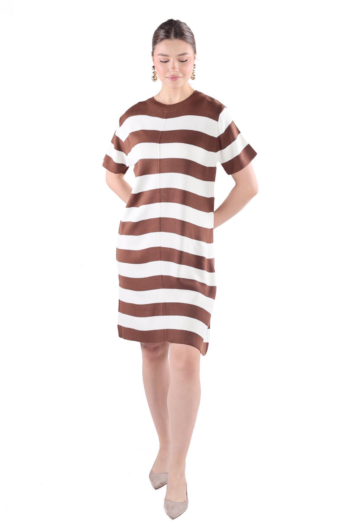 Kahve Çizgili Kısa Kol Elbise 24102