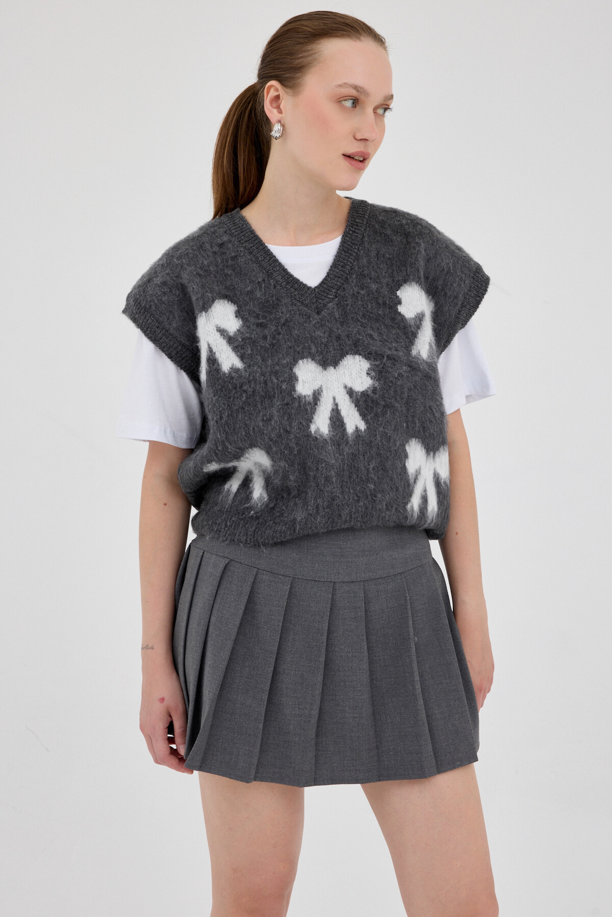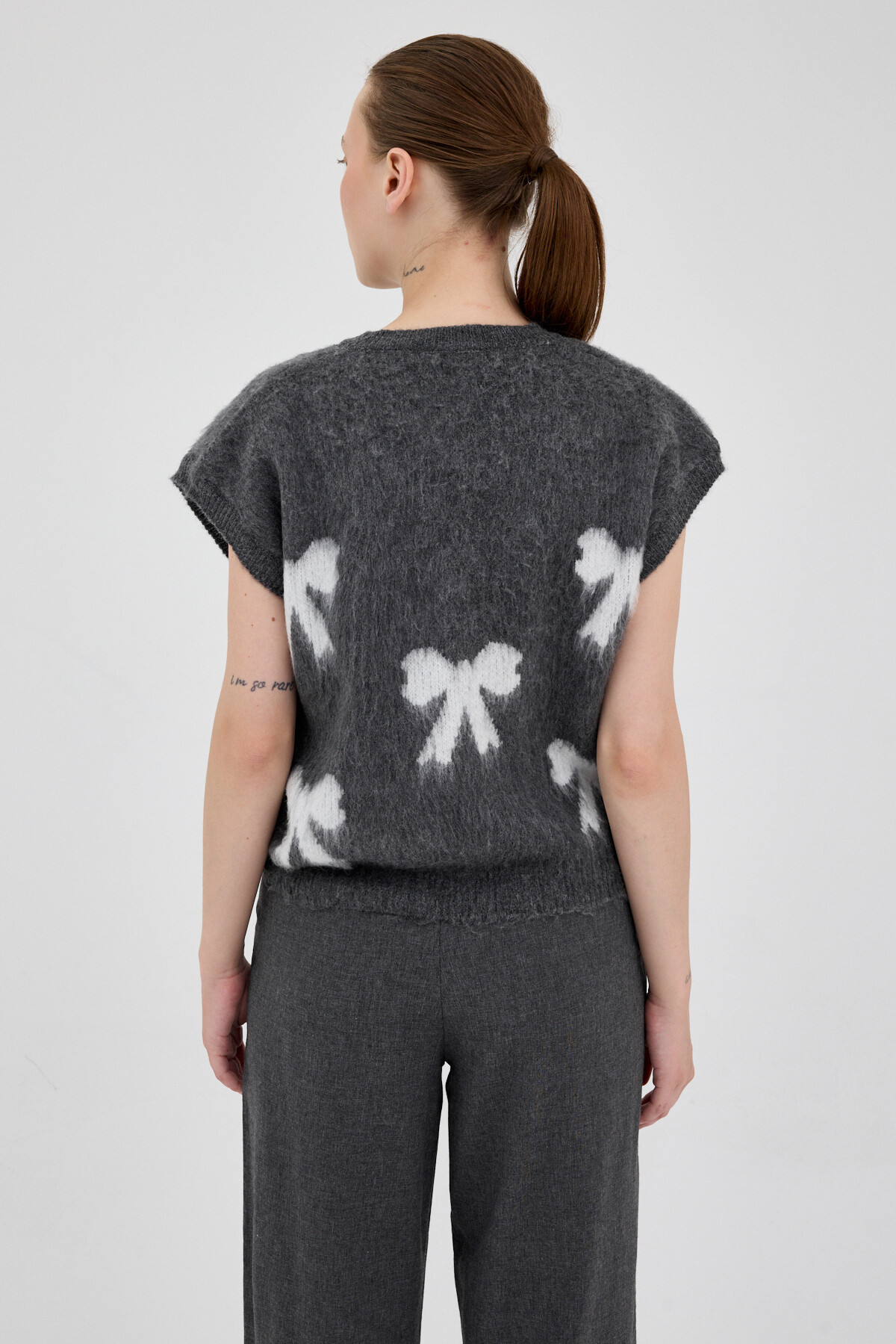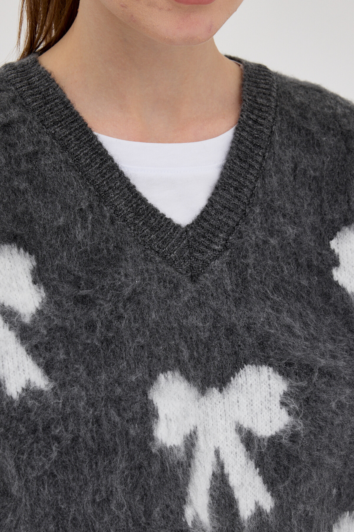 Antrasit V Yaka Fiyonk Desenli Kadın Süveter 2411
