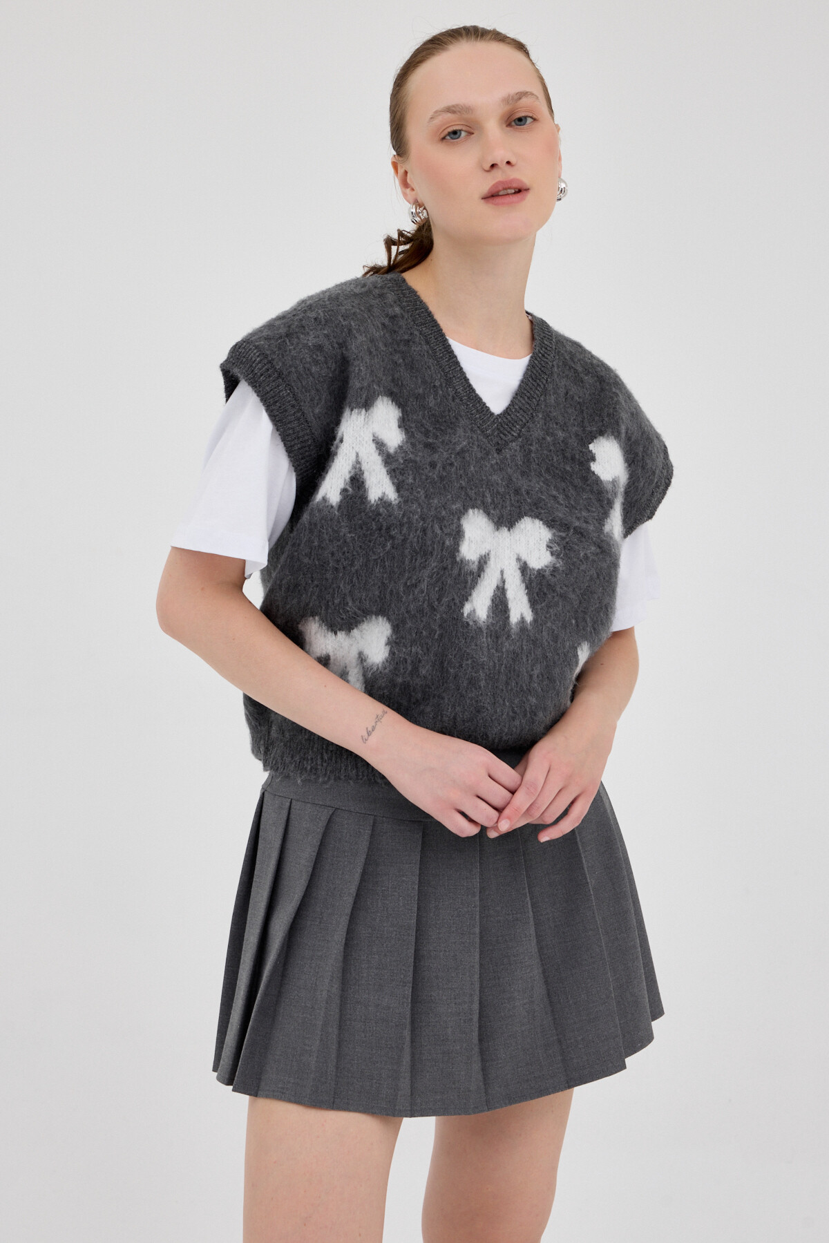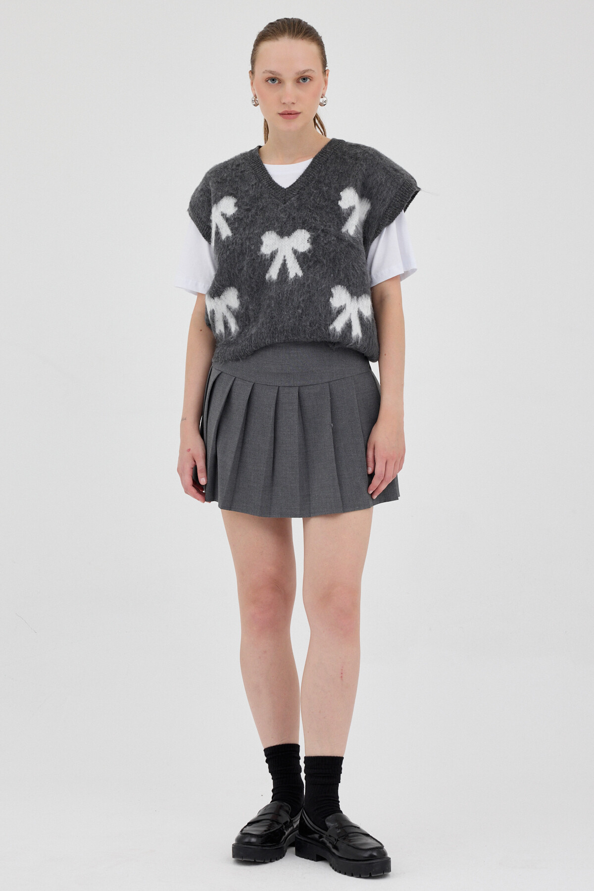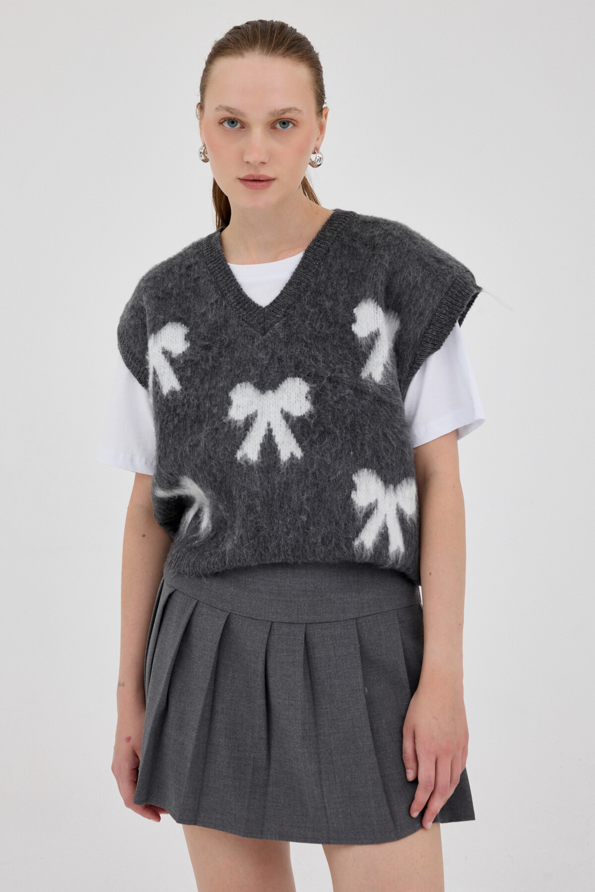 Antrasit V Yaka Fiyonk Desenli Kadın Süveter 2411