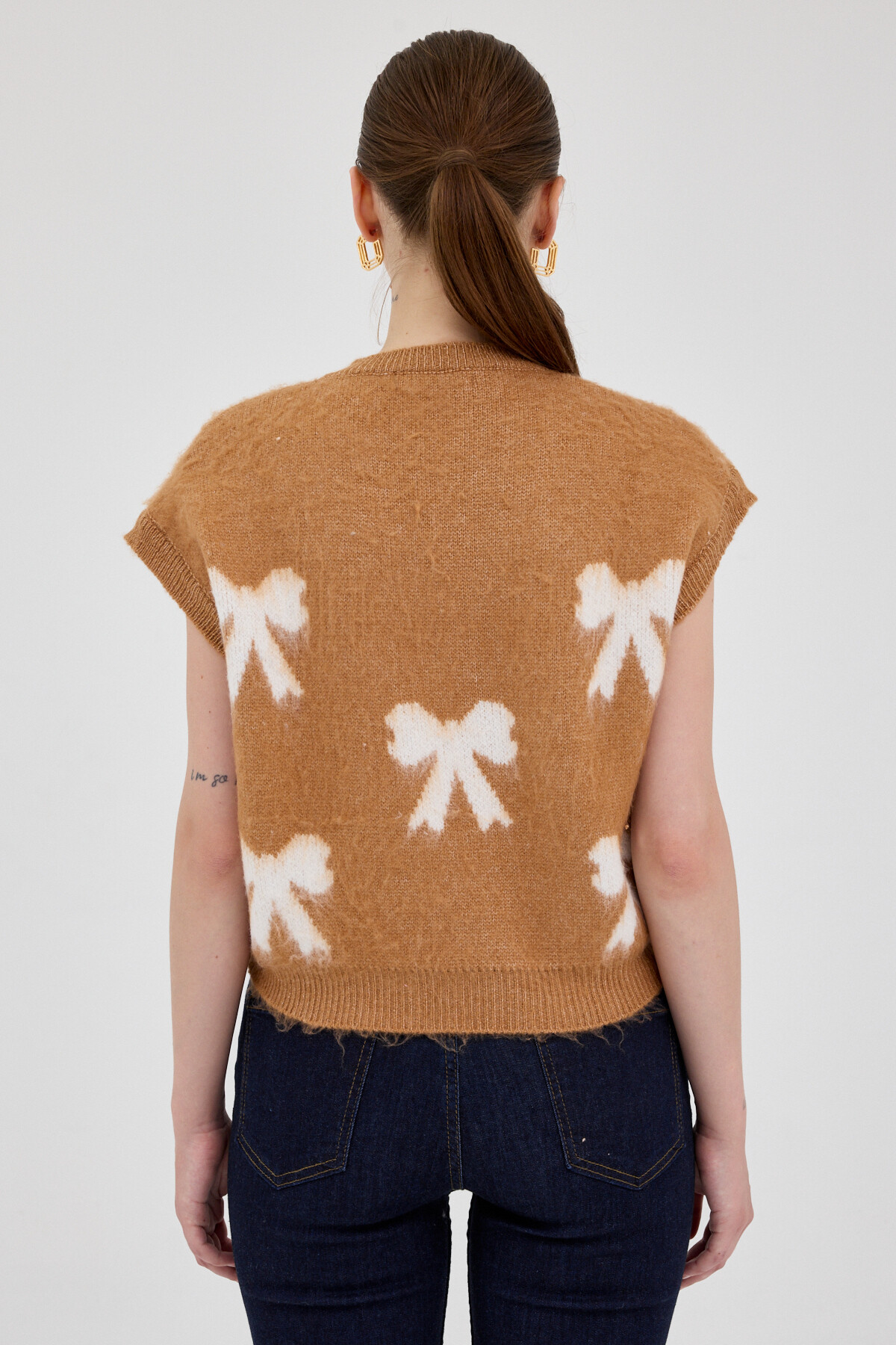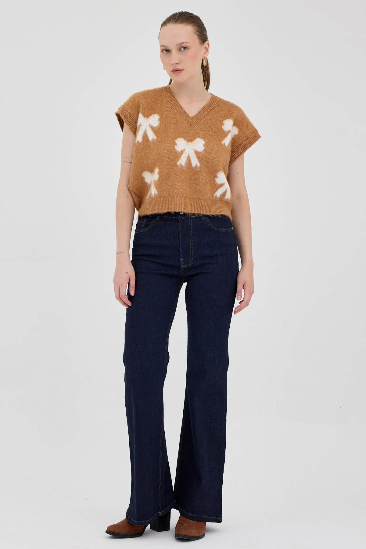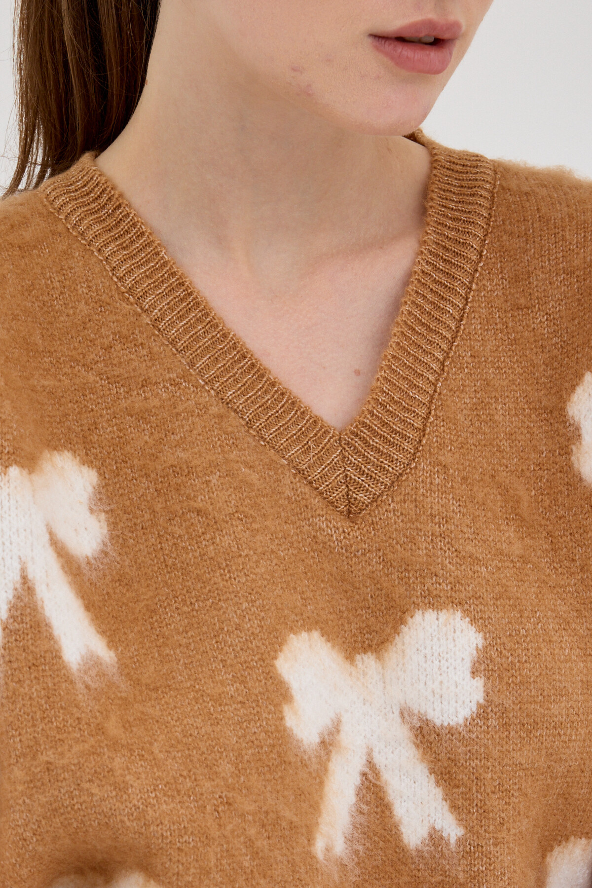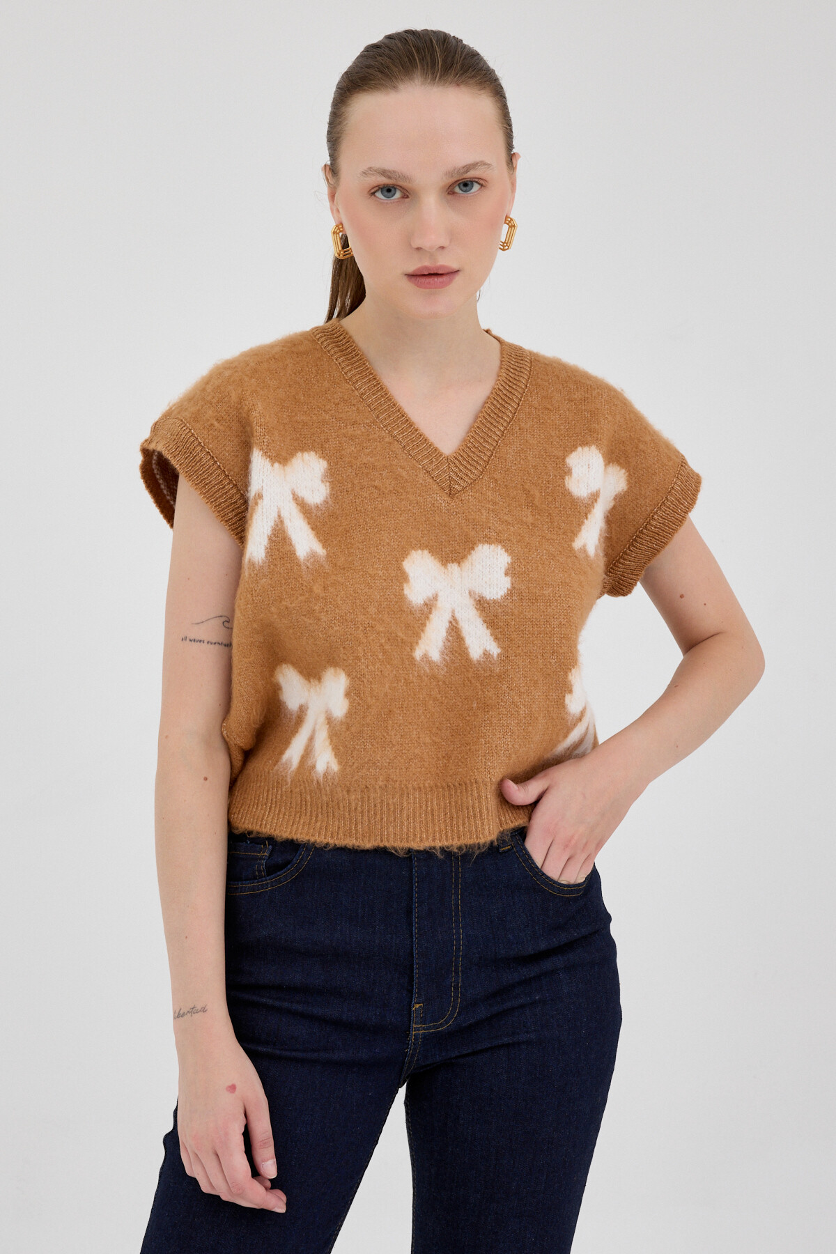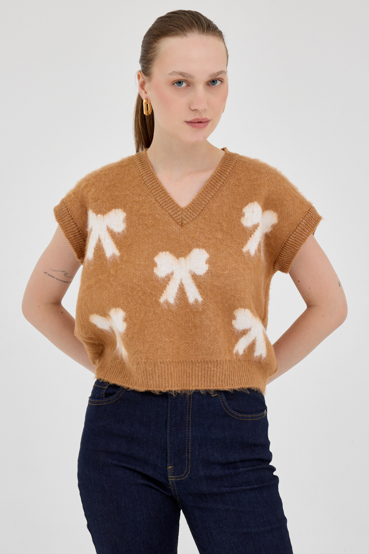 Taba V Yaka Fiyonk Desenli Kadın Süveter 2411