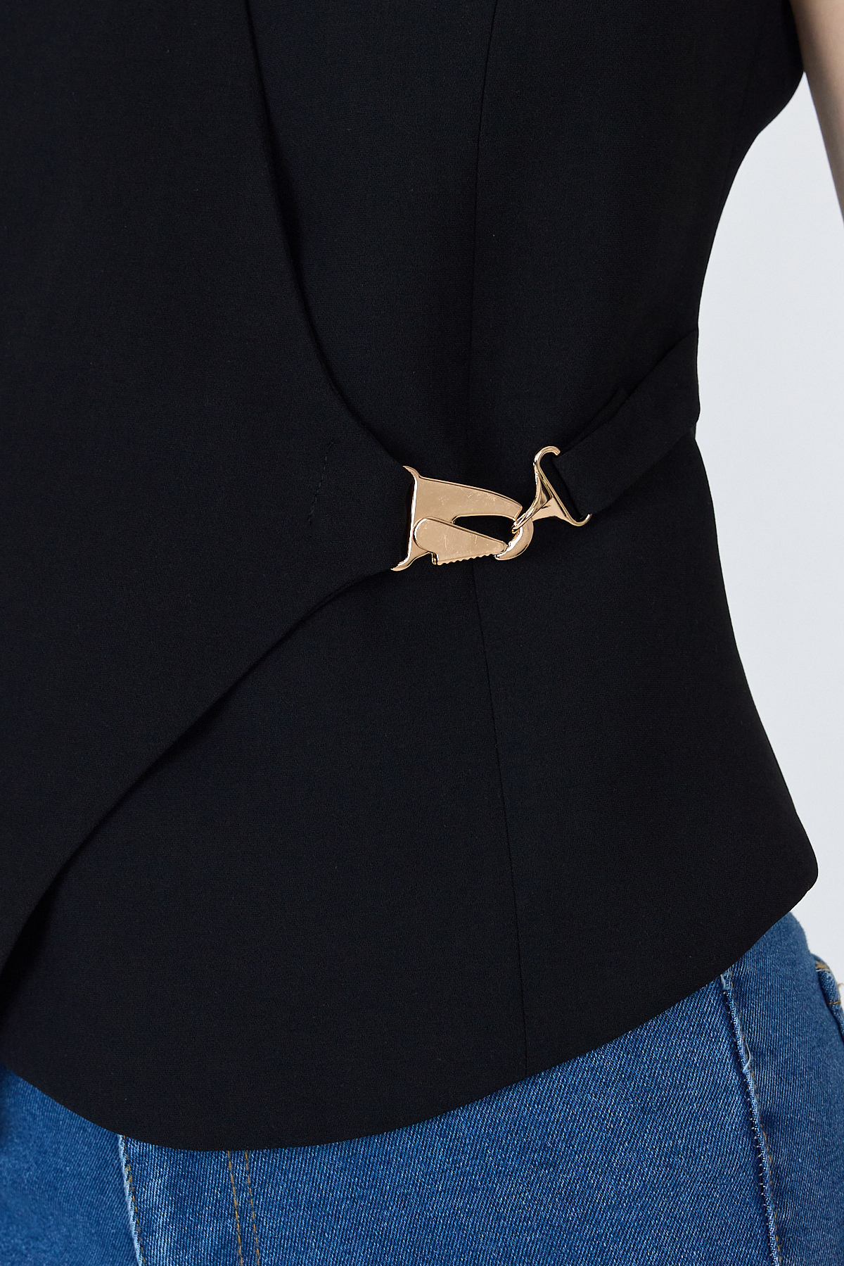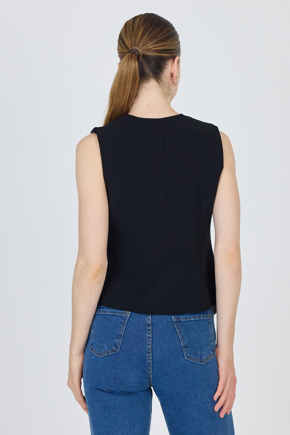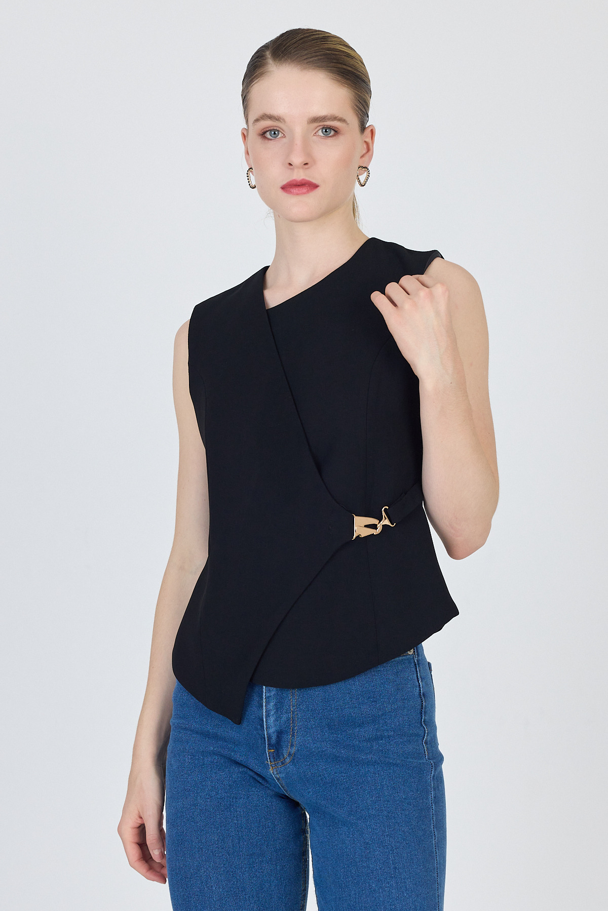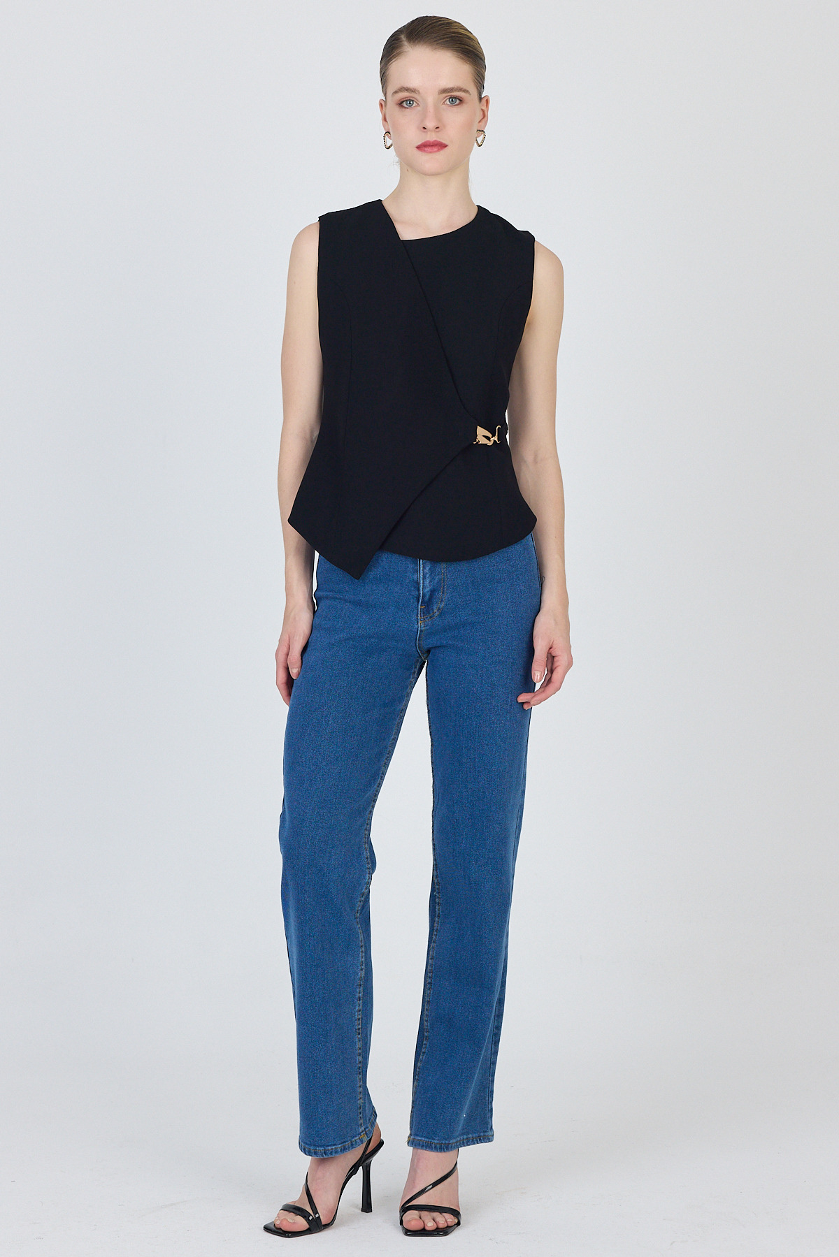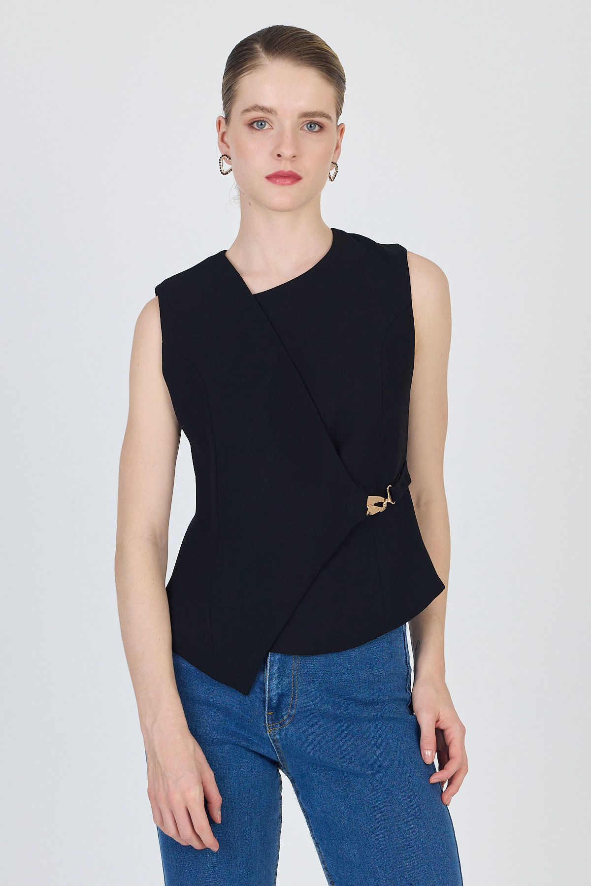 Siyah Asimetrik Kesim Toka Detaylı Kolsuz Bluz 241448