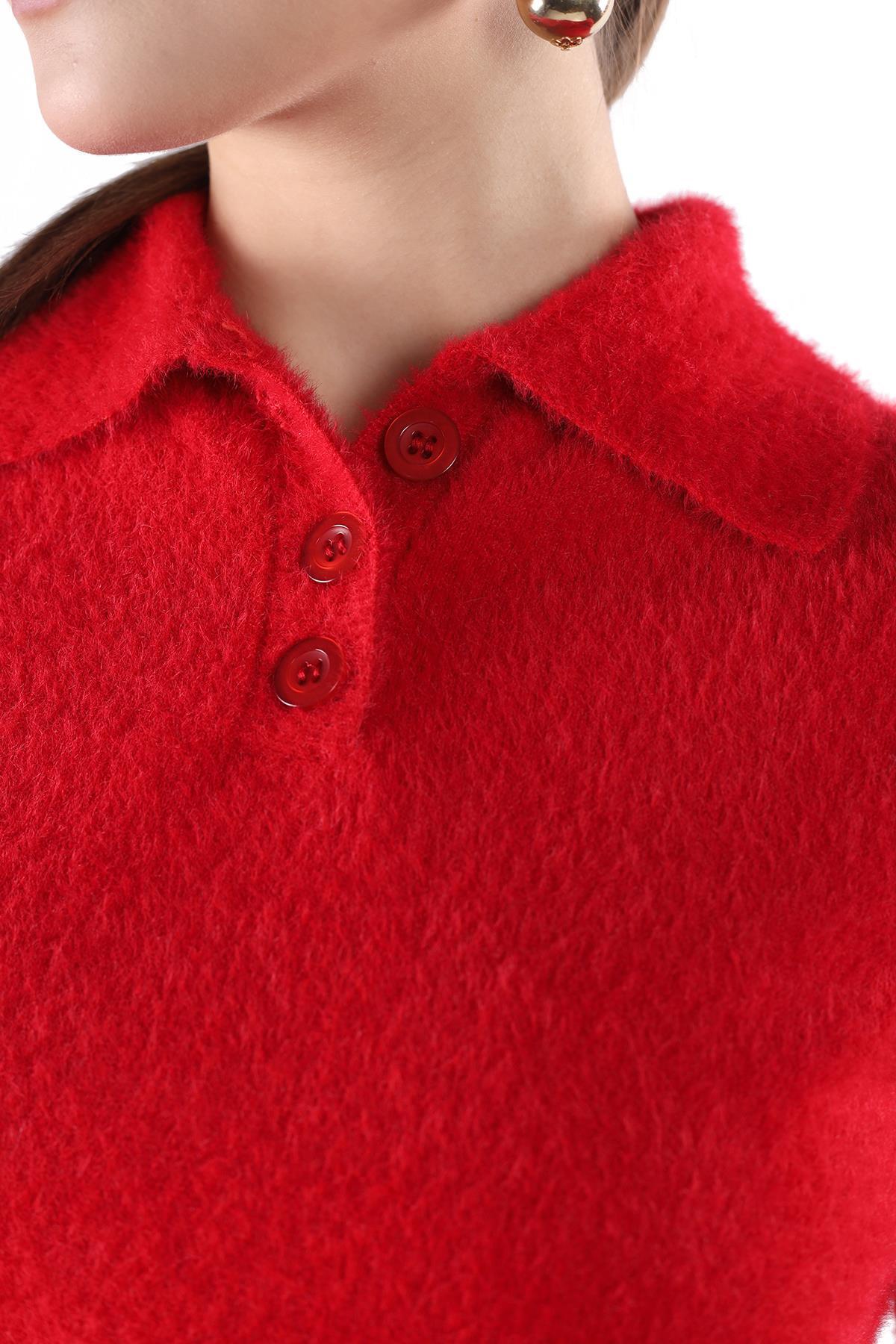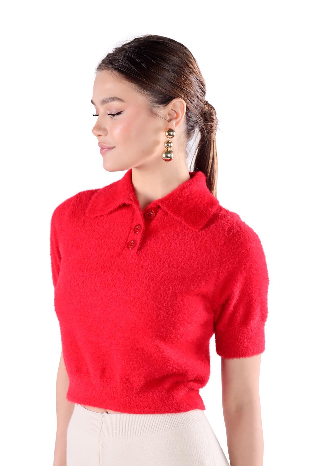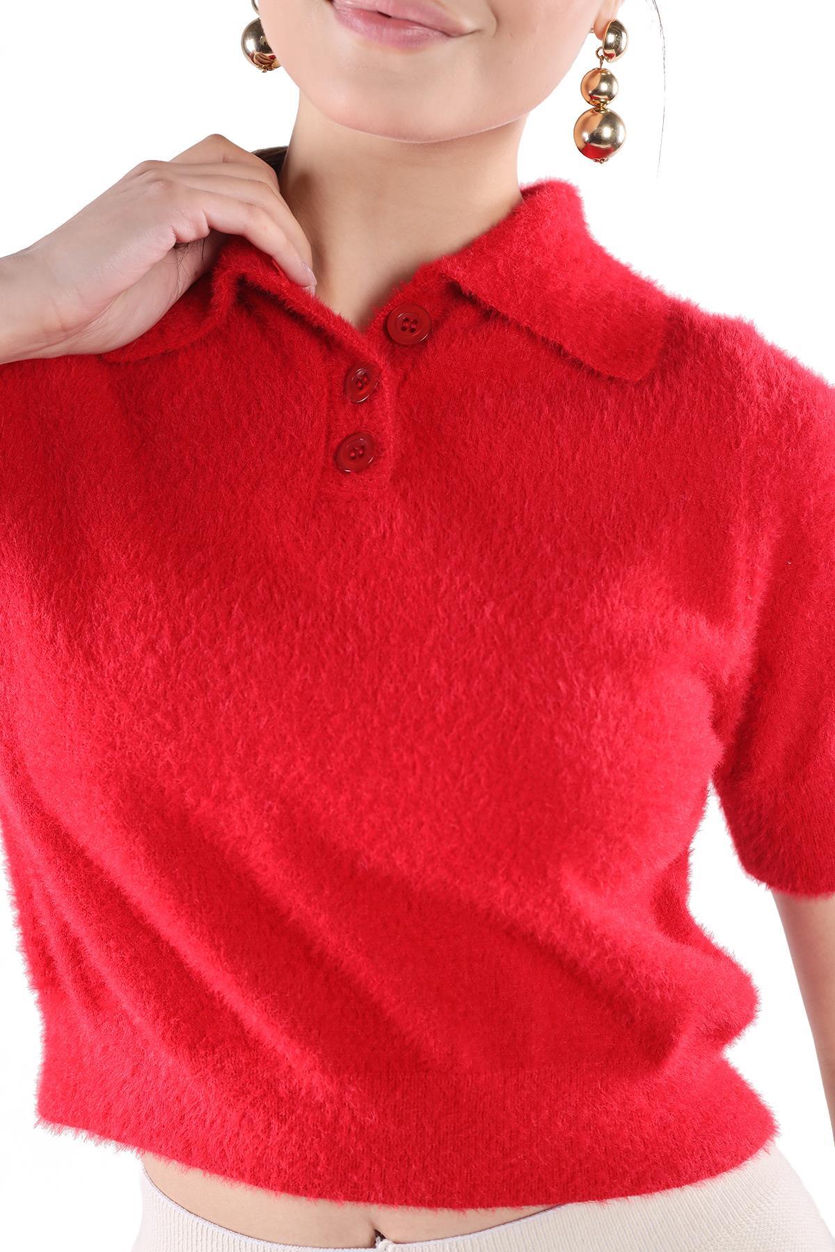 Kırmızı Yaka Düğme Detay Kısa Kol Kazak 24154