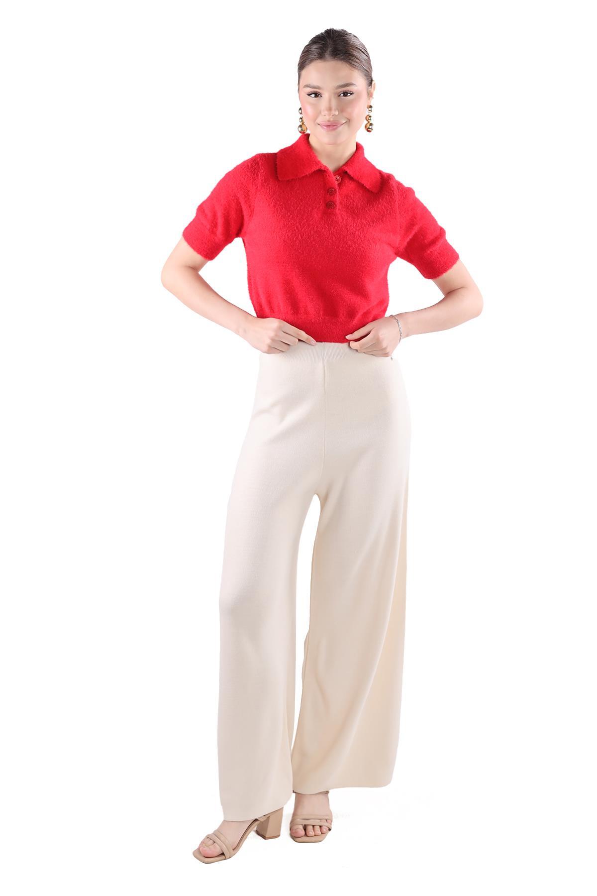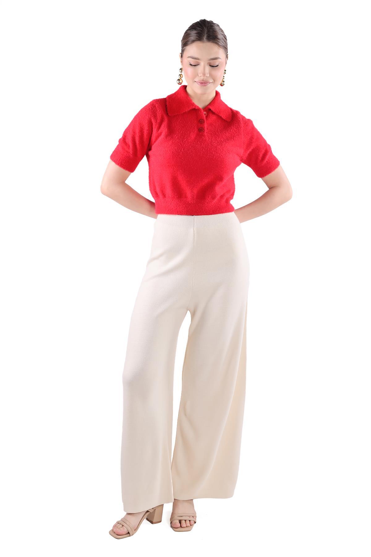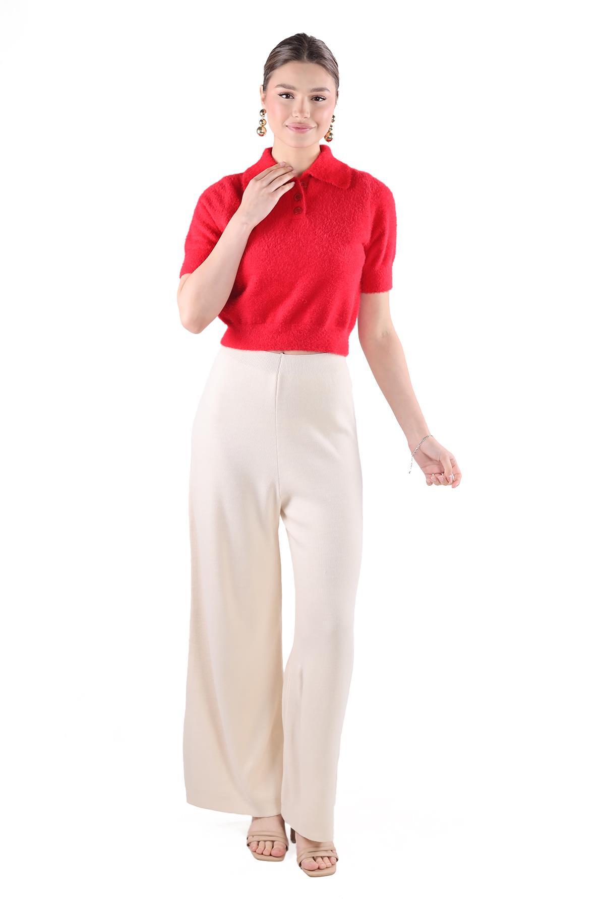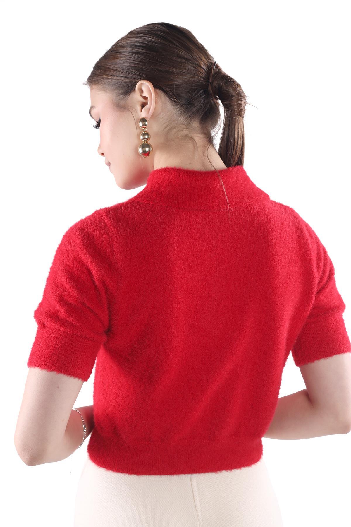 Kırmızı Yaka Düğme Detay Kısa Kol Kazak 24154