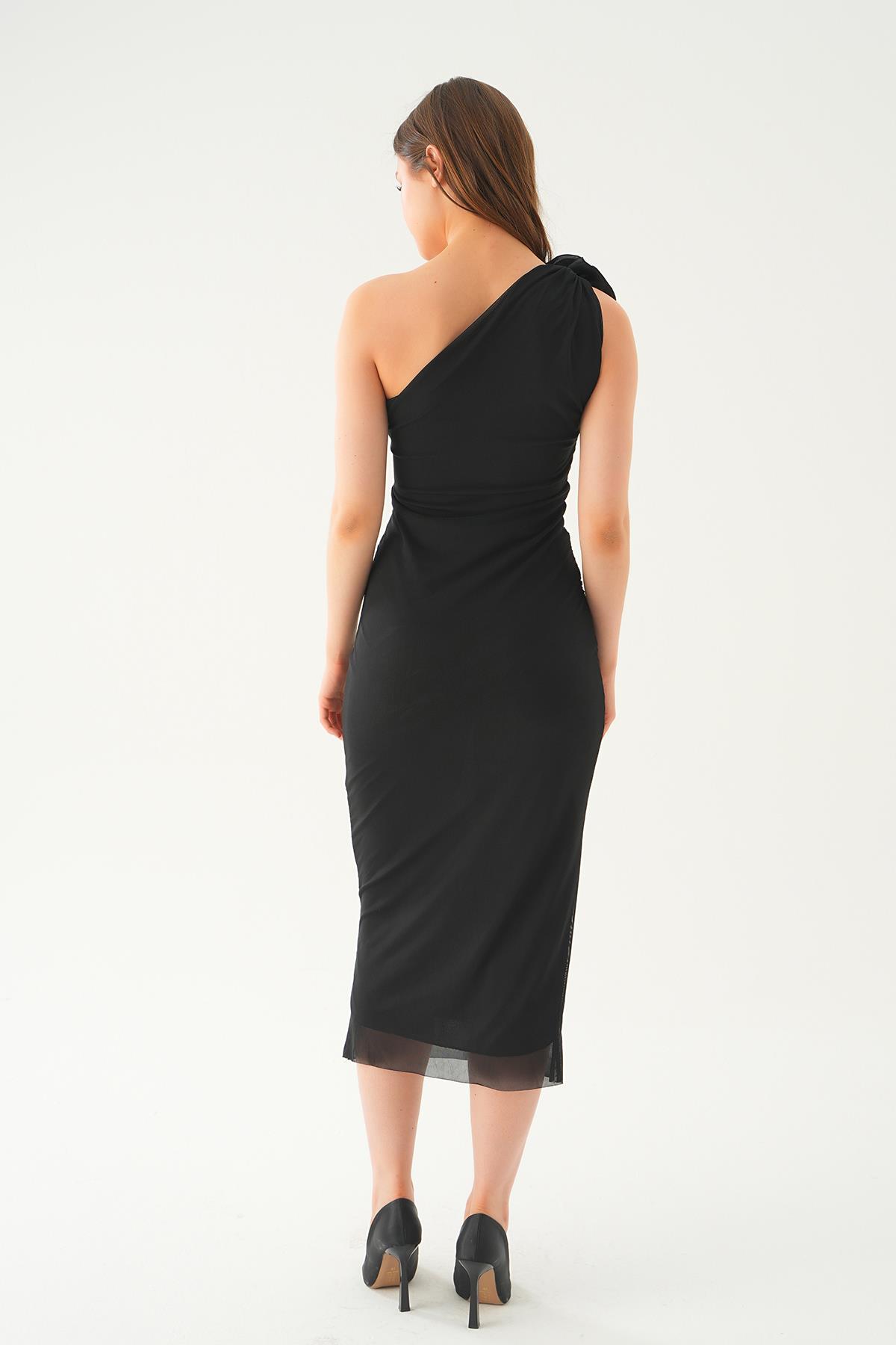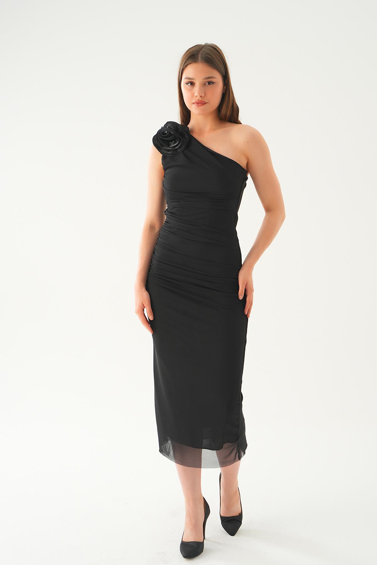 Siyah Tek Omuz Gül Detay Elbise 241682