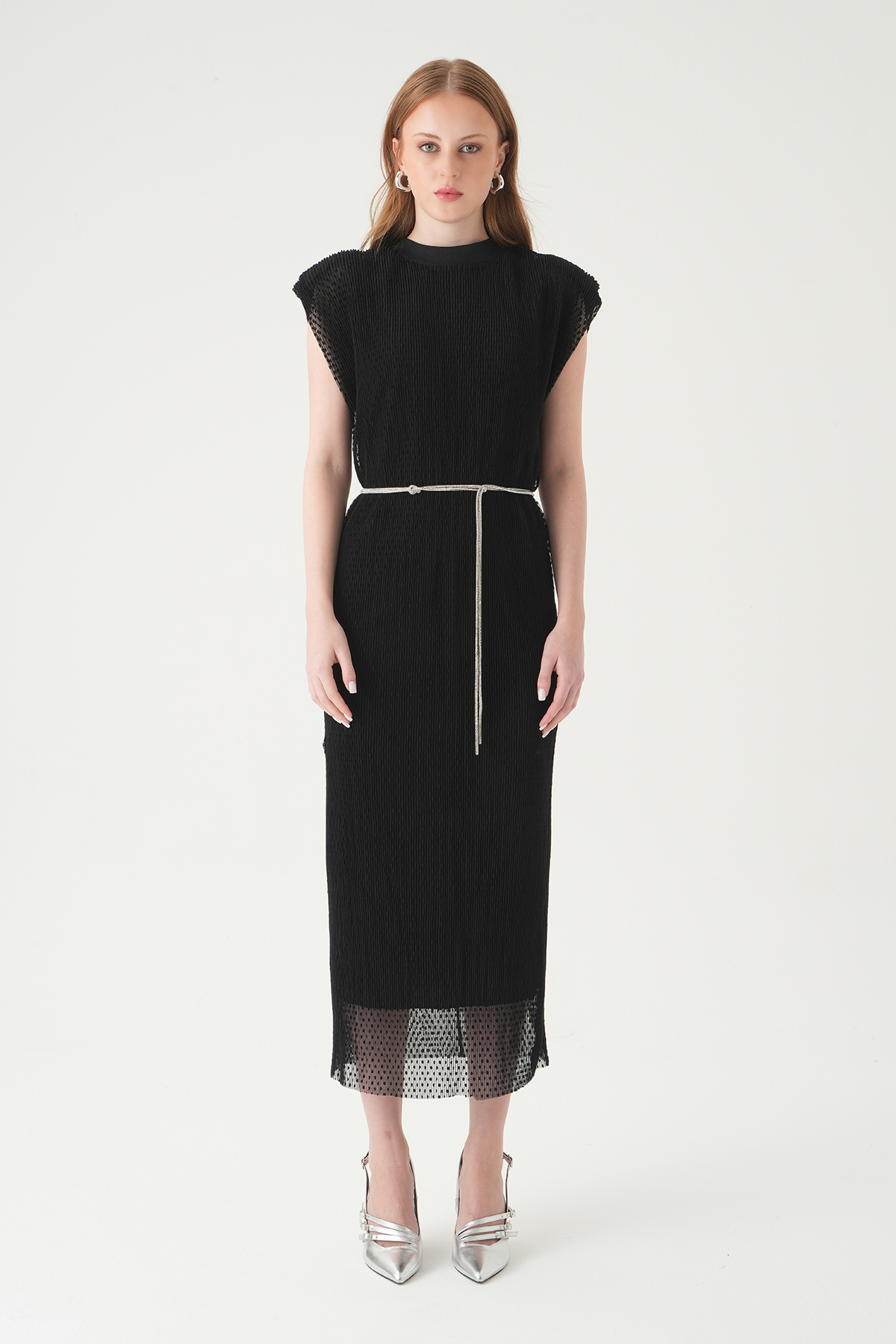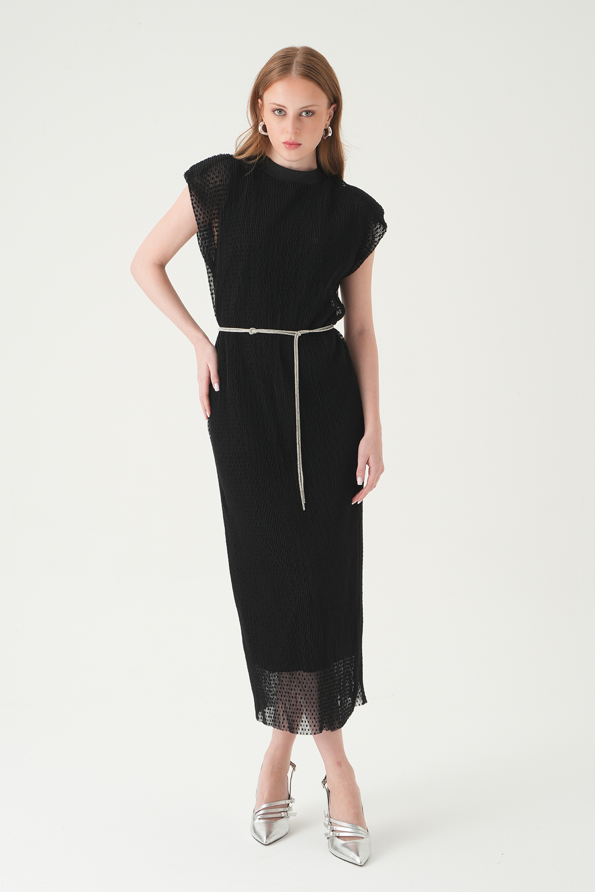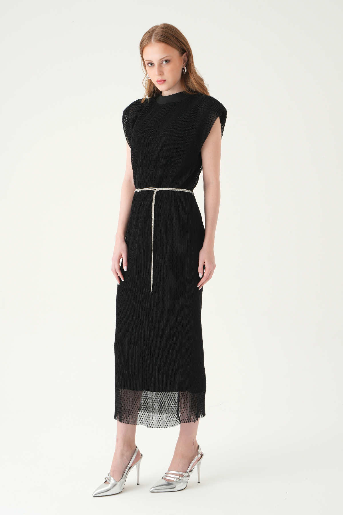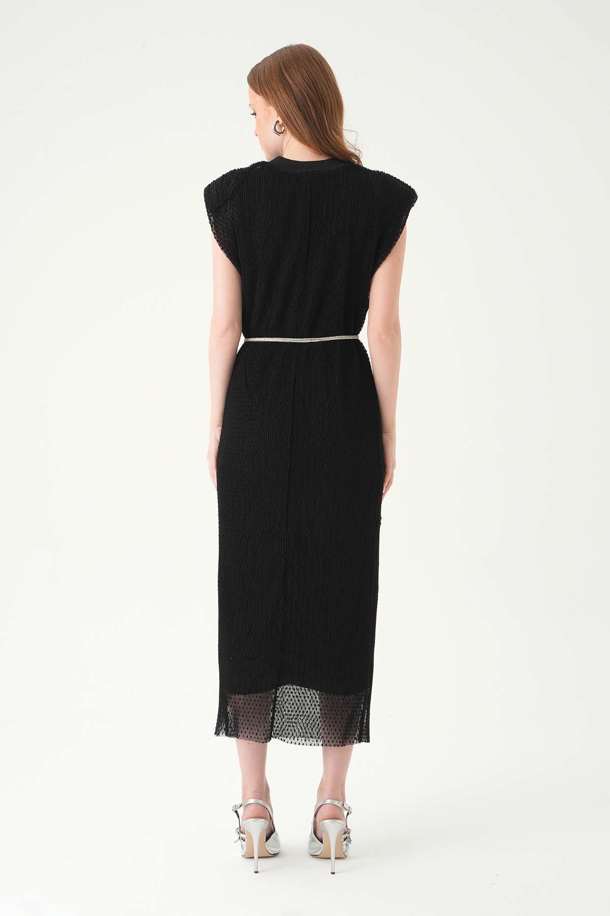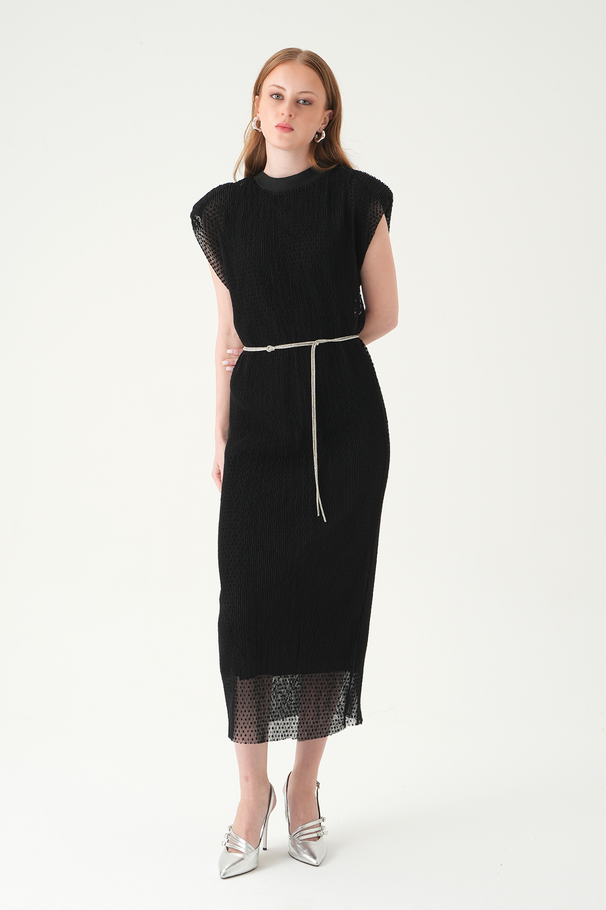 Siyah Vatkalı Bel Bağlamalı Elbise 241688