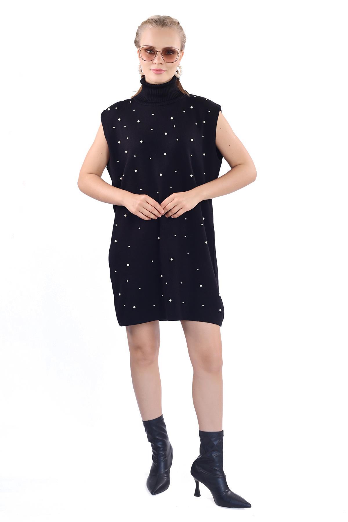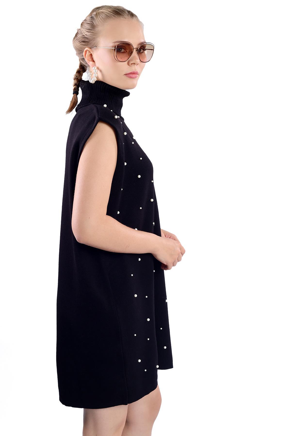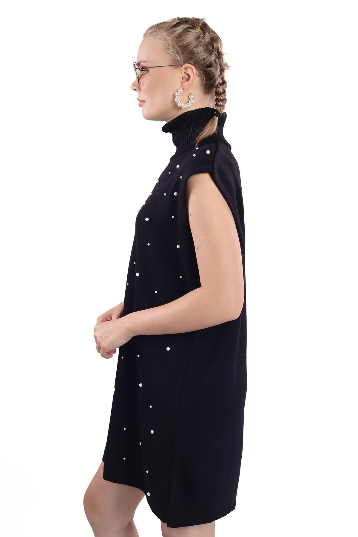 24202 İnci Detay Balıkçı Yaka Elbise Siyah