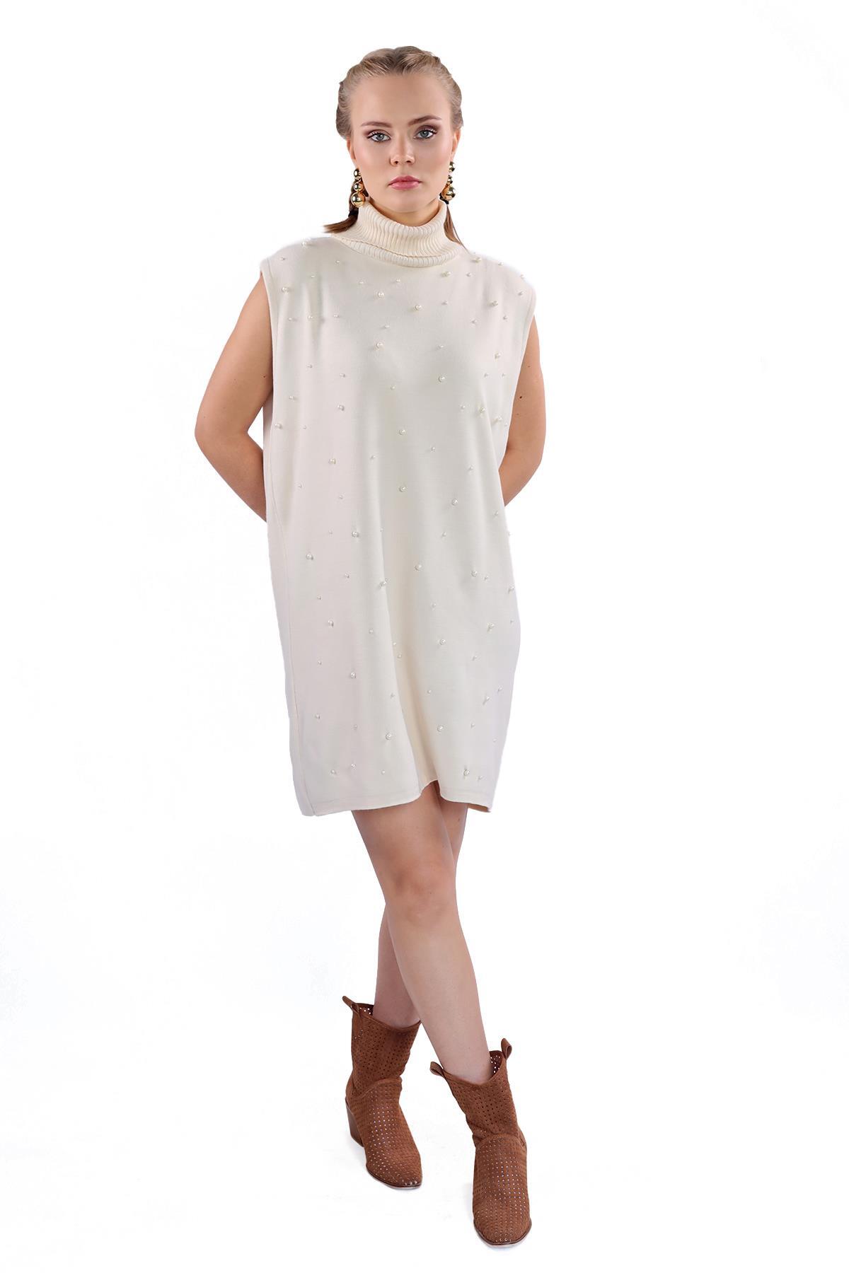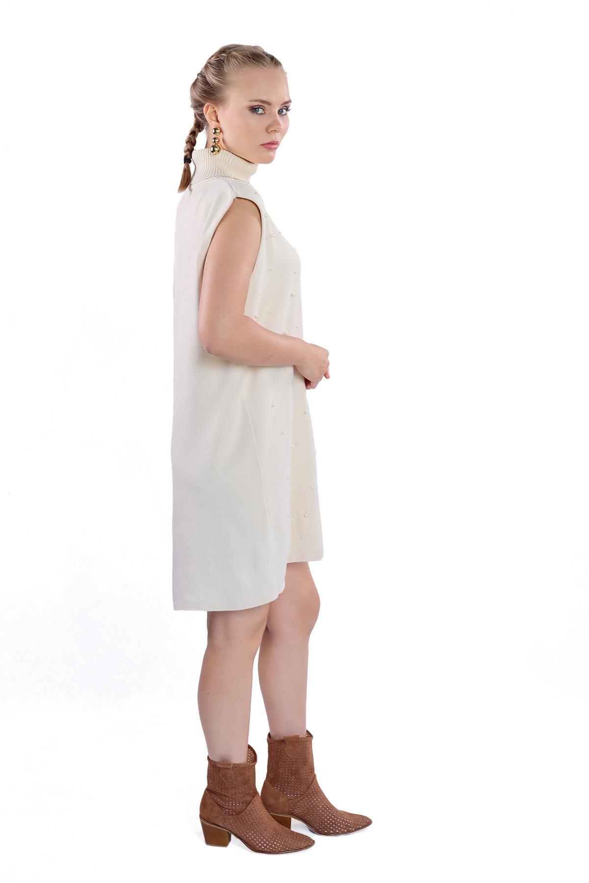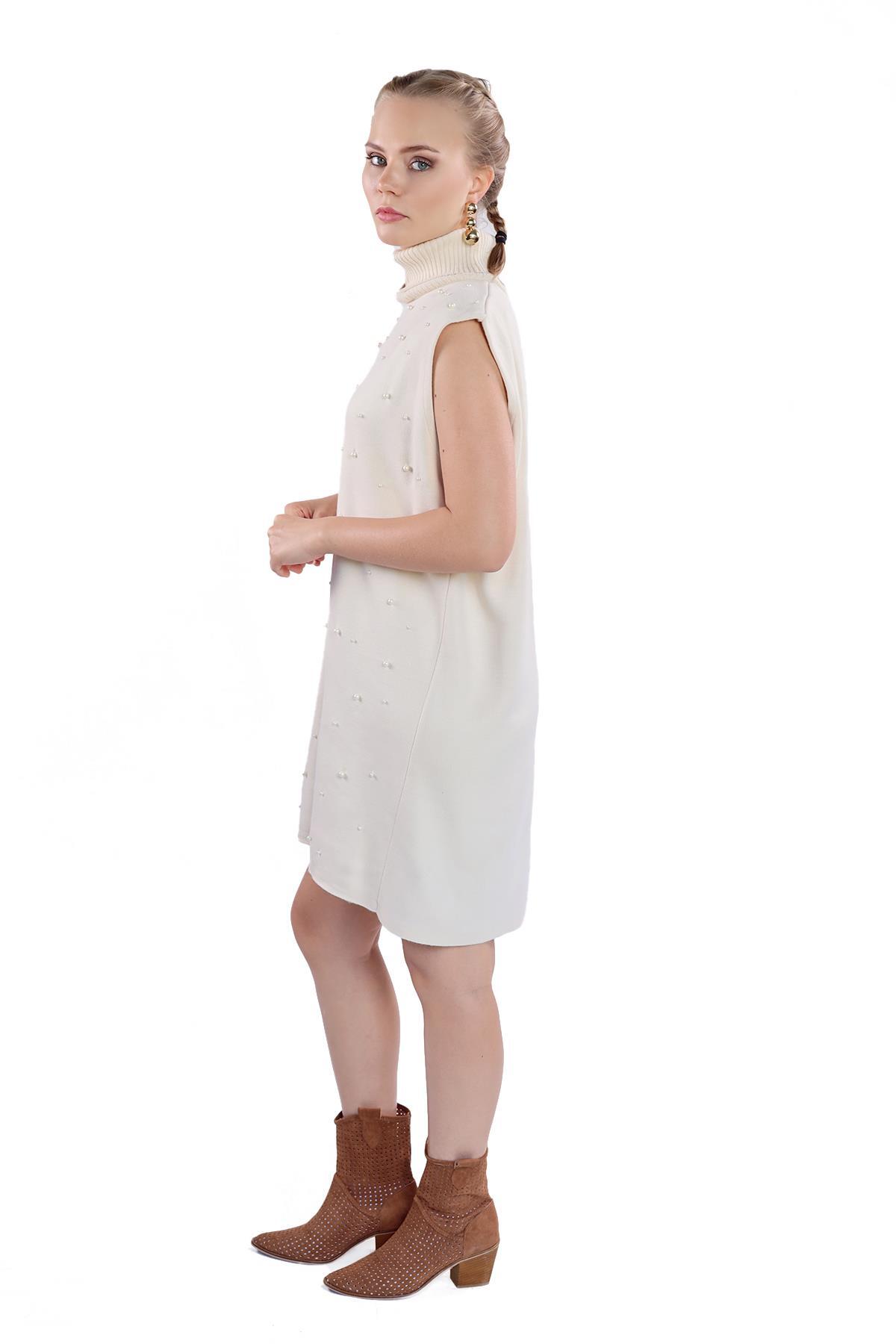 24202 İnci Detay Balıkçı Yaka Elbise Taş