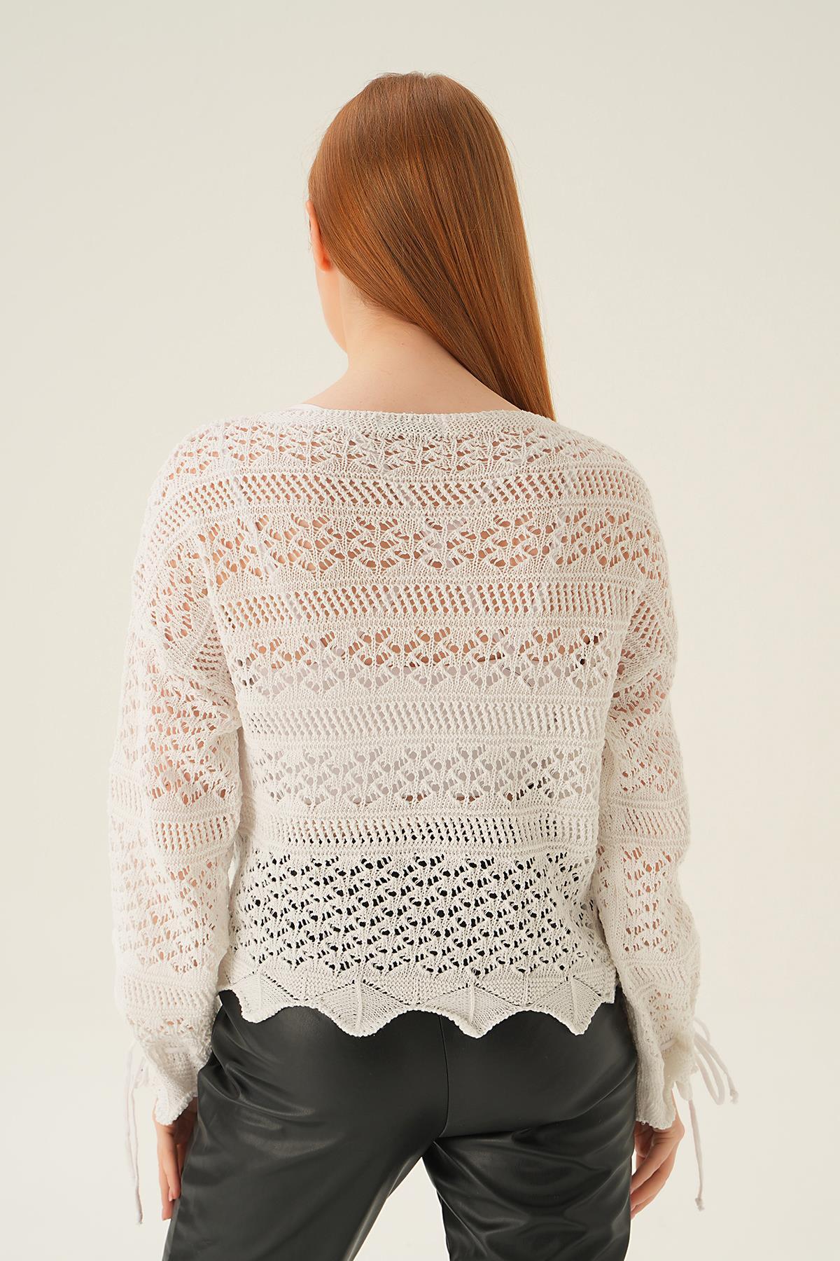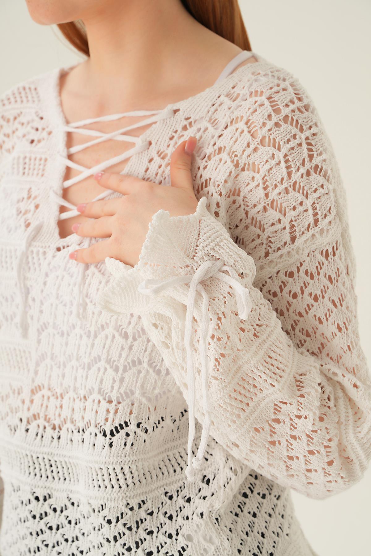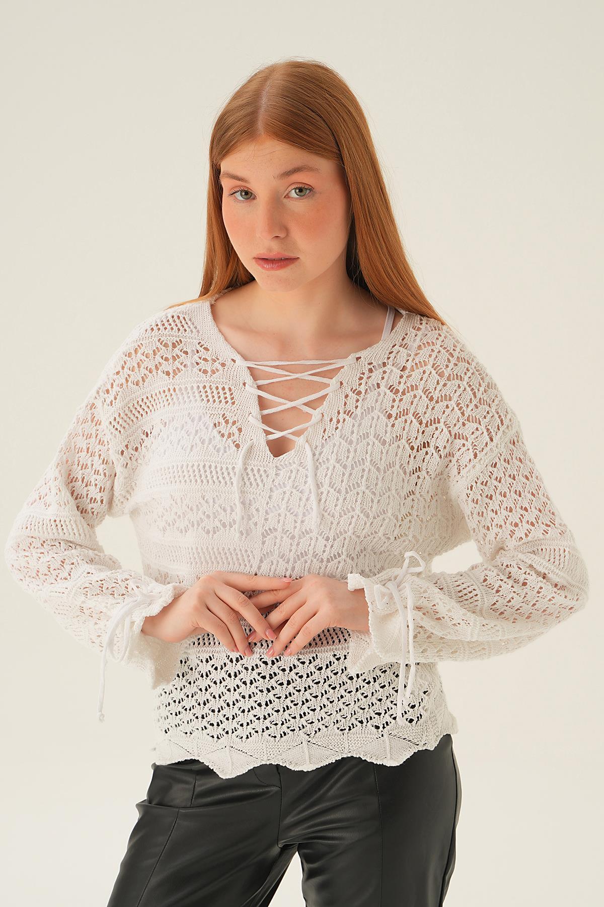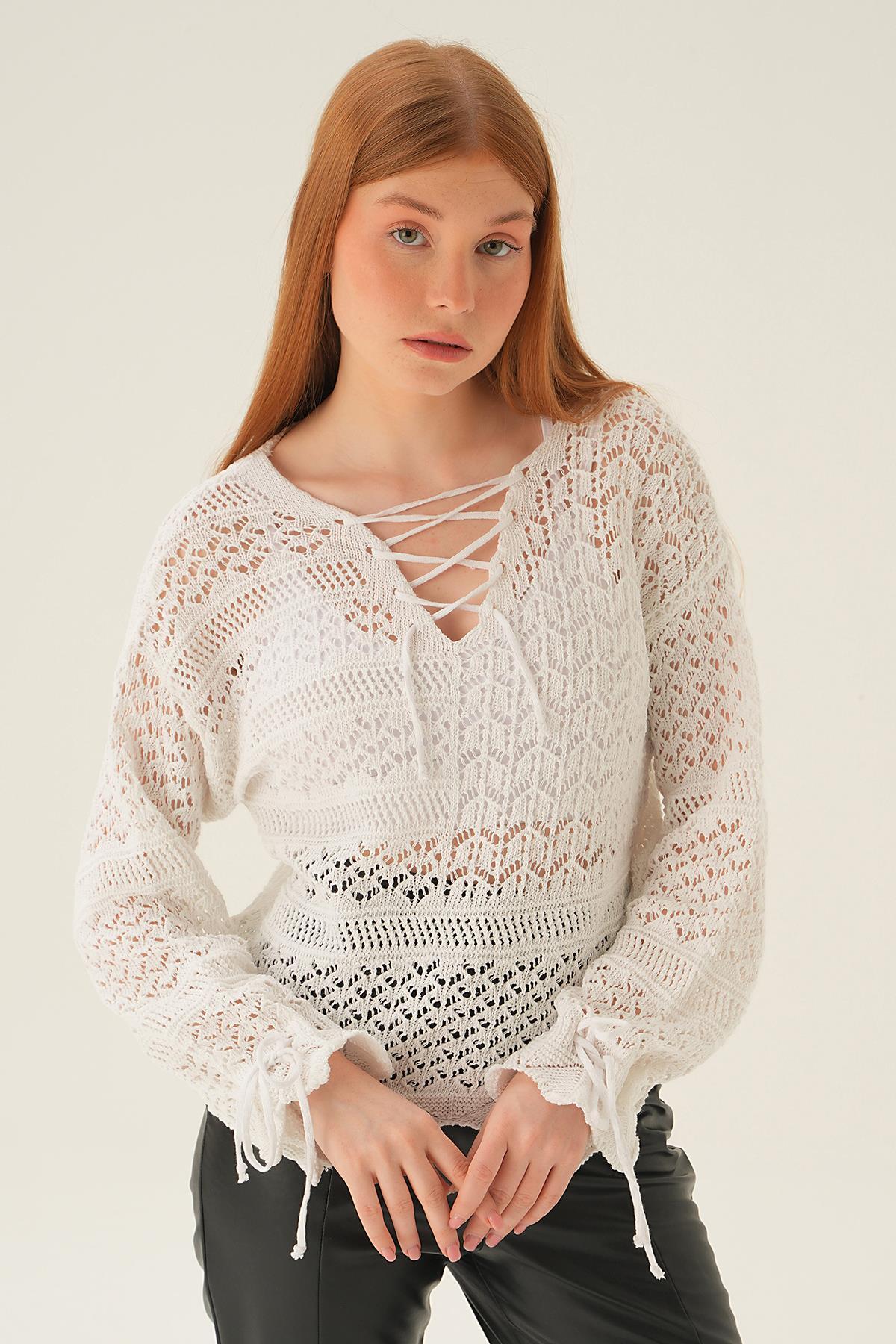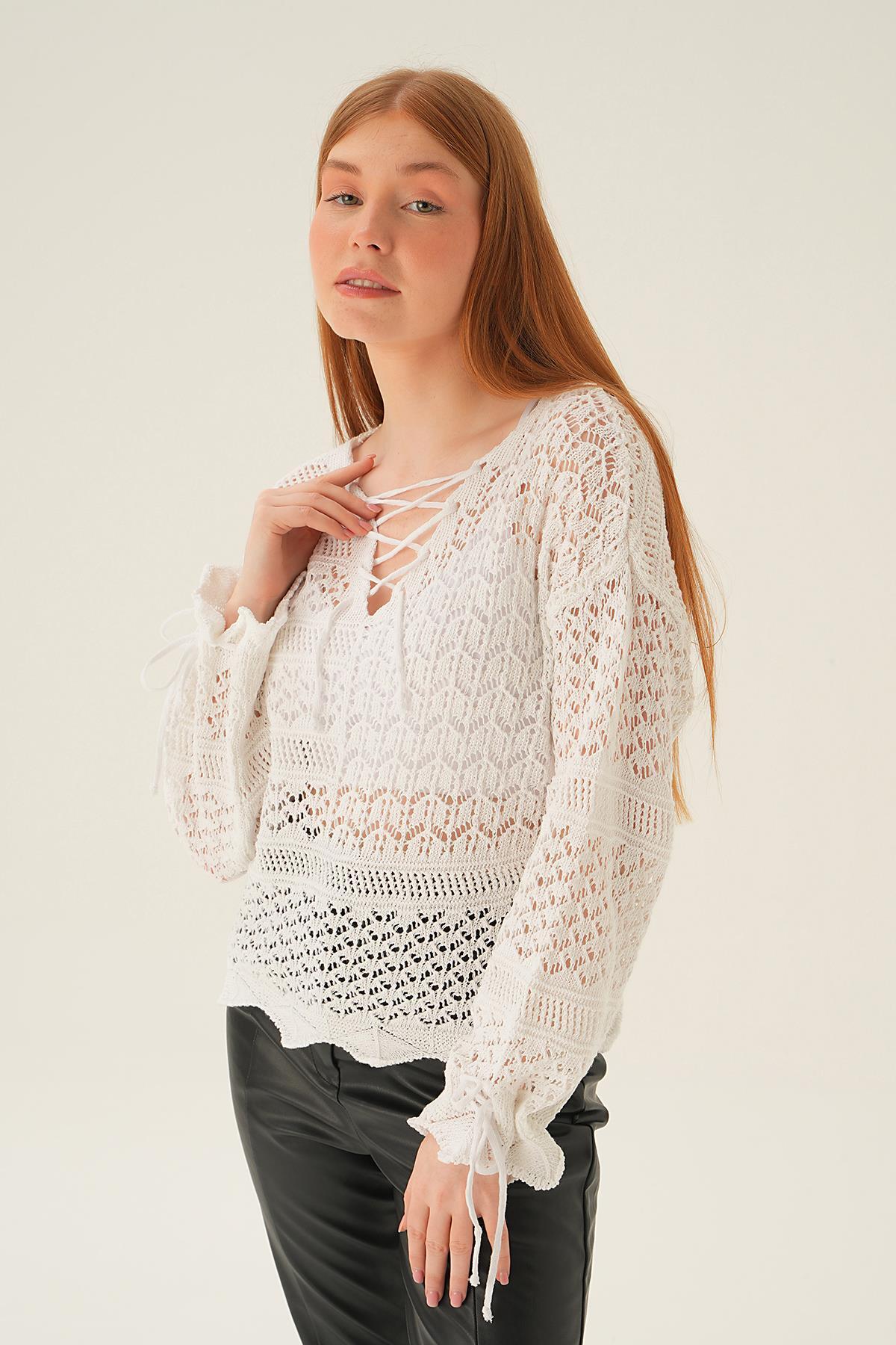 Beyaz Bağcık Detay Ajurlu Bluz 2421
