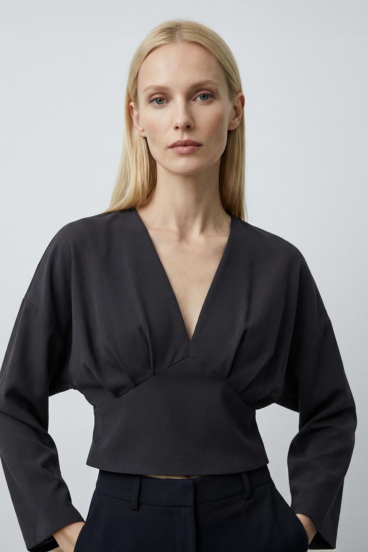 242218 V Yaka Uzun Kol Bluz Siyah