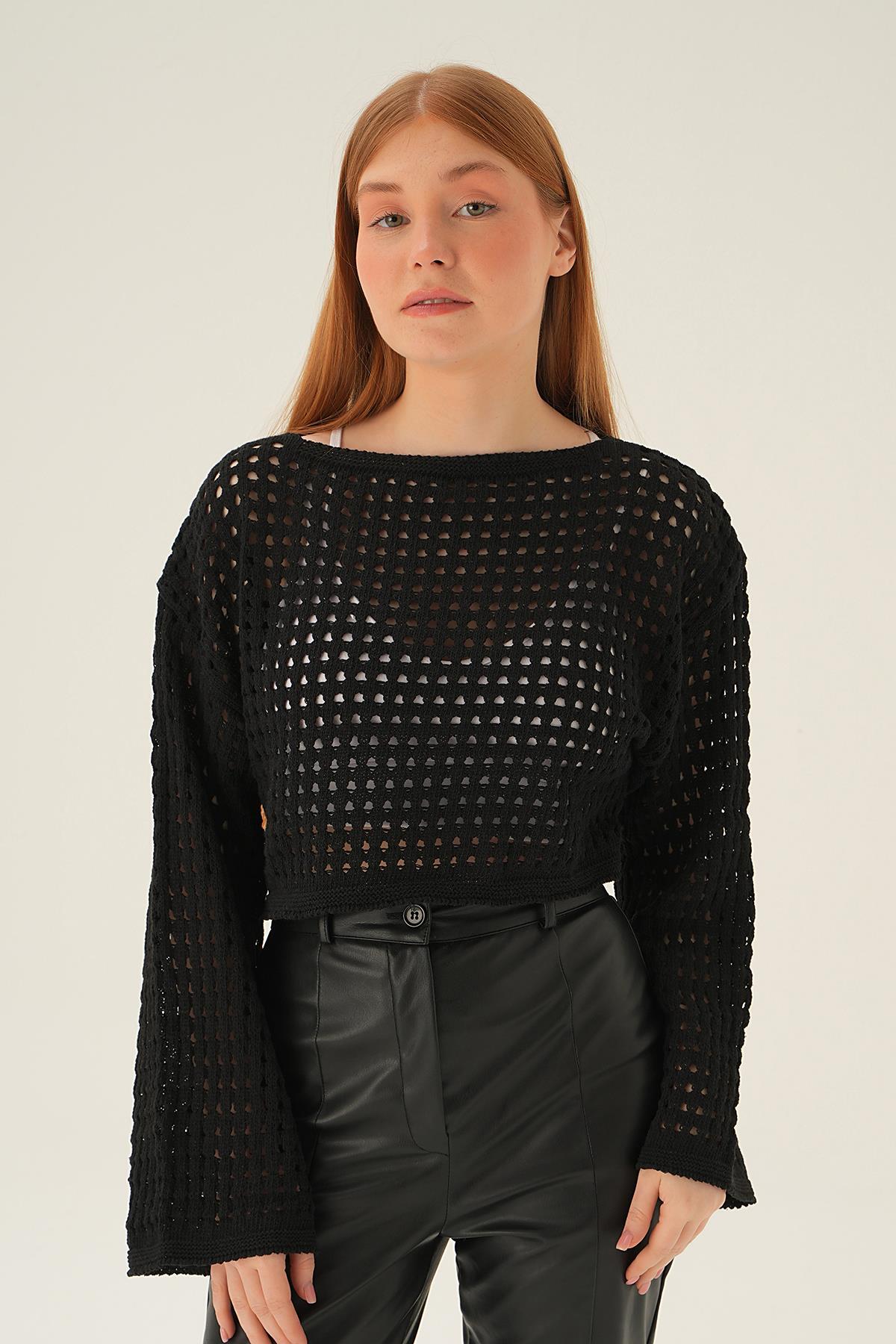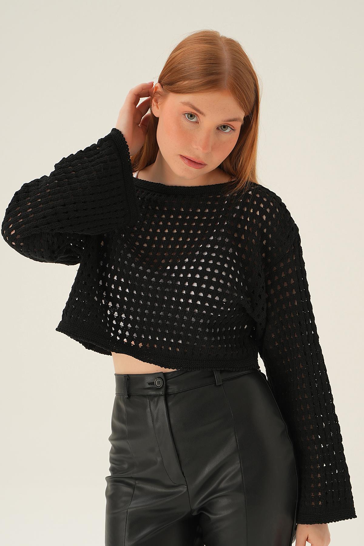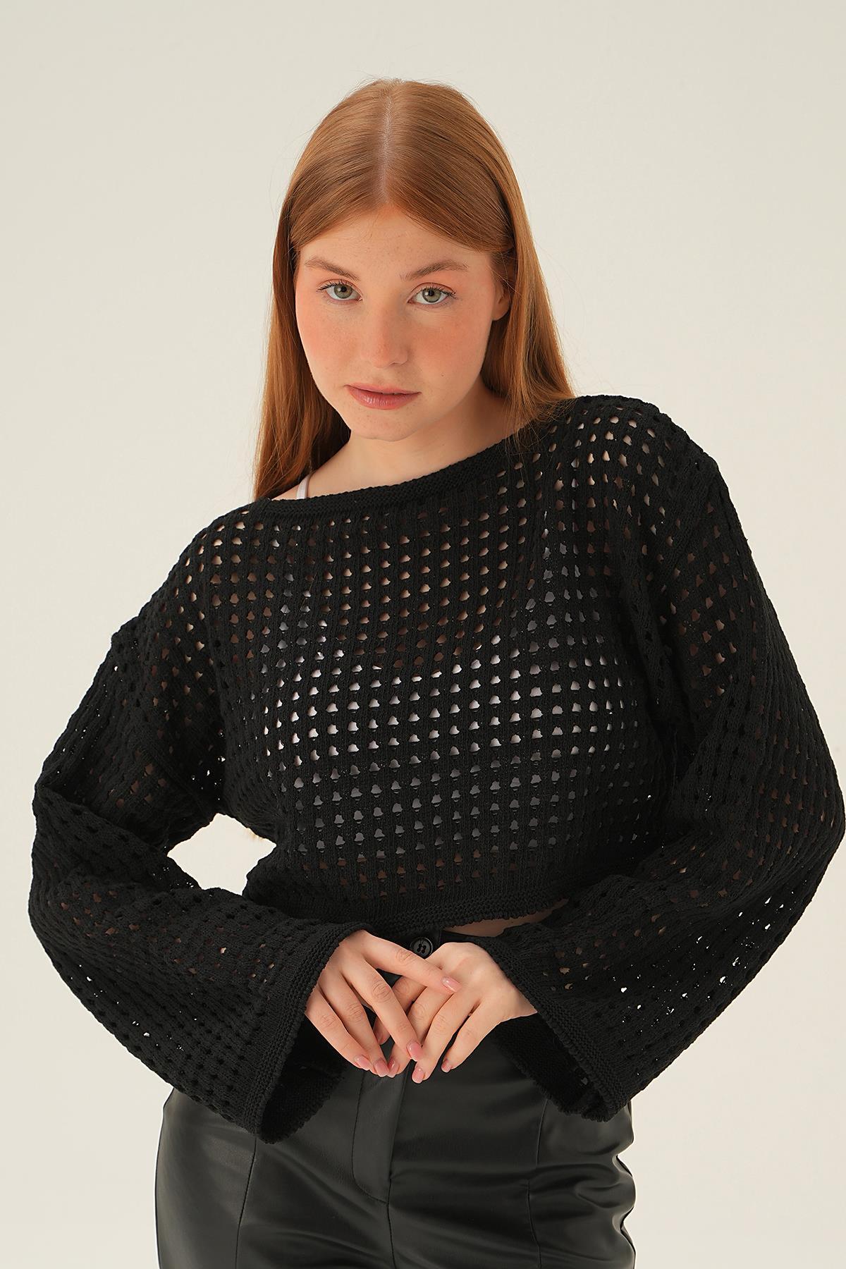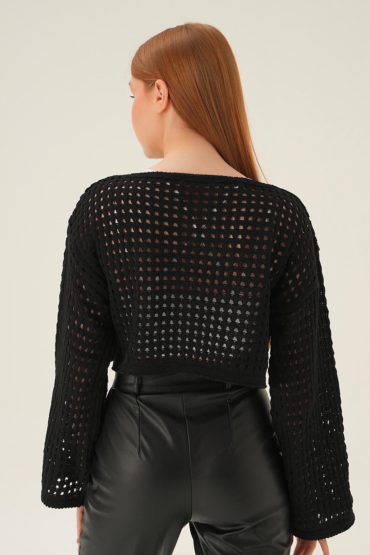 Siyah Bisiklet Yaka Uzun Kol Düğmeli Bluz 8492A