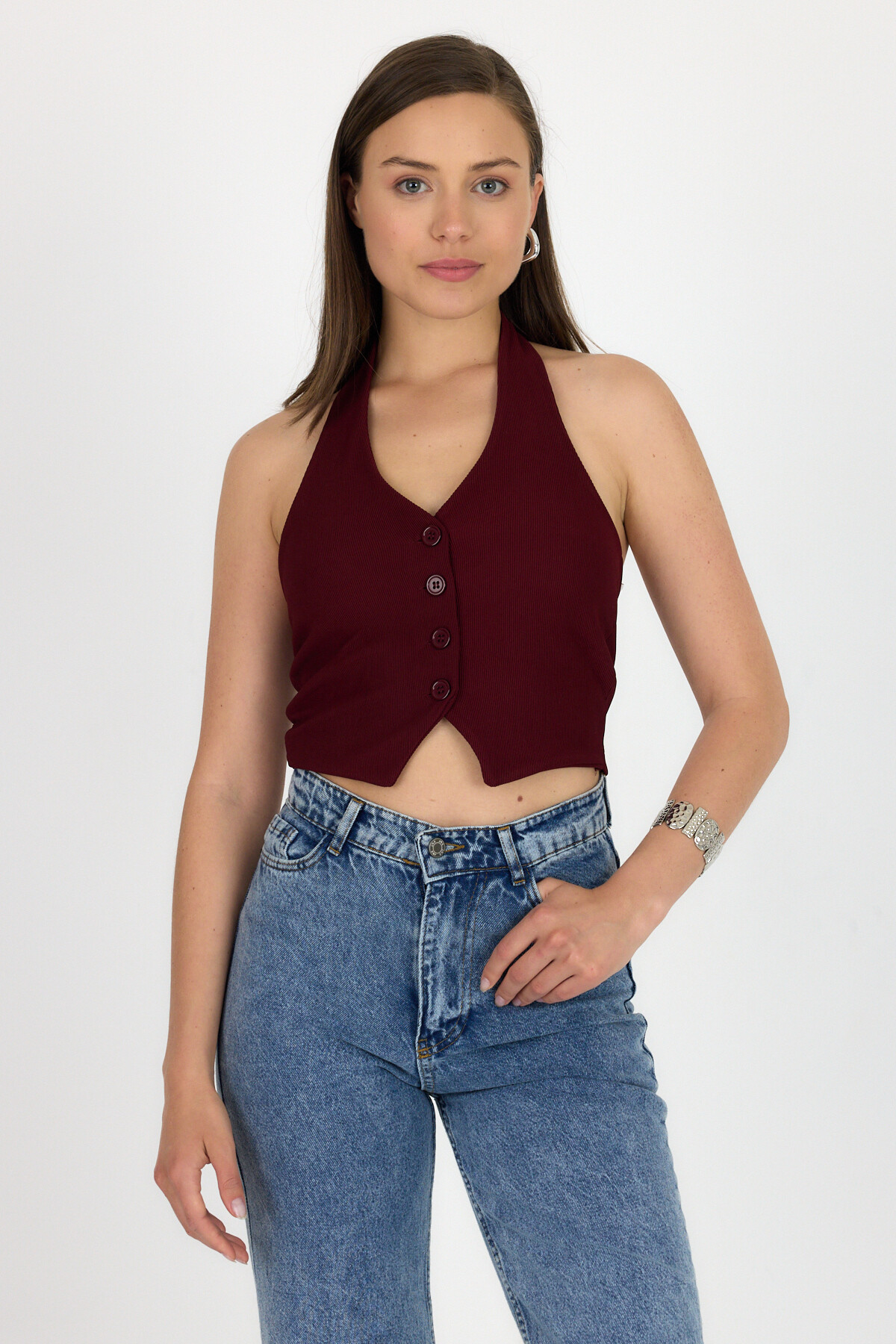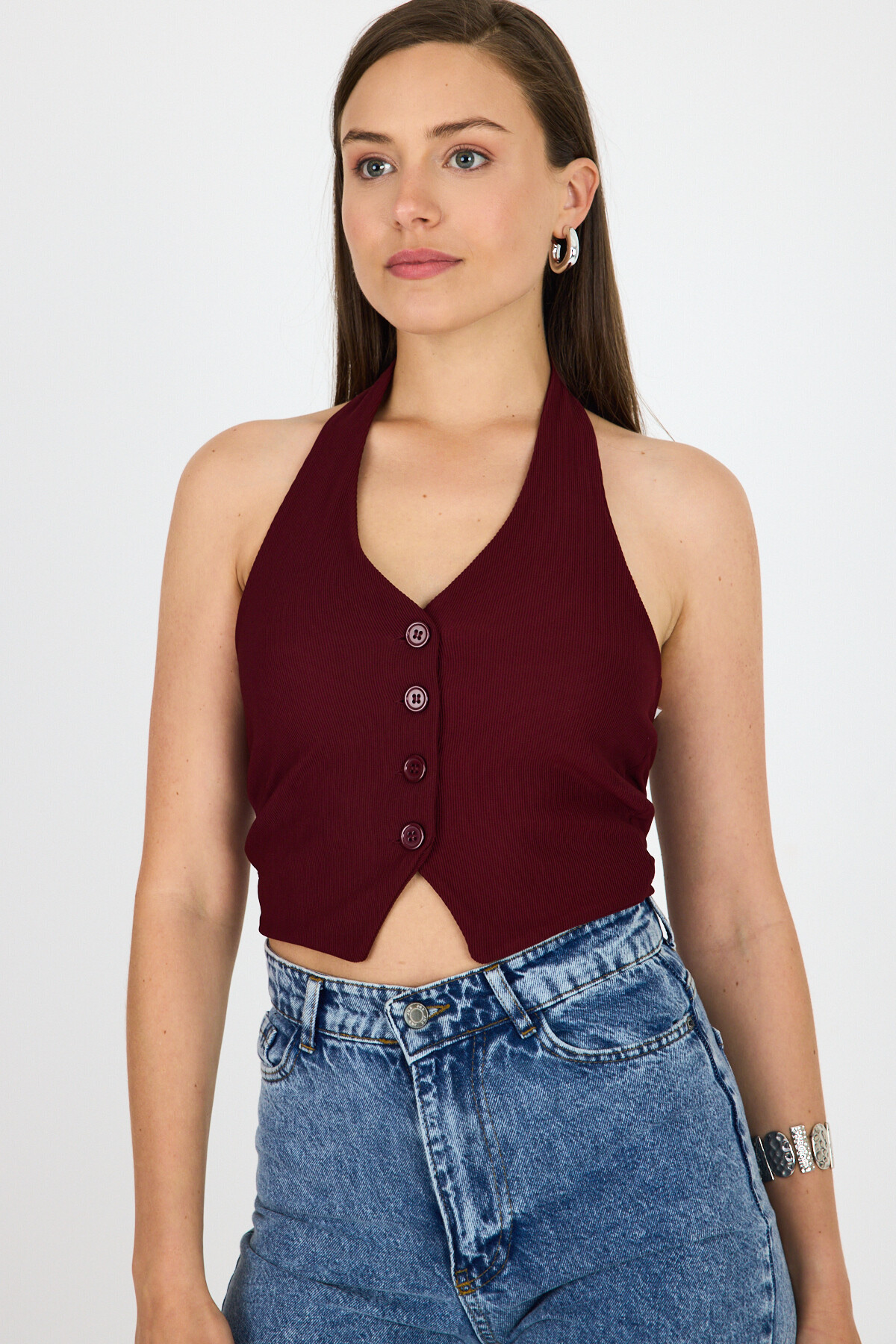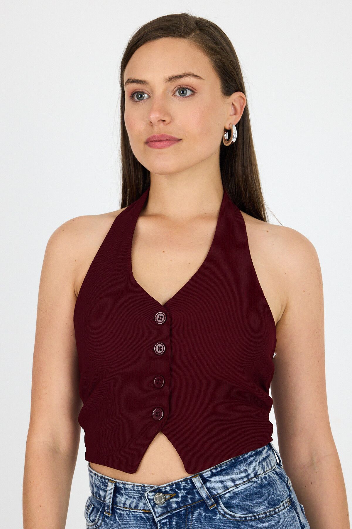 Bordo Boyundan Geçmeli Düğme Detaylı Yelek 2425