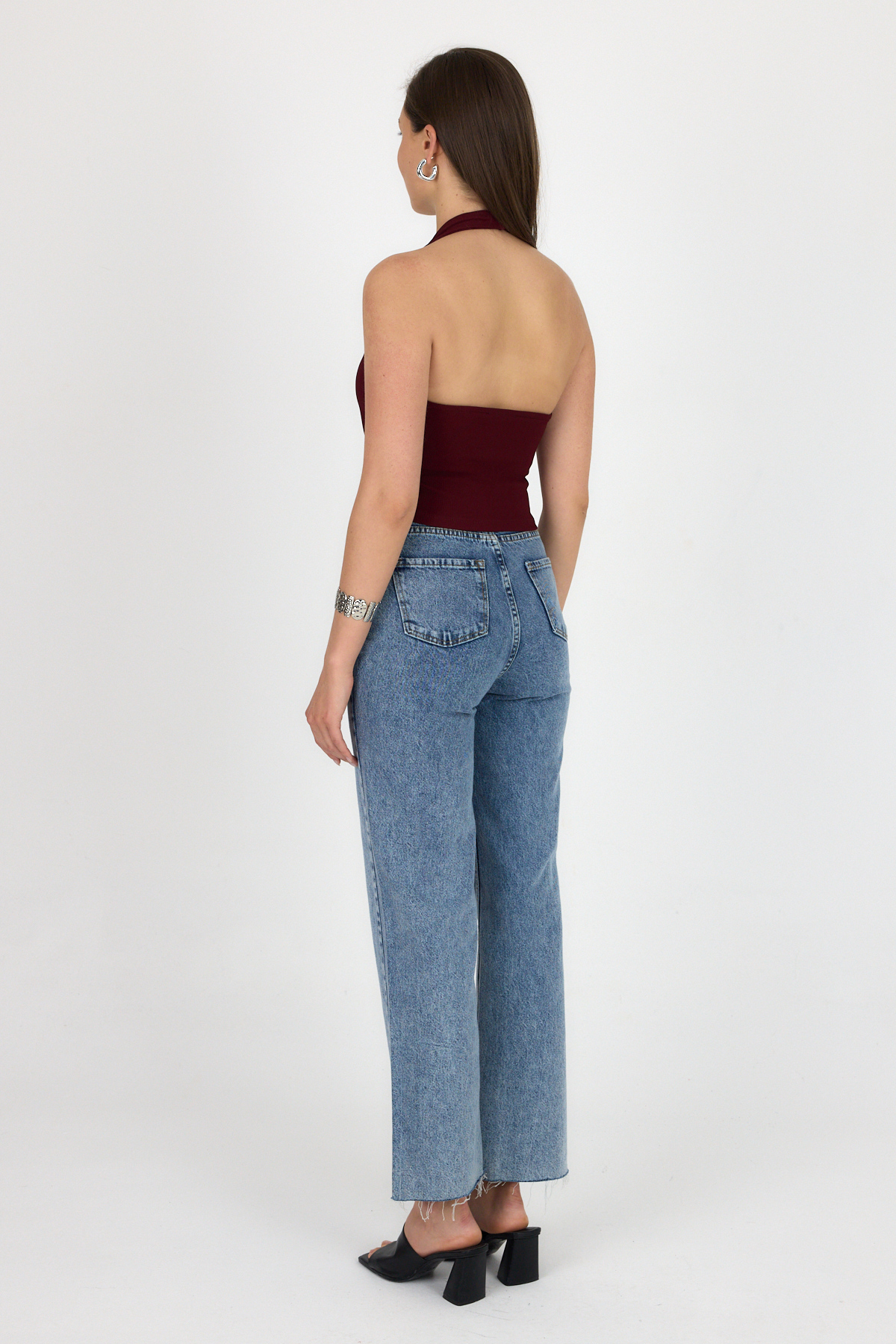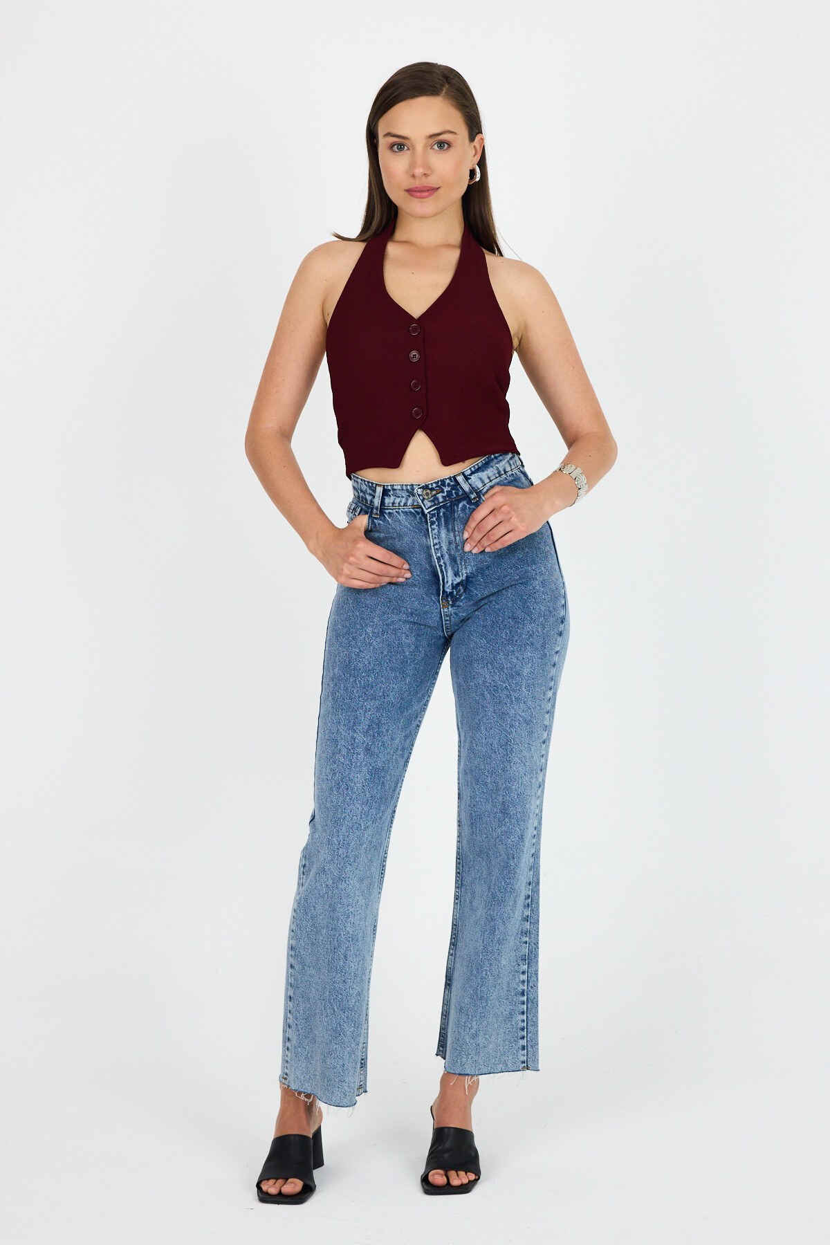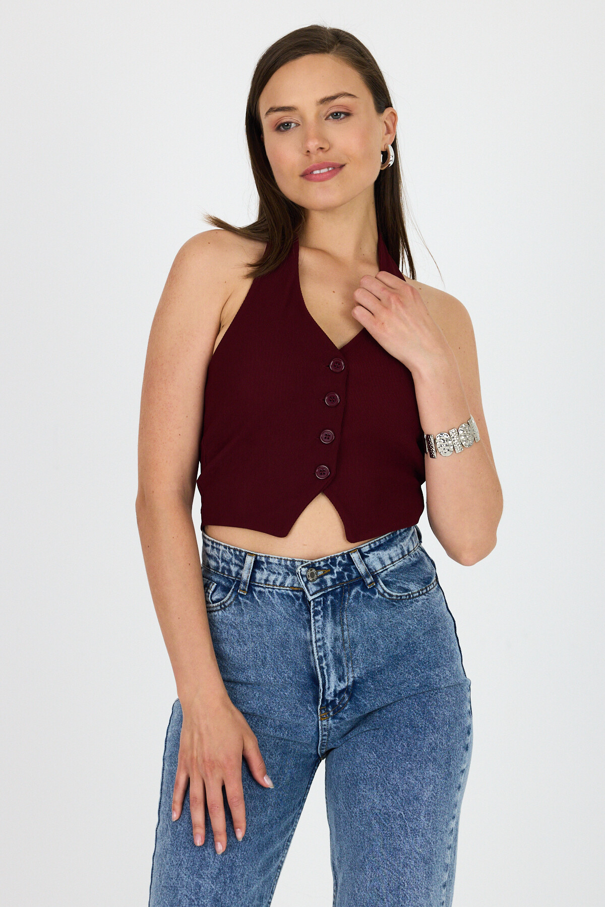 Bordo Boyundan Geçmeli Düğme Detaylı Yelek 2425