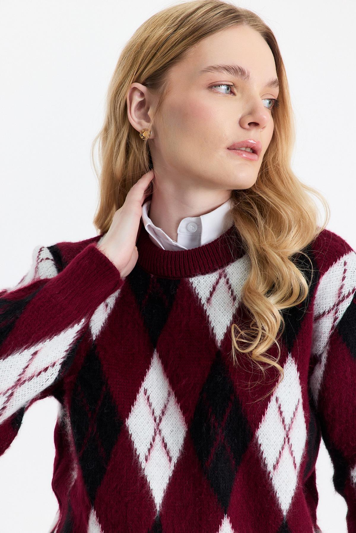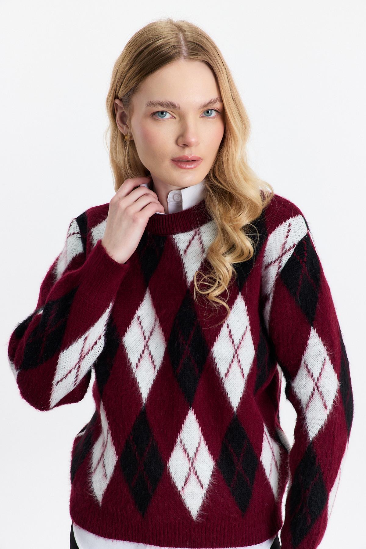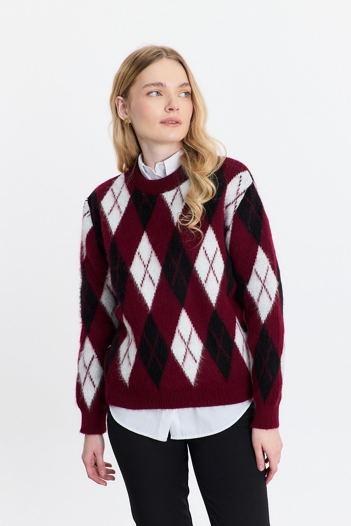Bordo Baklava Desen Şardonlu Kazak 24376