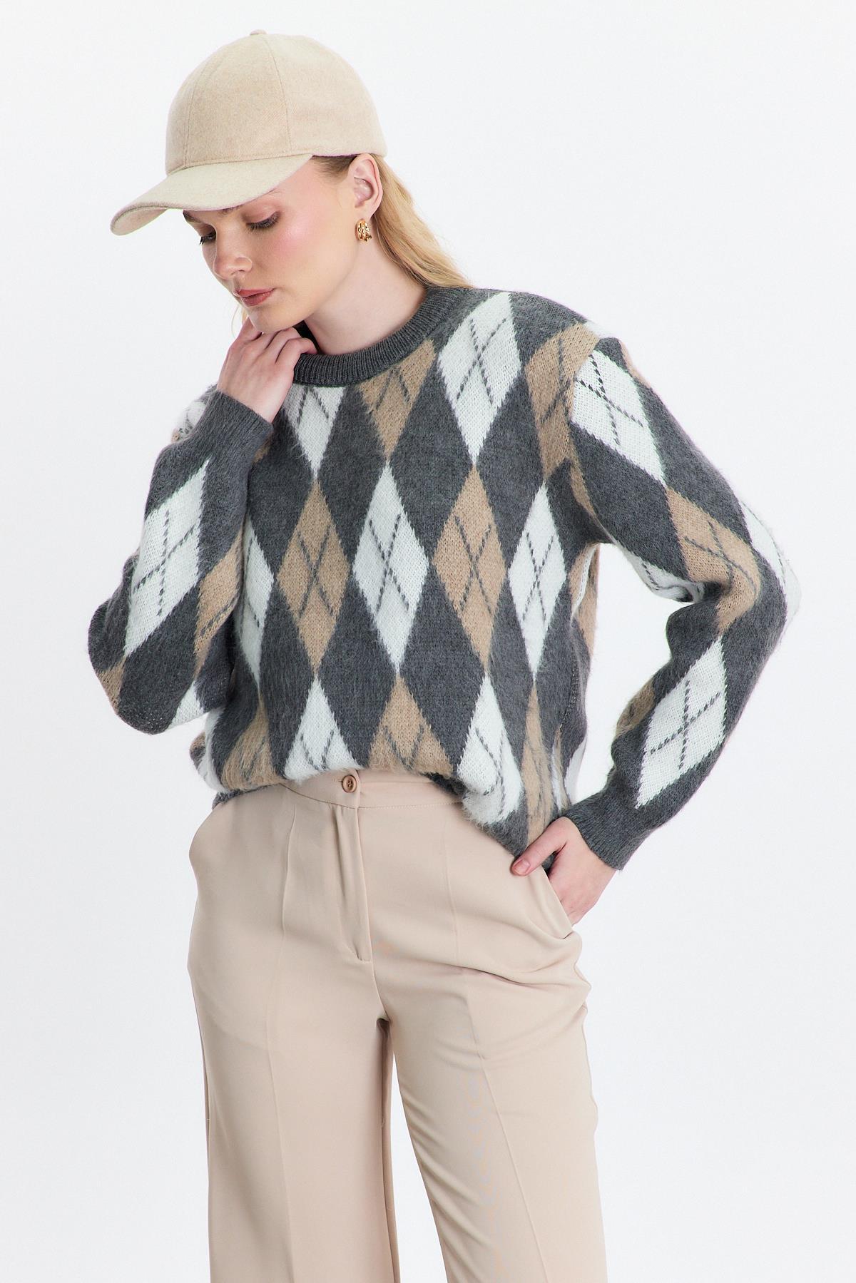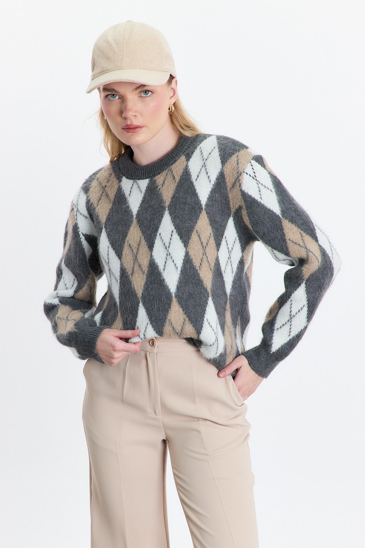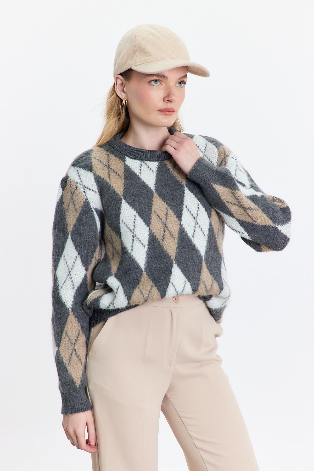Gri Baklava Desen Şardonlu Kazak 24376