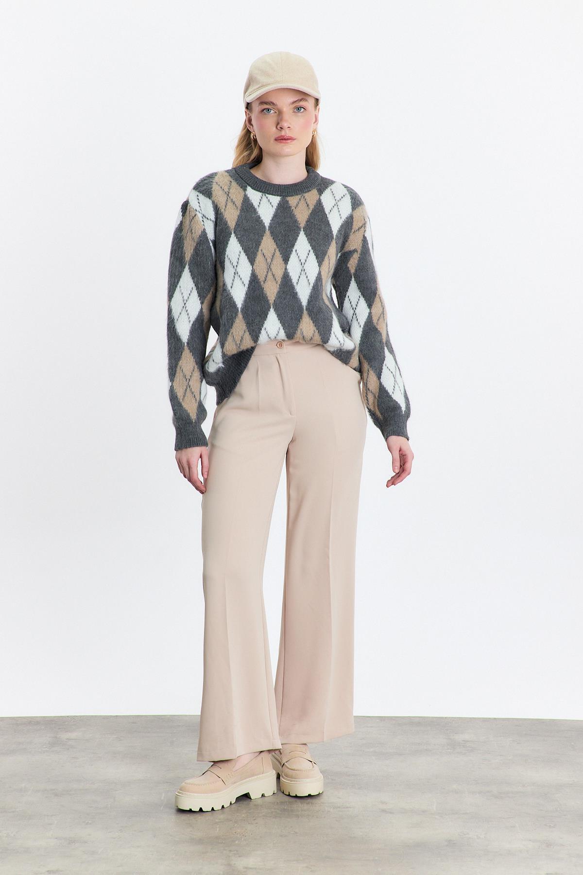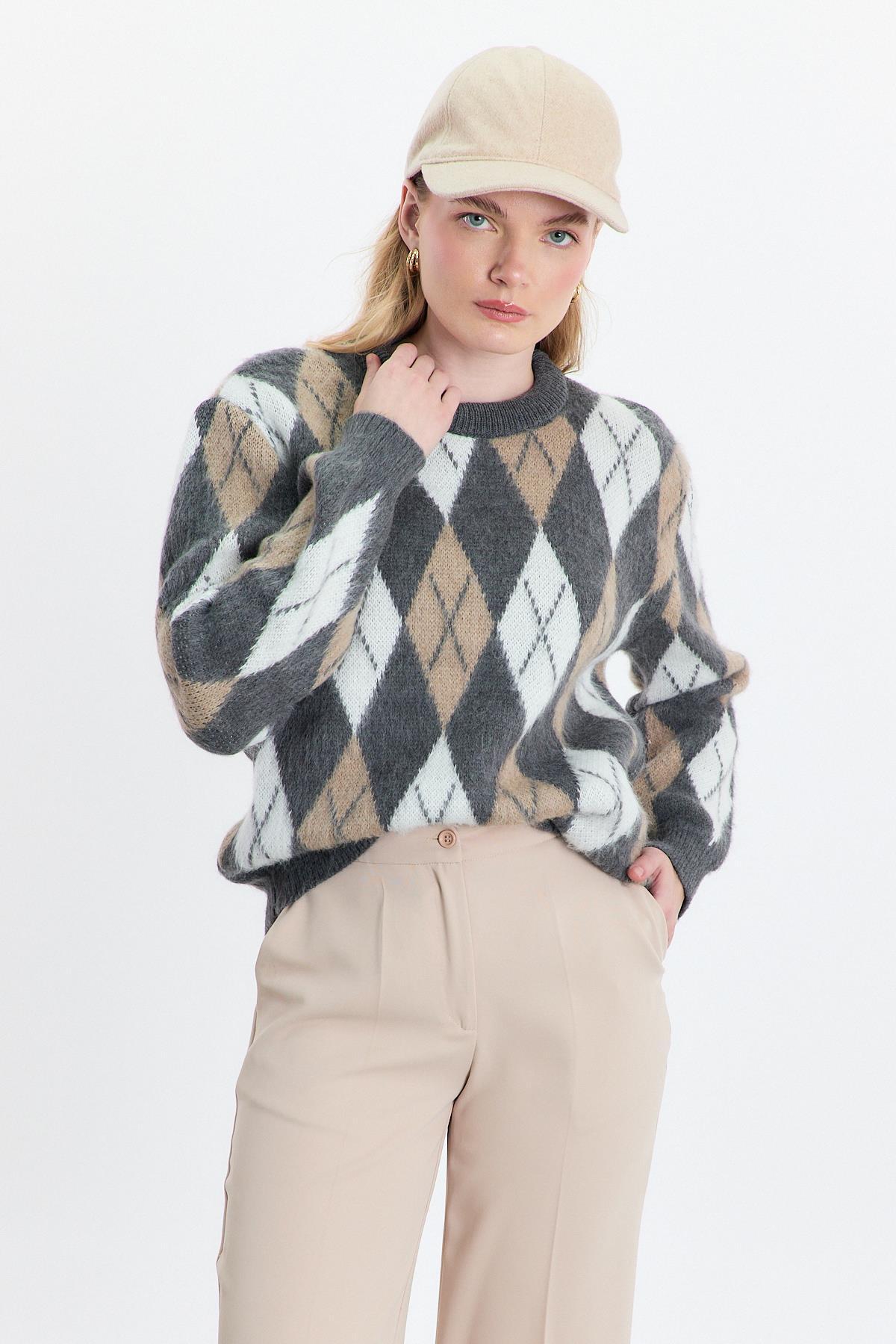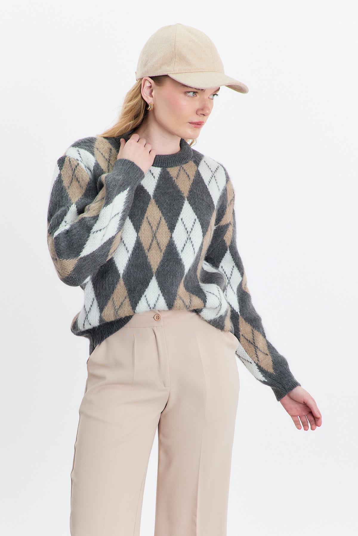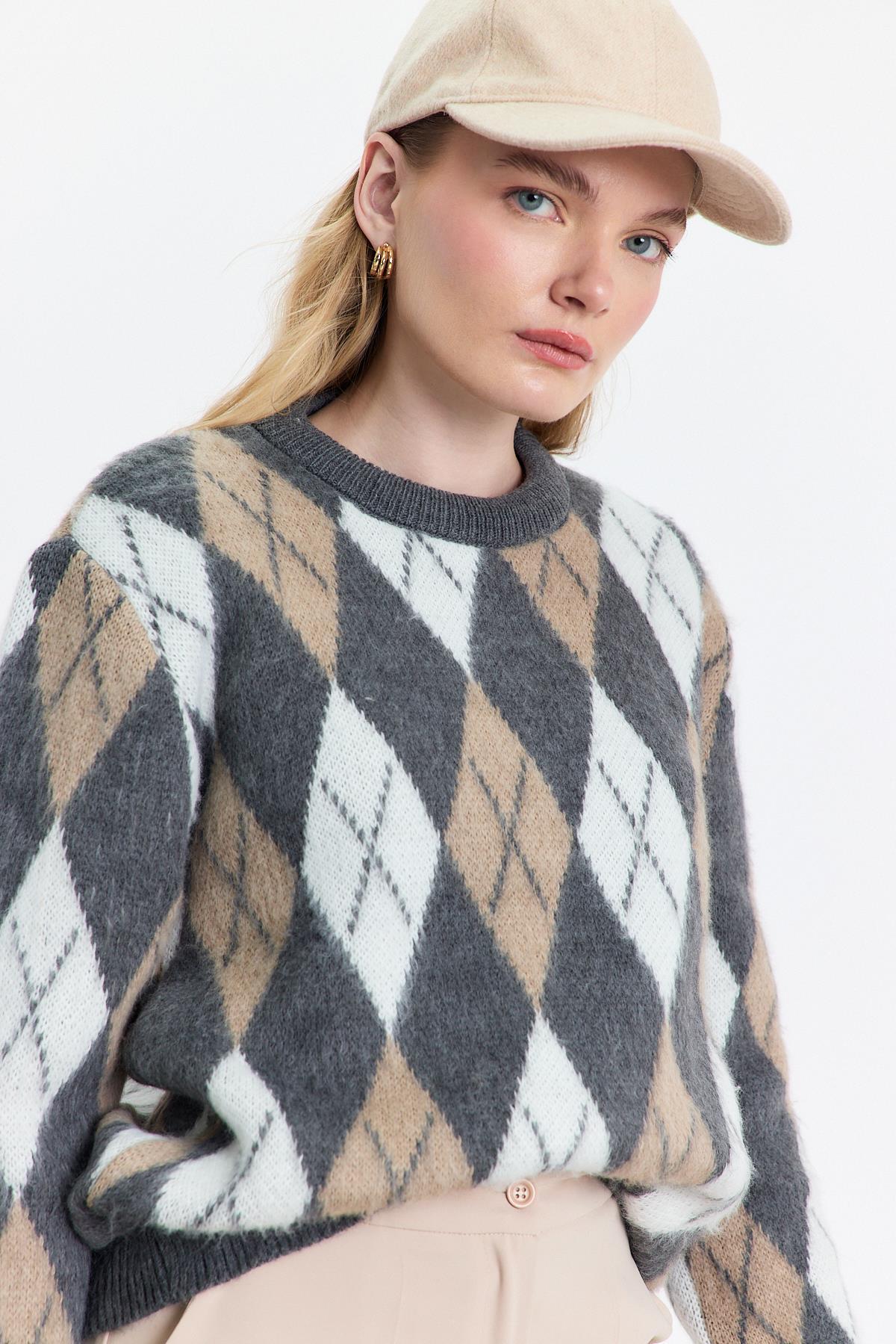 Gri Baklava Desen Şardonlu Kazak 24376