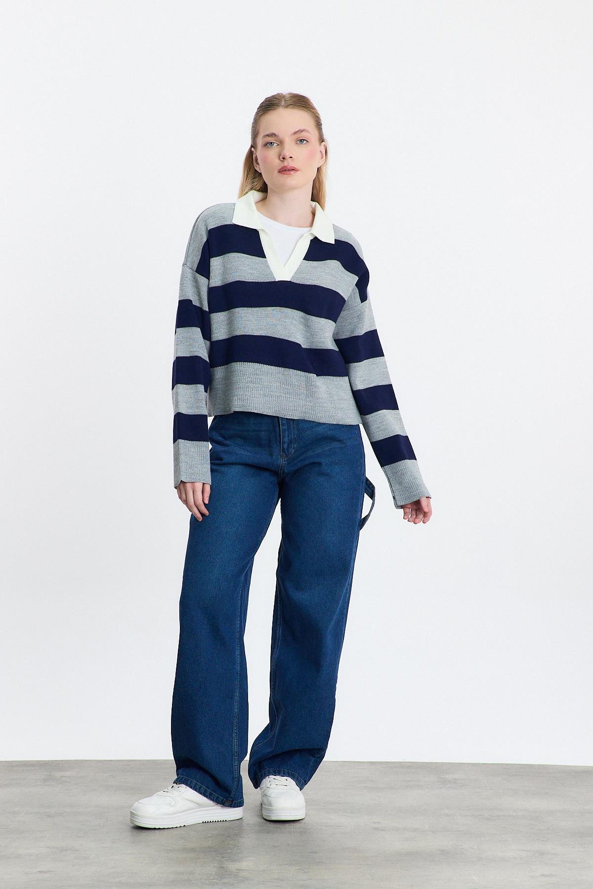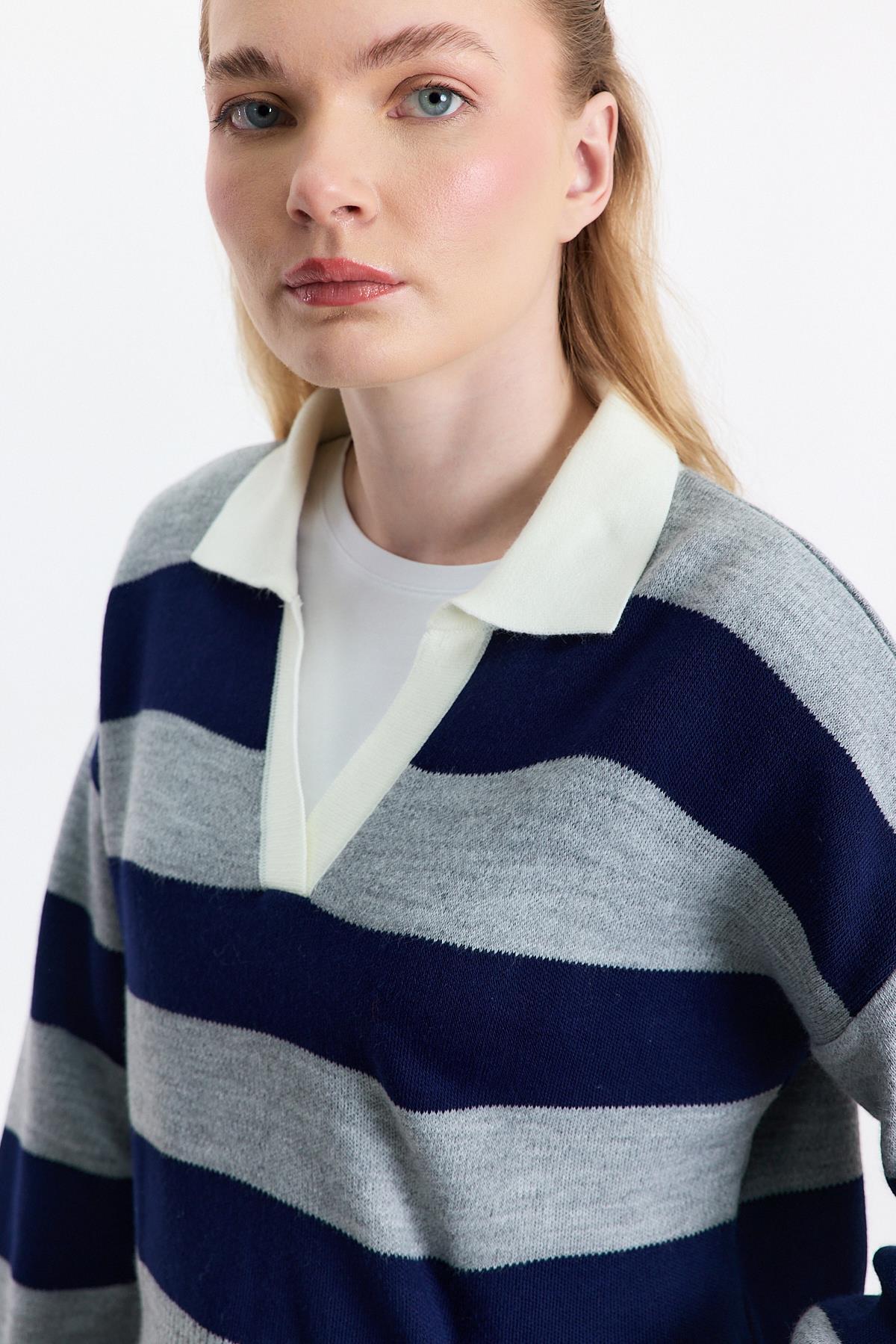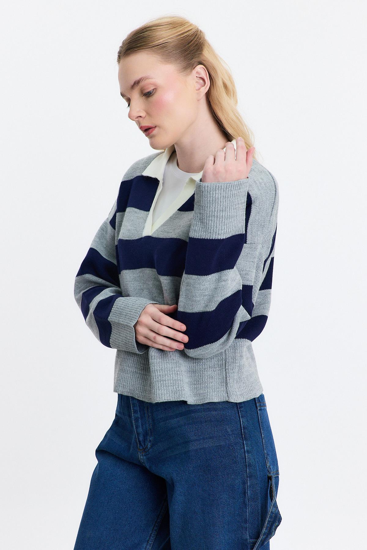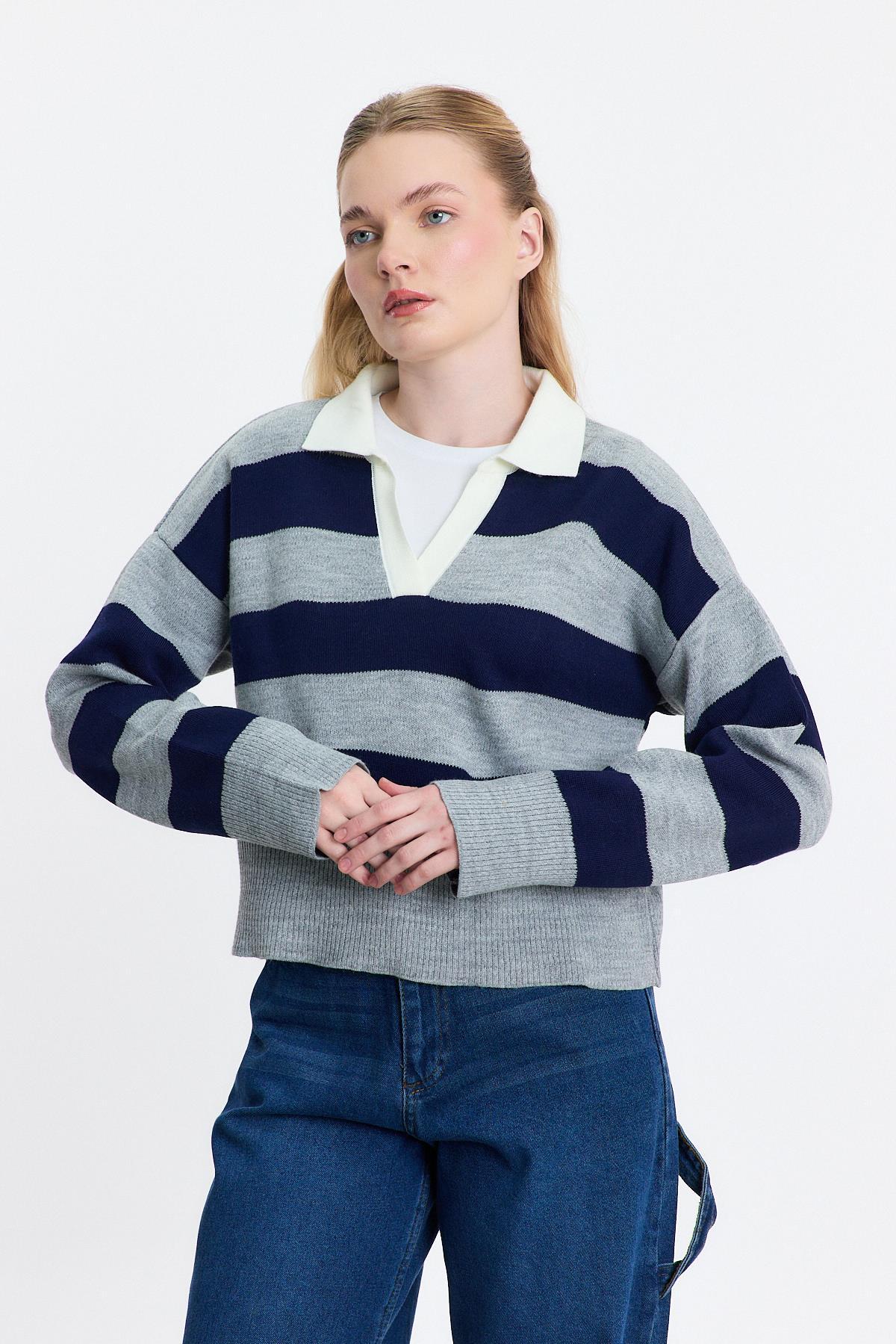 24379 Polo Yaka Çizgili Kazak Füme