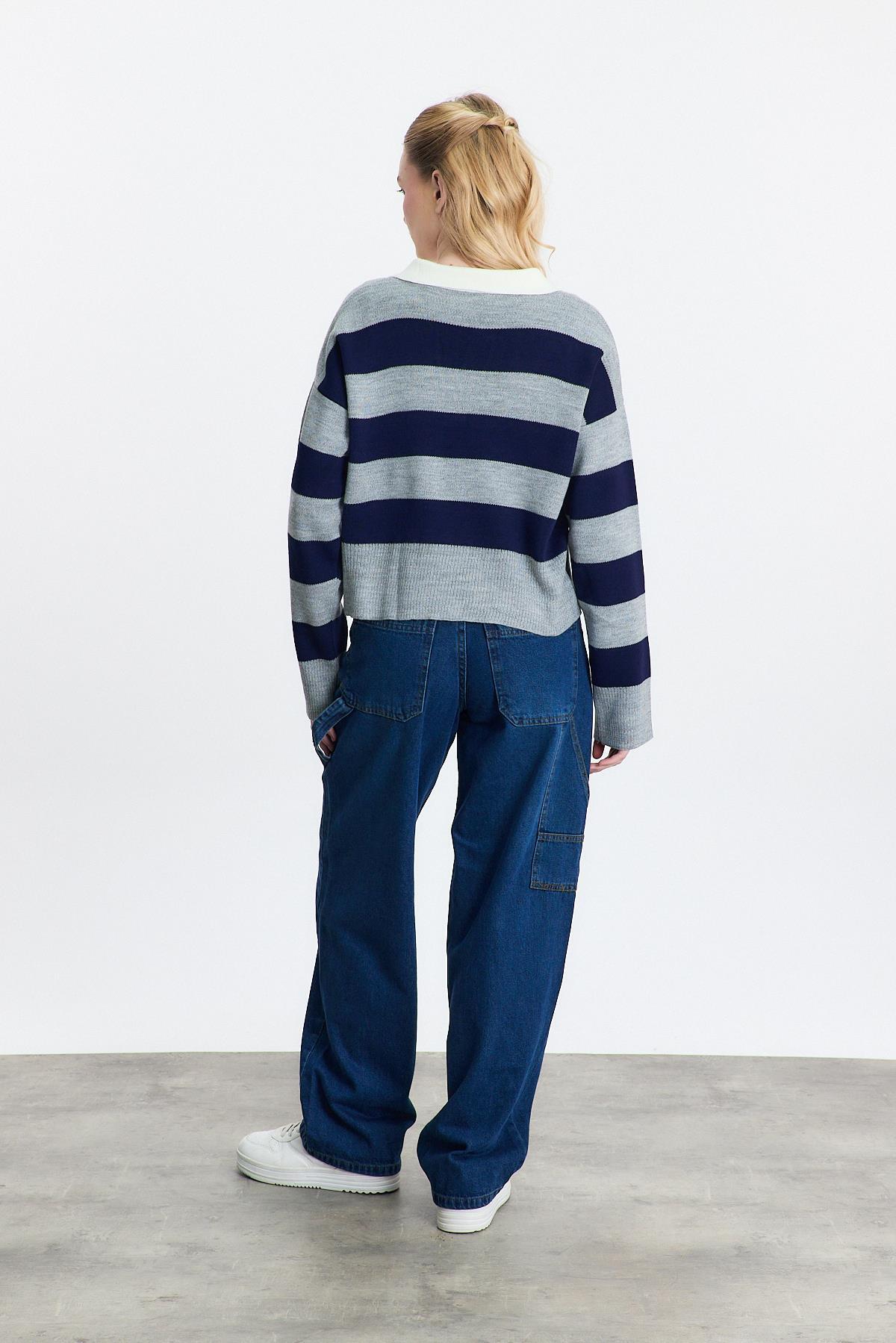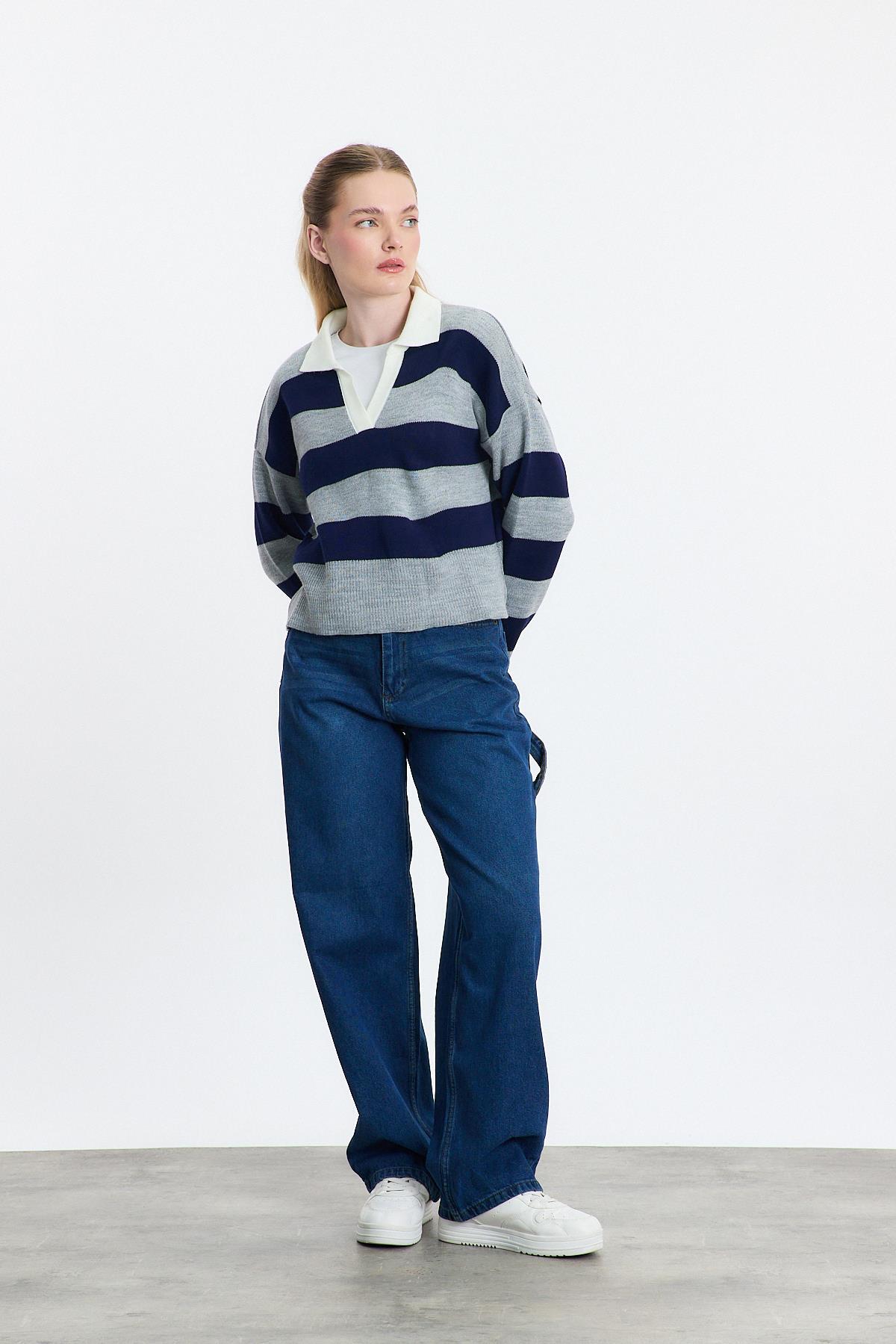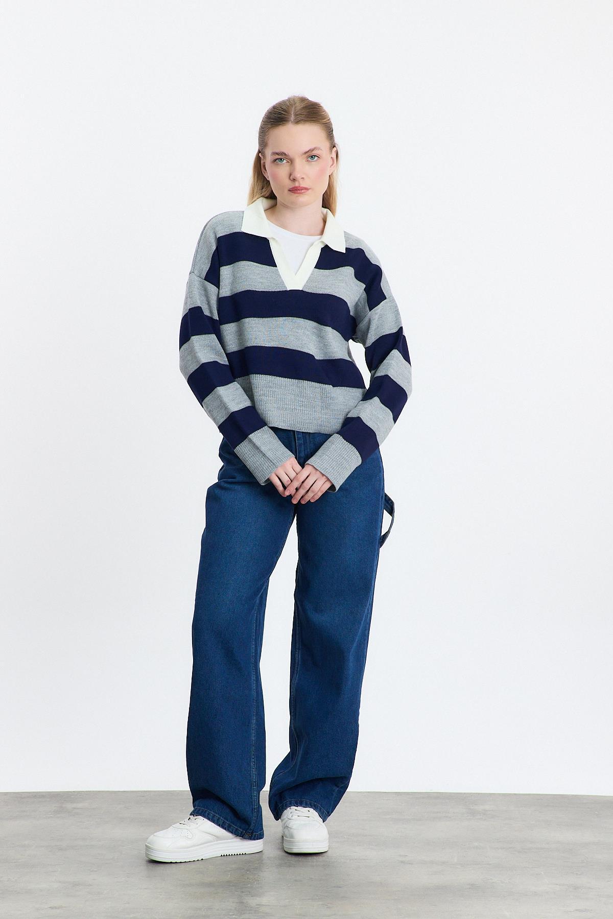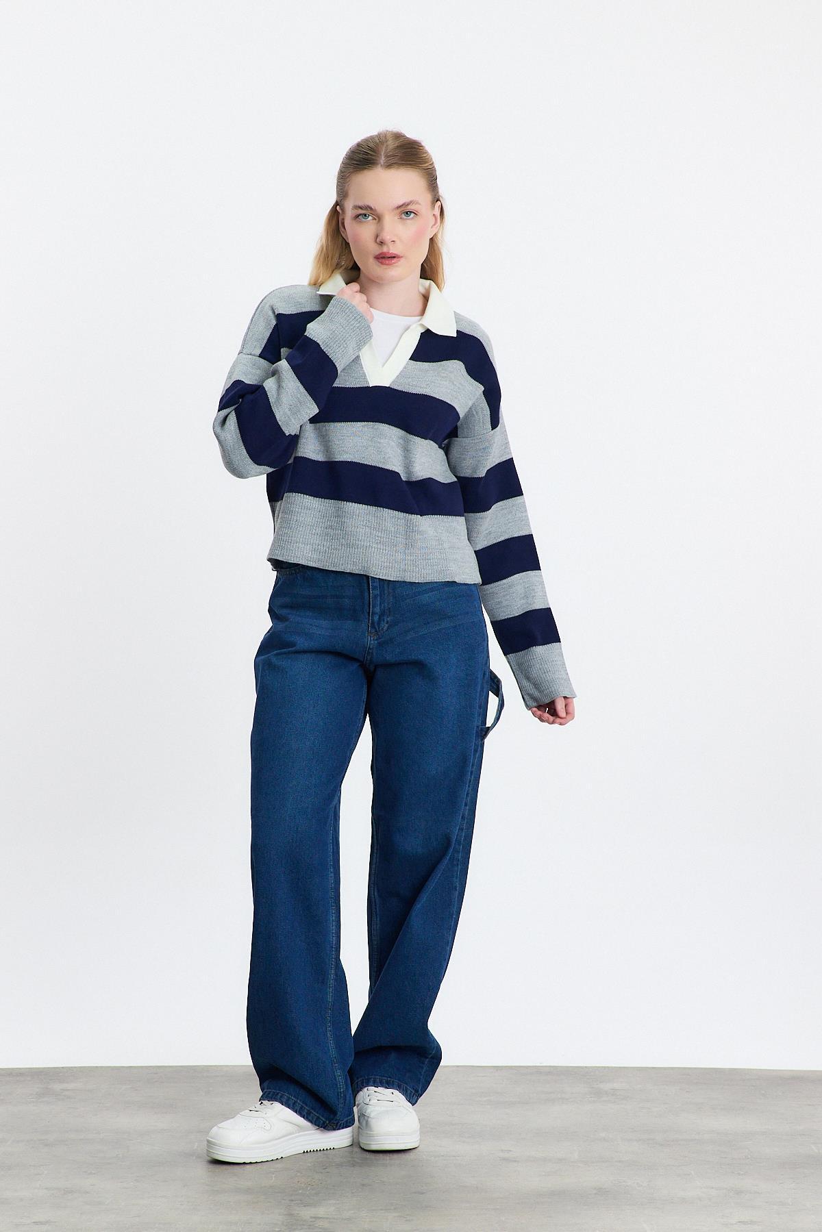 24379 Polo Yaka Çizgili Kazak Füme
