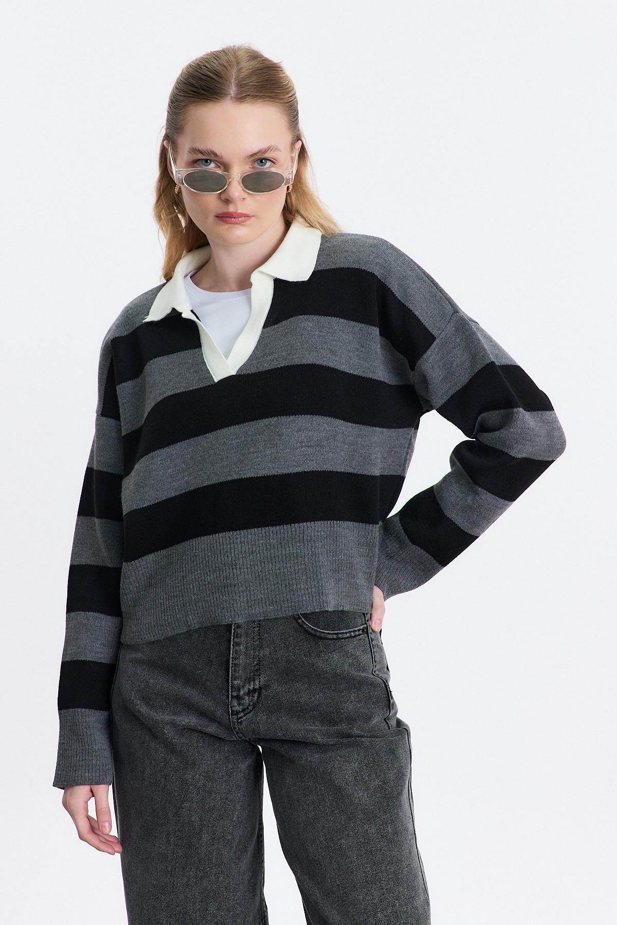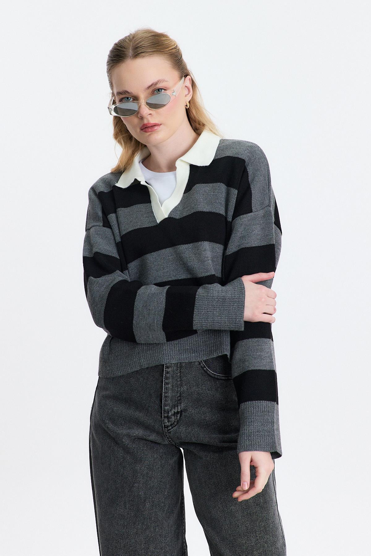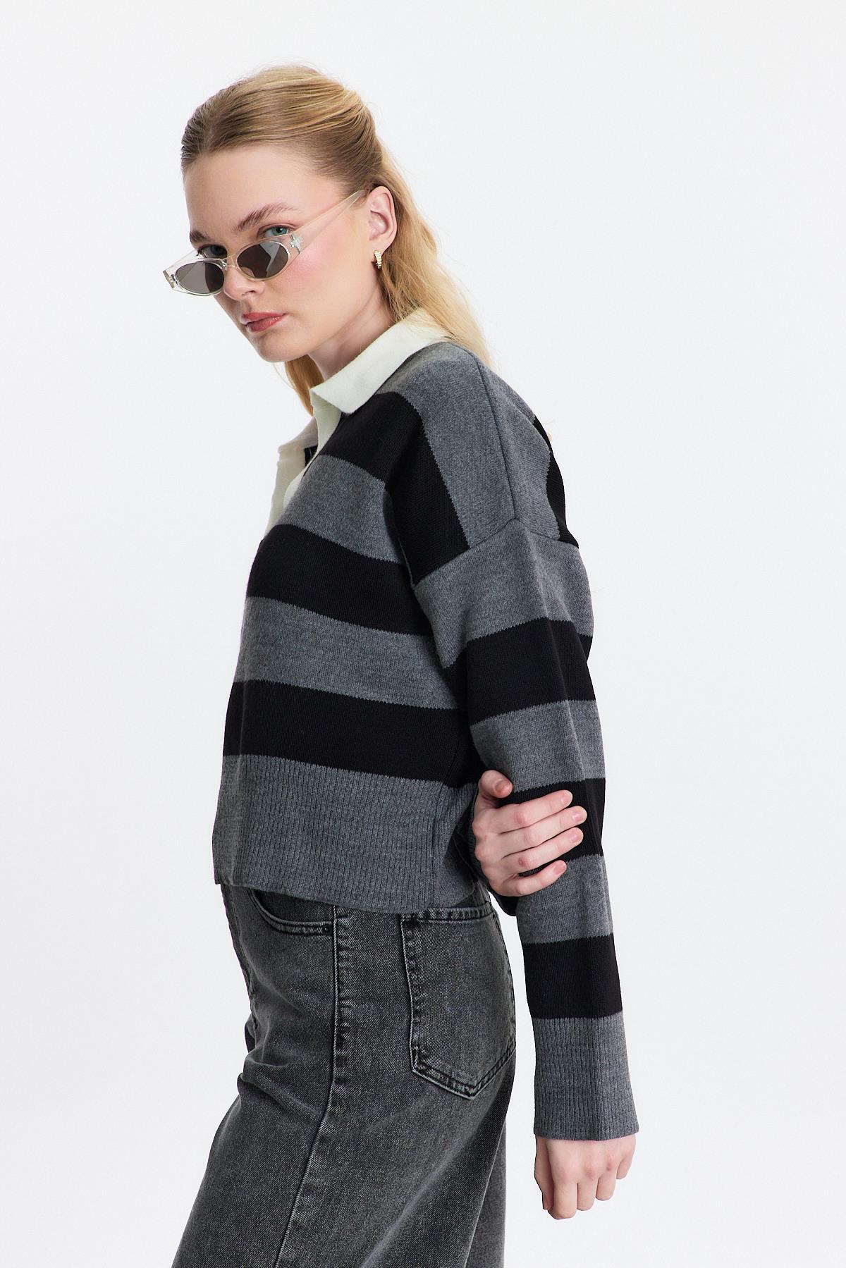 Gri Polo Yaka Çizgili Kazak 24379