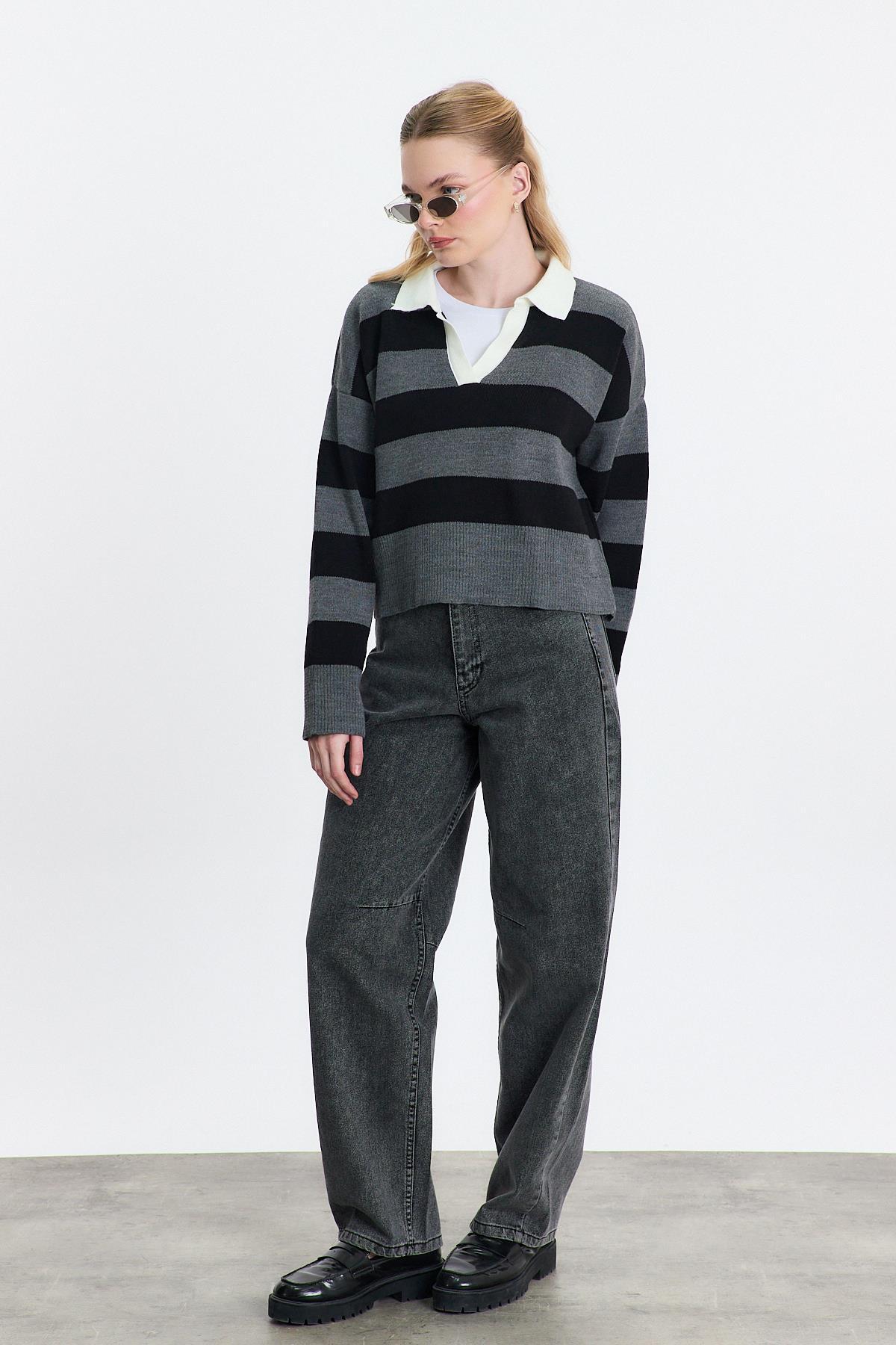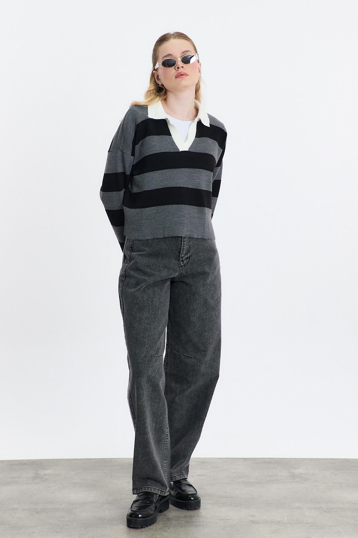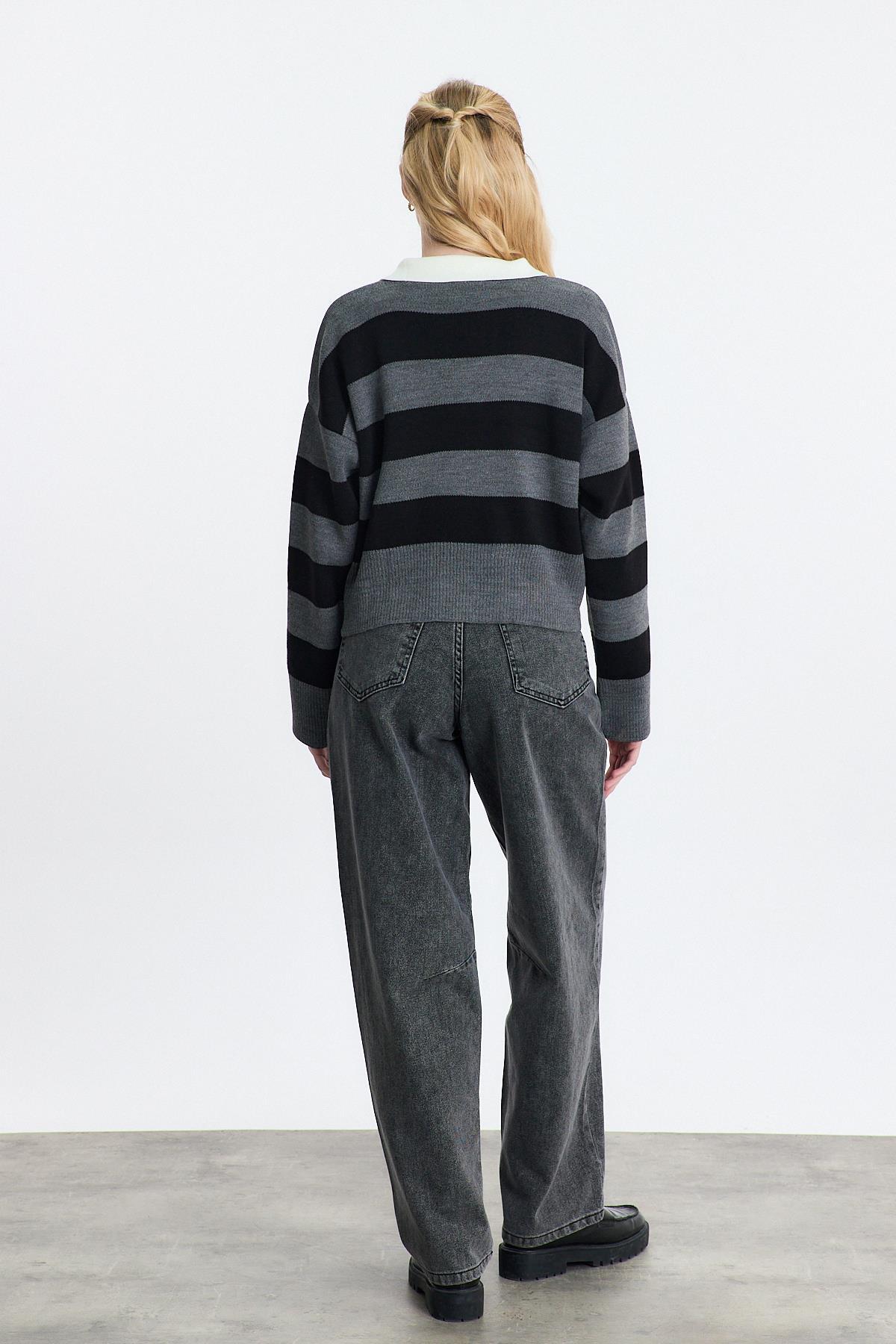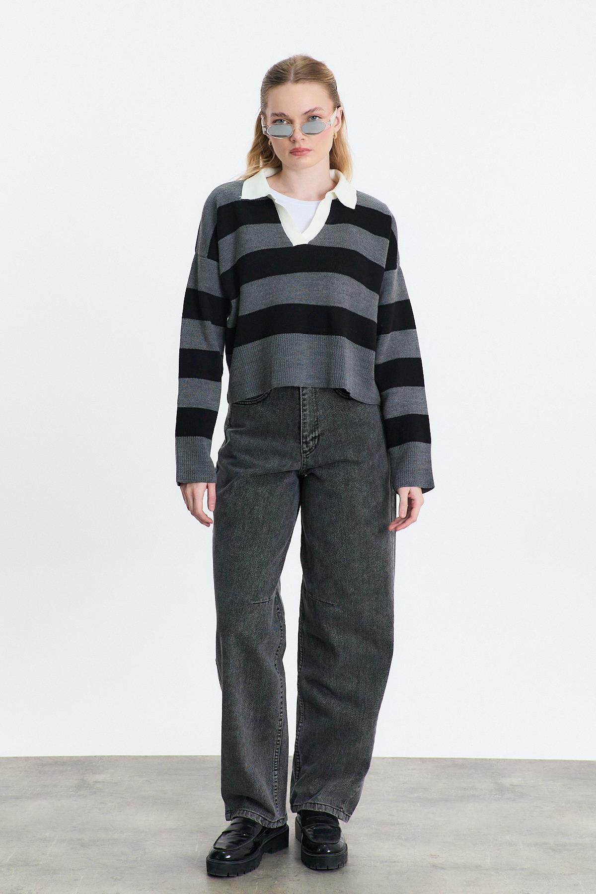 Gri Polo Yaka Çizgili Kazak 24379