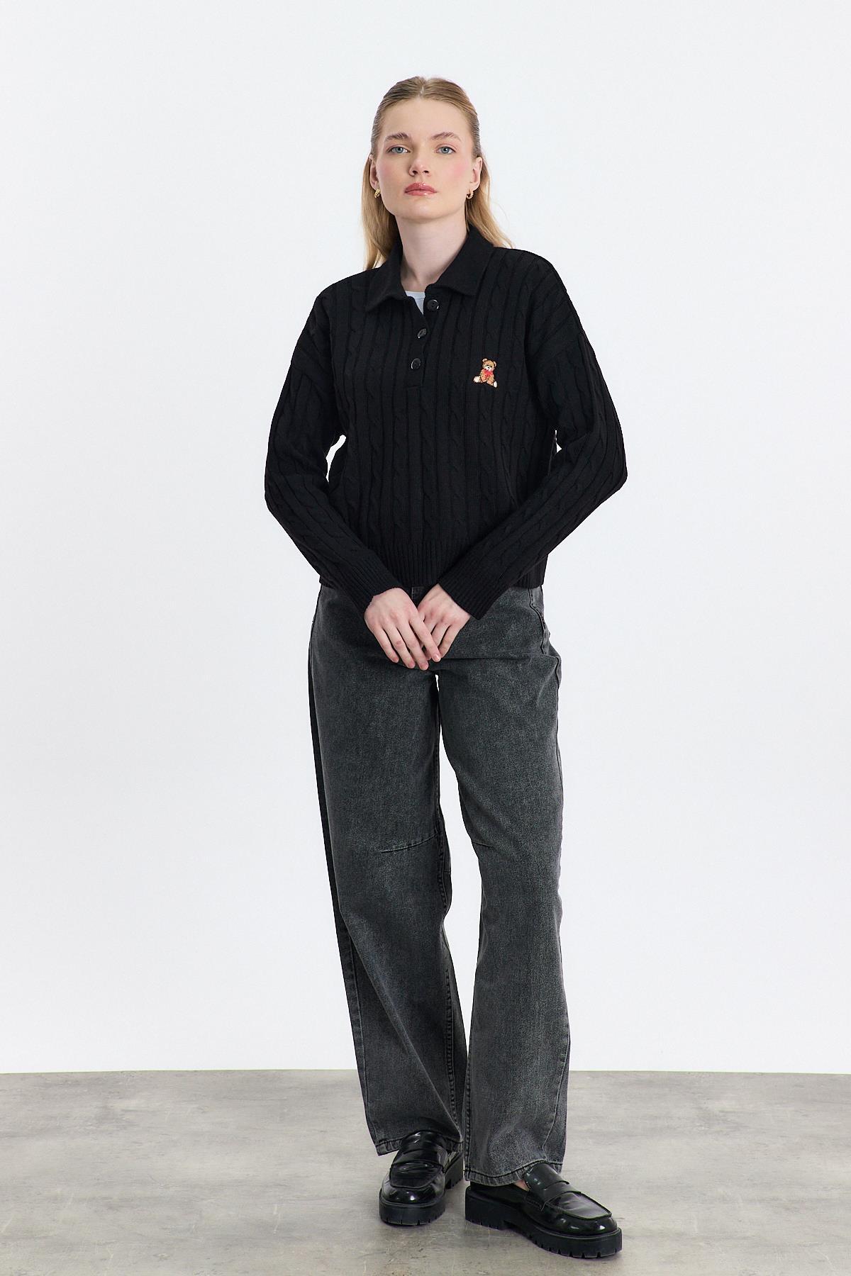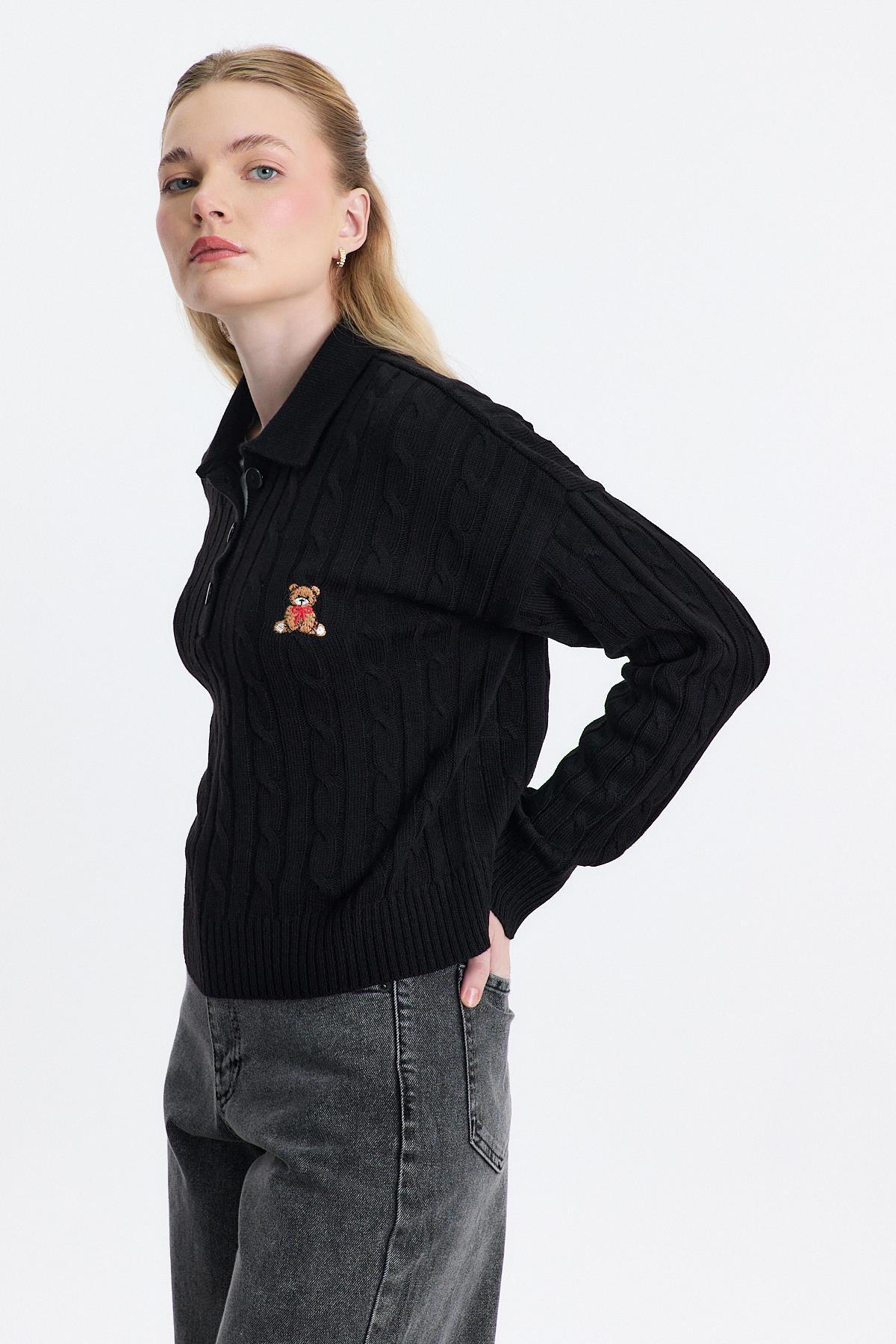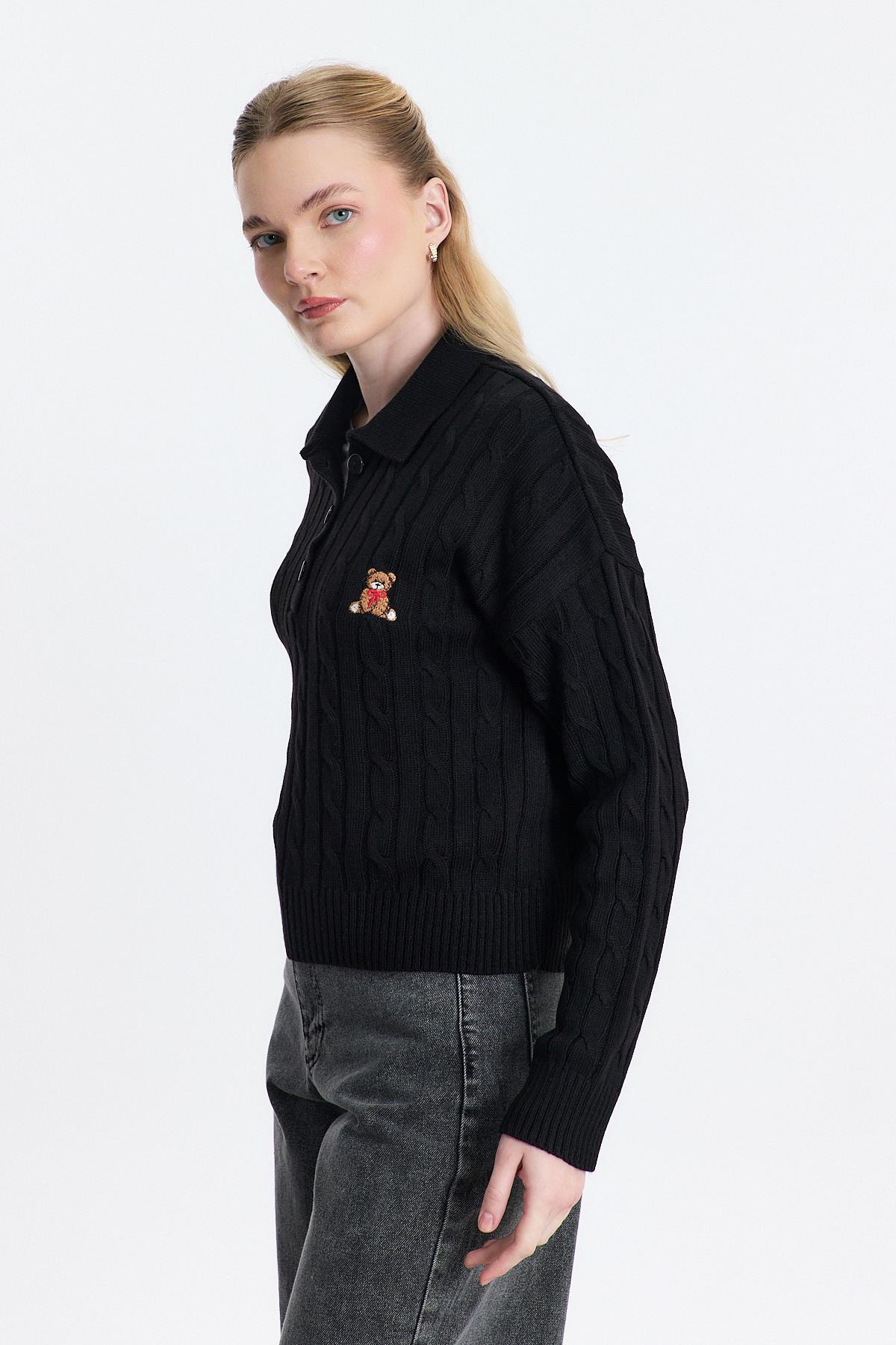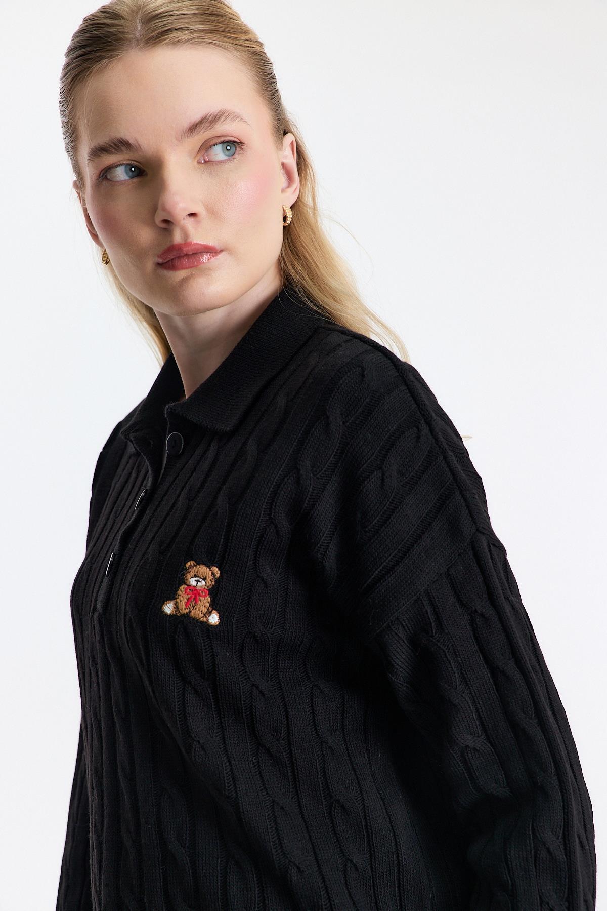 Siyah Ayıcık Nakışlı Örgülü Kazak 24387