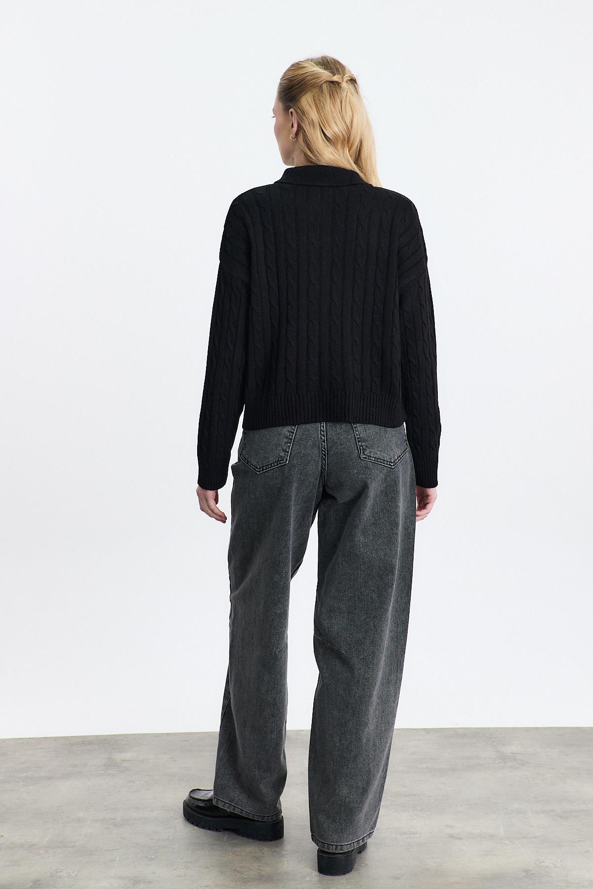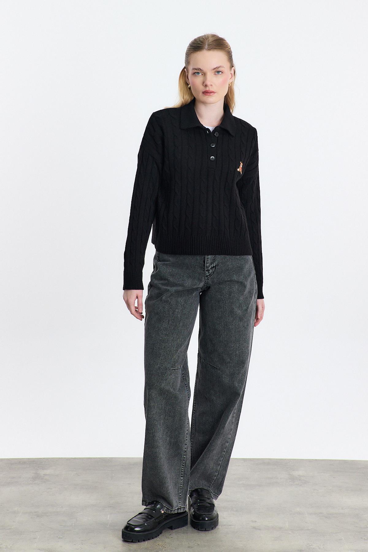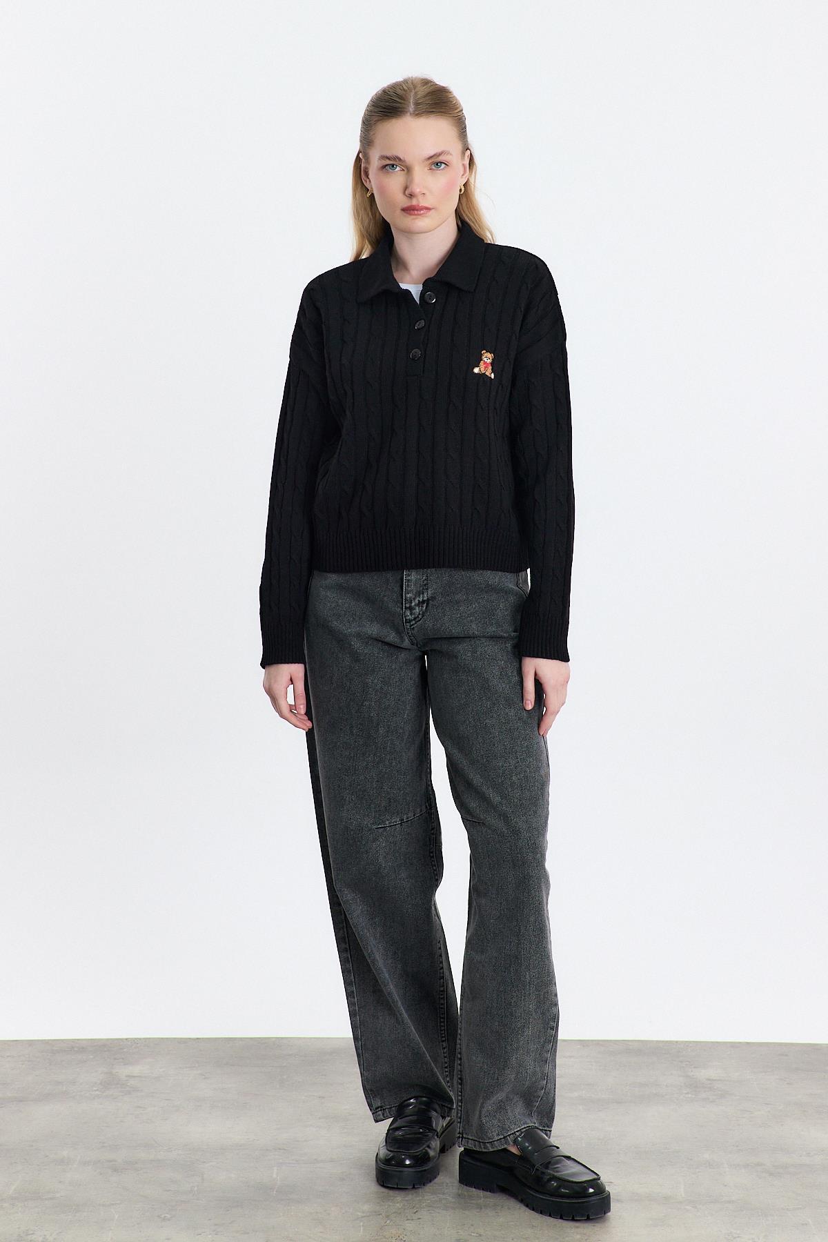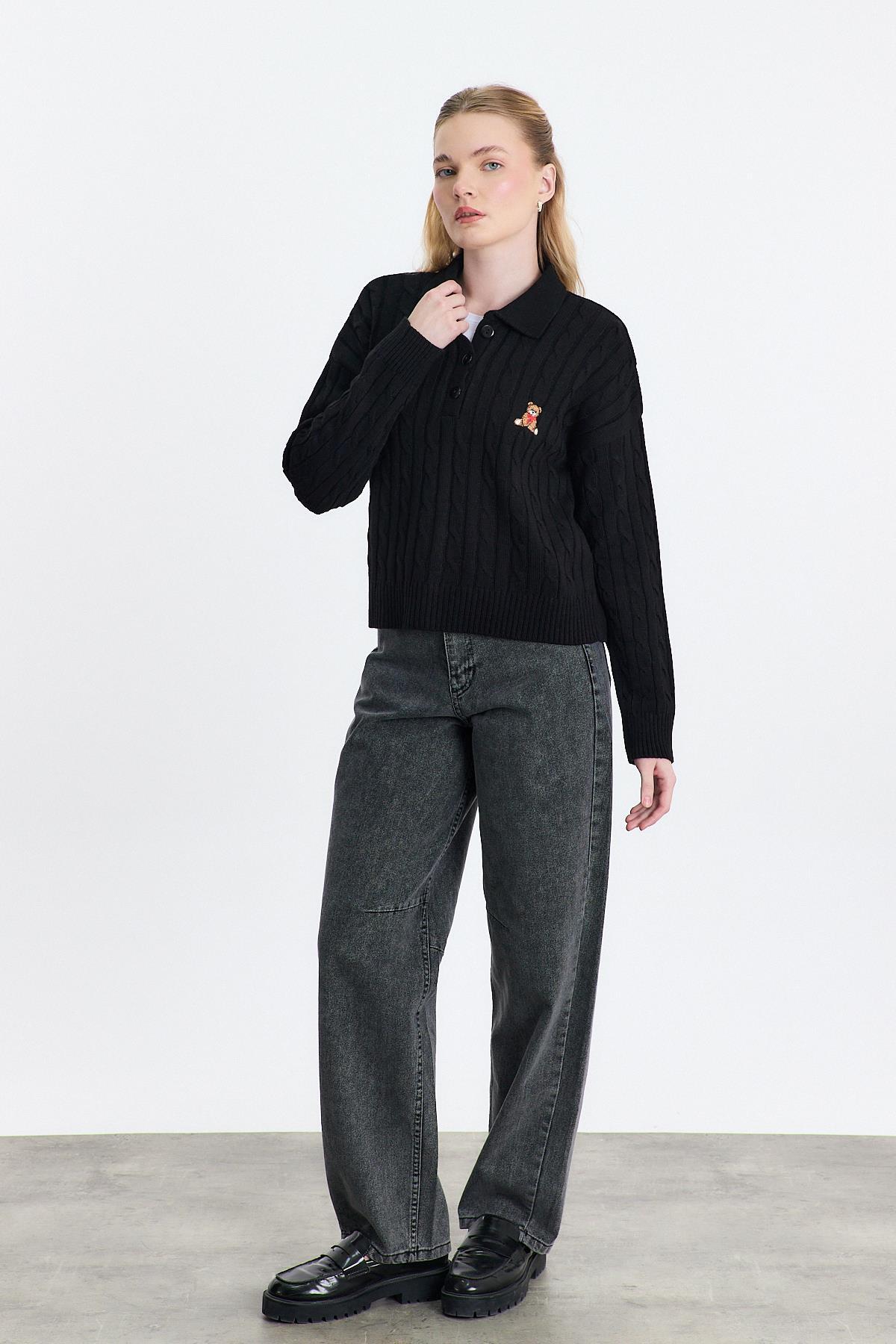 Siyah Ayıcık Nakışlı Örgülü Kazak 24387