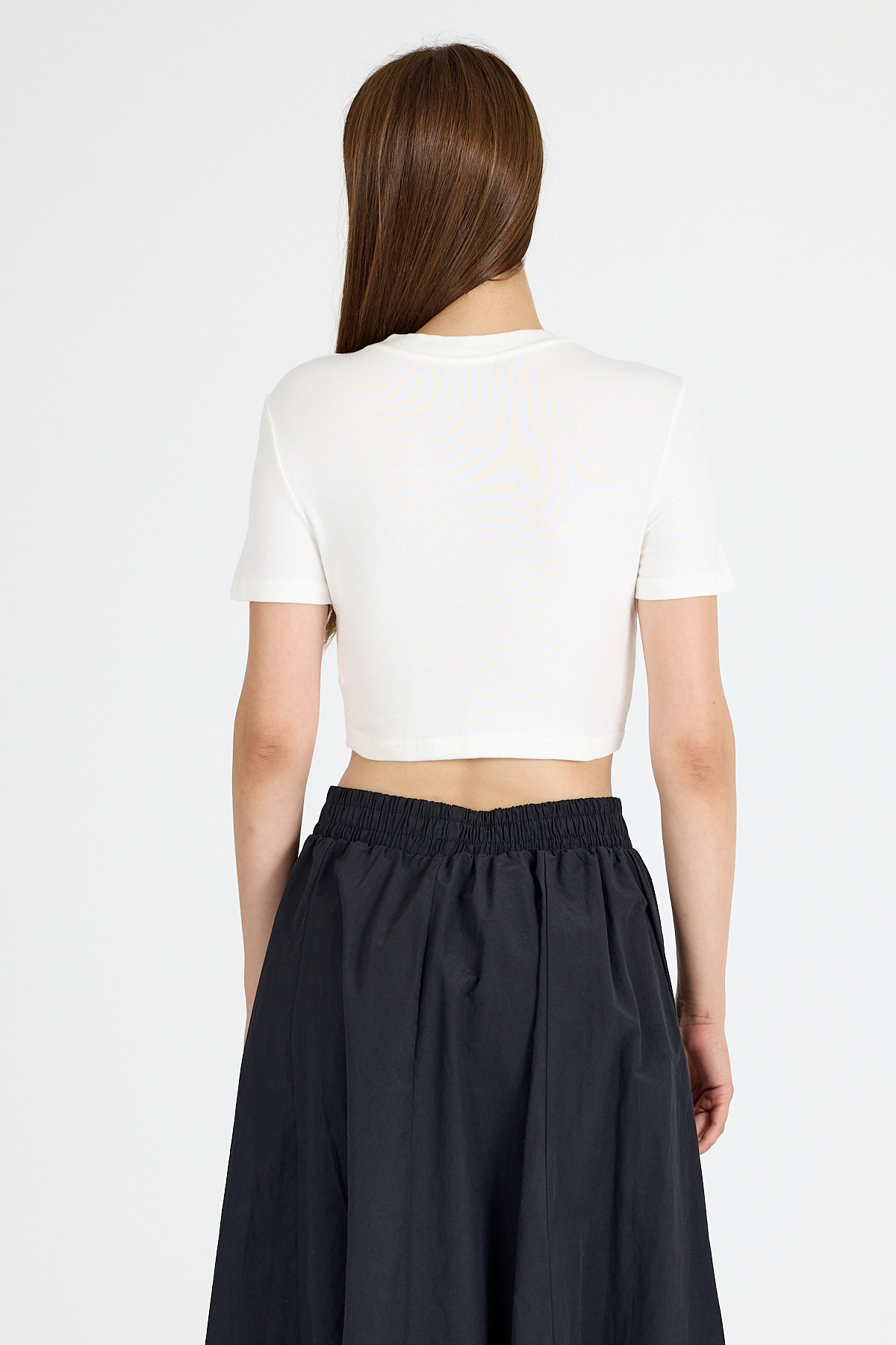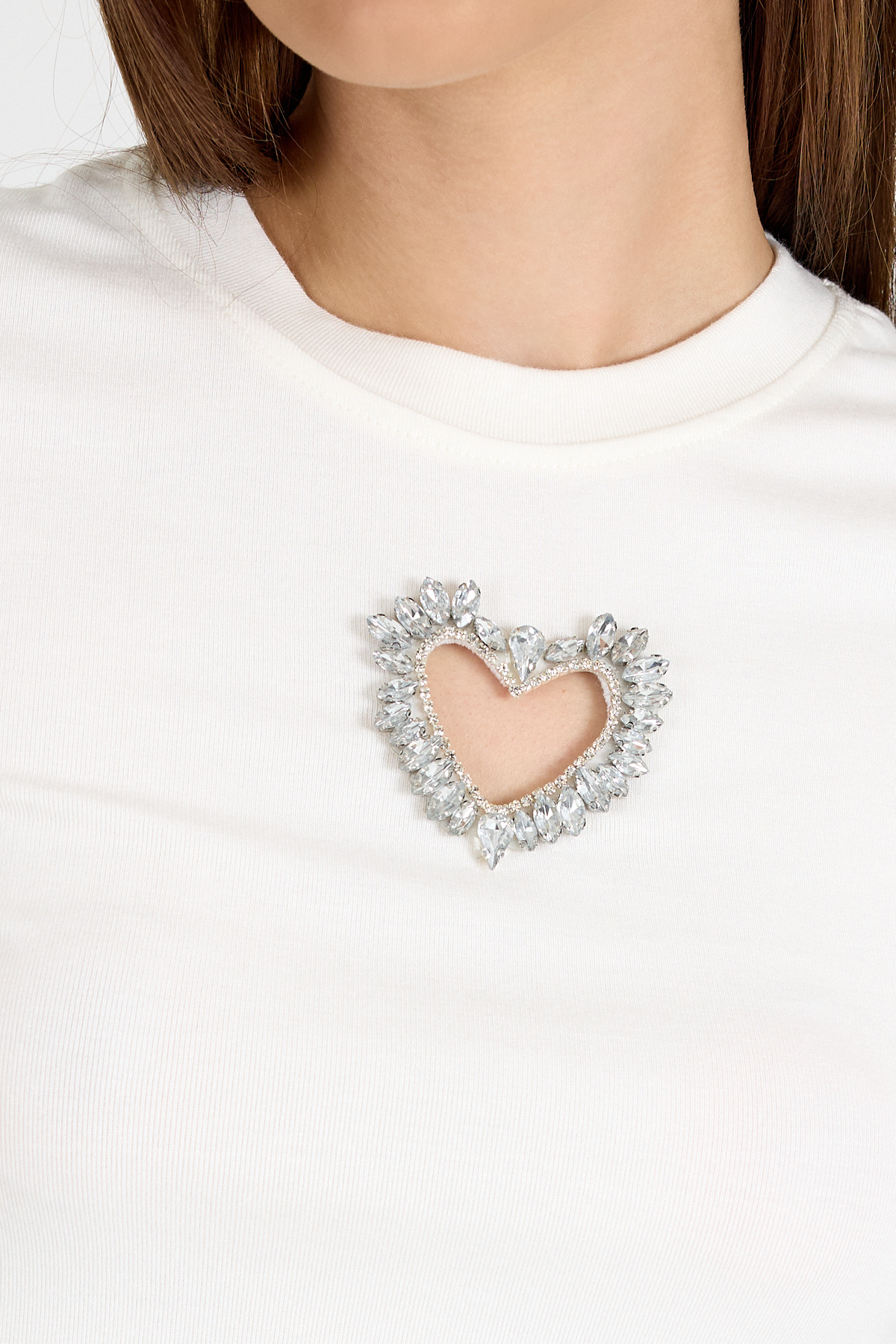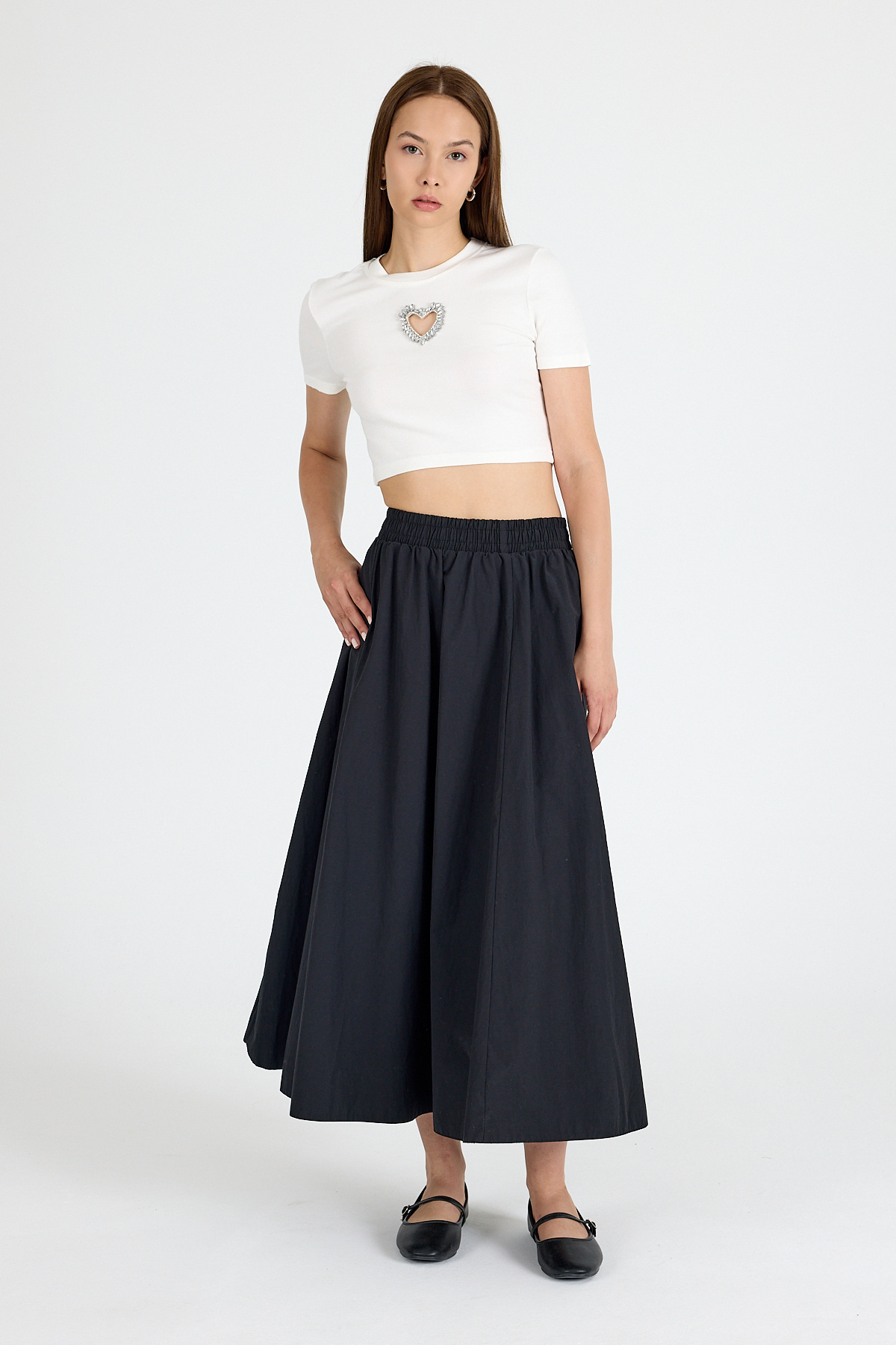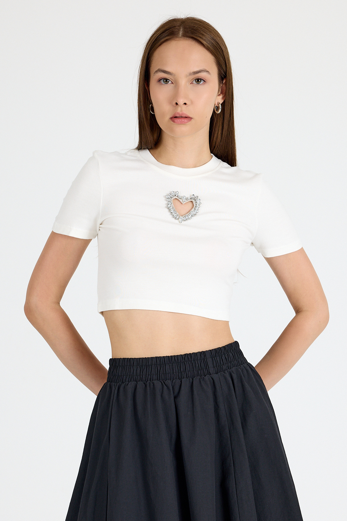 Beyaz Taş İşlemeli Kalp Detaylı Viskoz/Yumuşak Kumaş Crop Tişört 2444