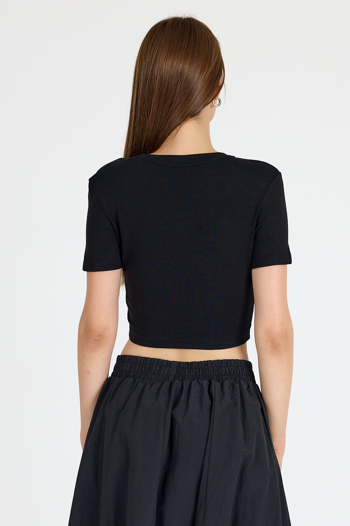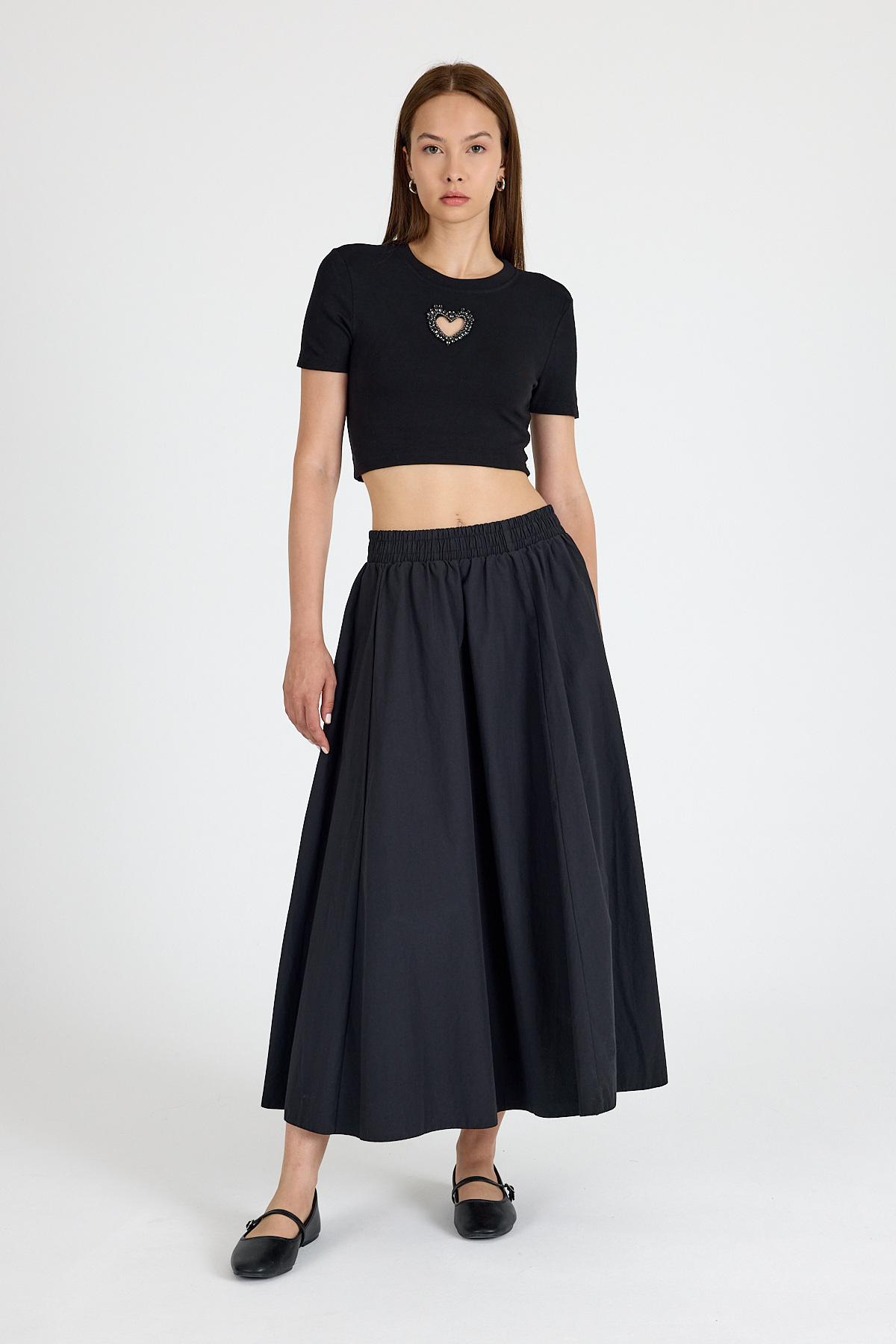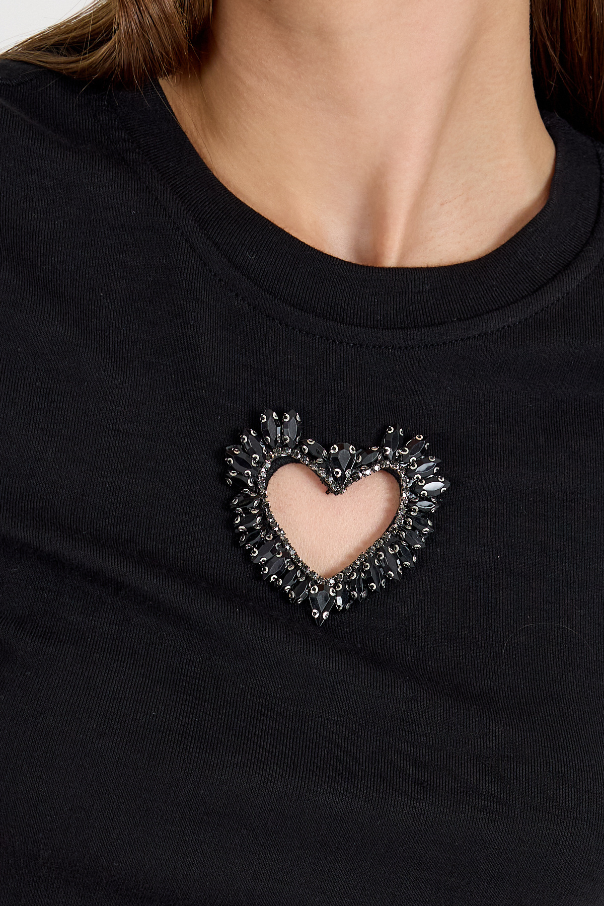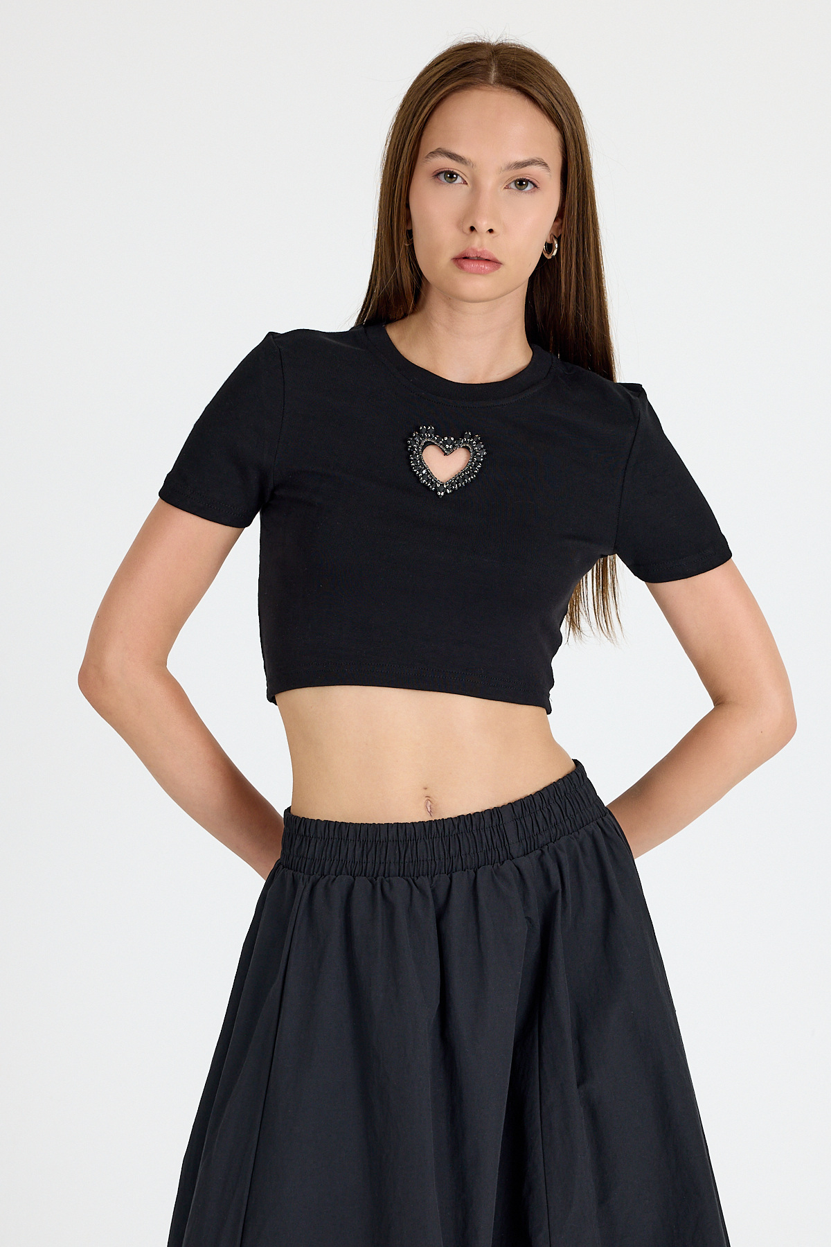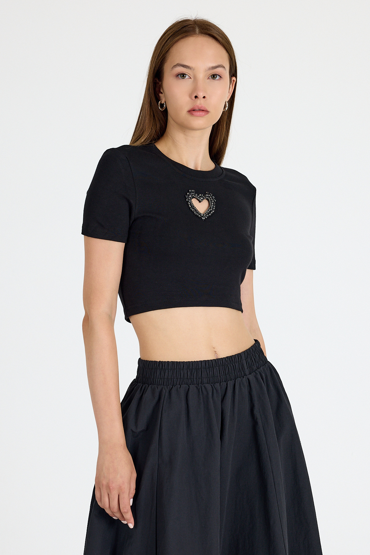 Siyah Taş İşlemeli Kalp Detaylı Viskoz/Yumuşak Kumaş Crop Tişört 2444