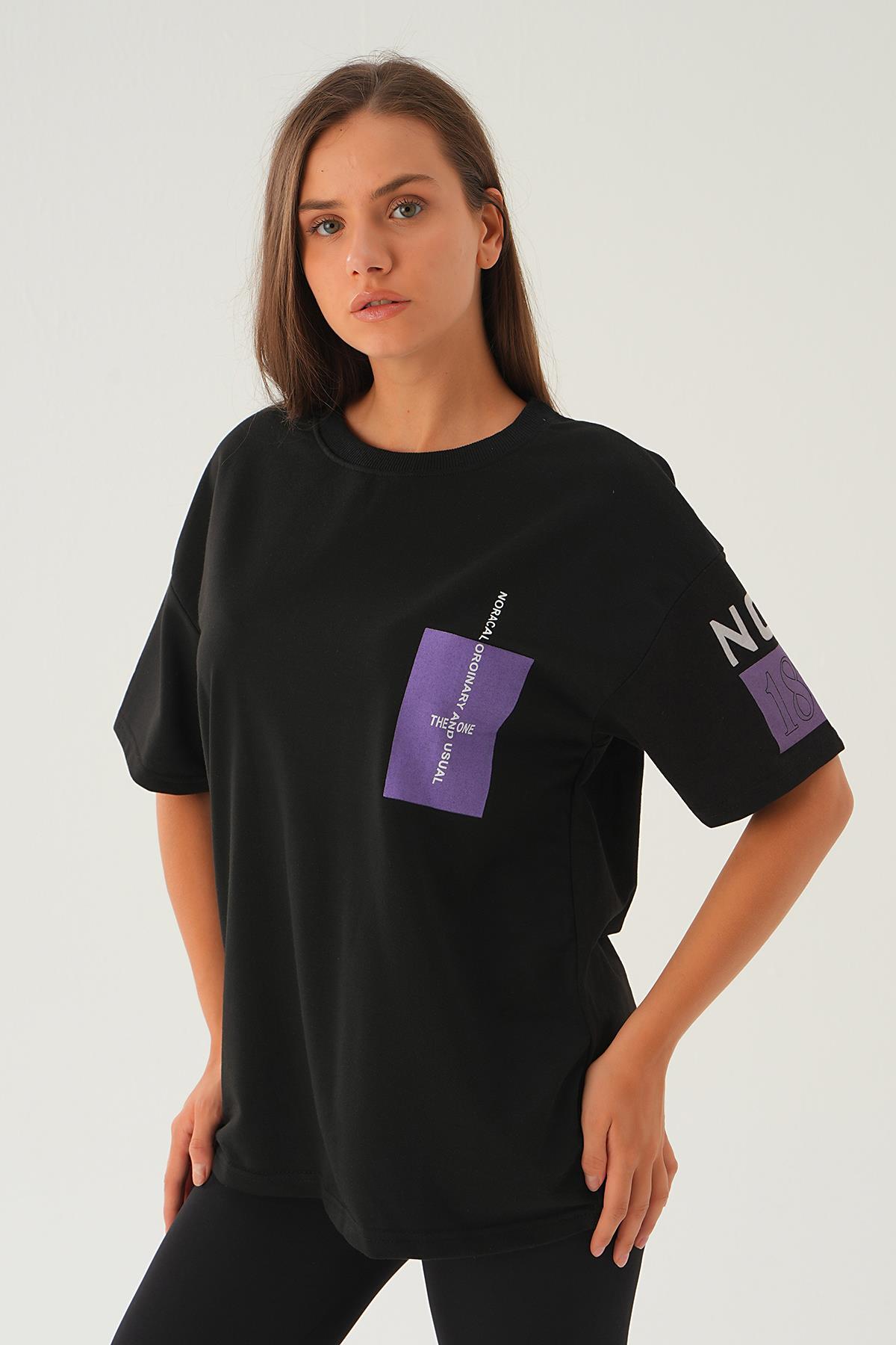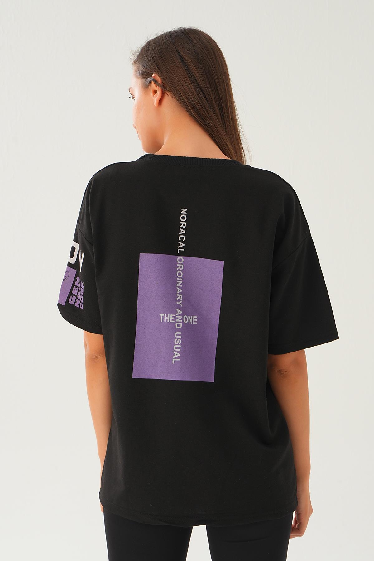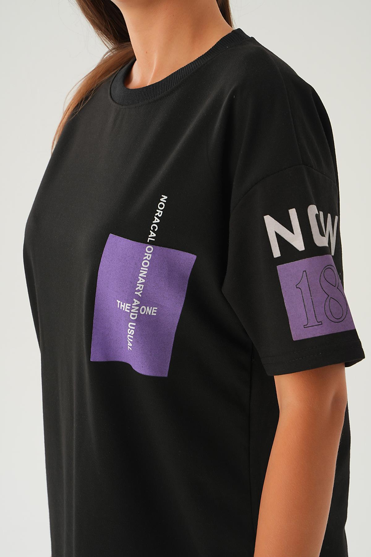 Siyah Arka Ön Yazı Baskılı Tişört 2447