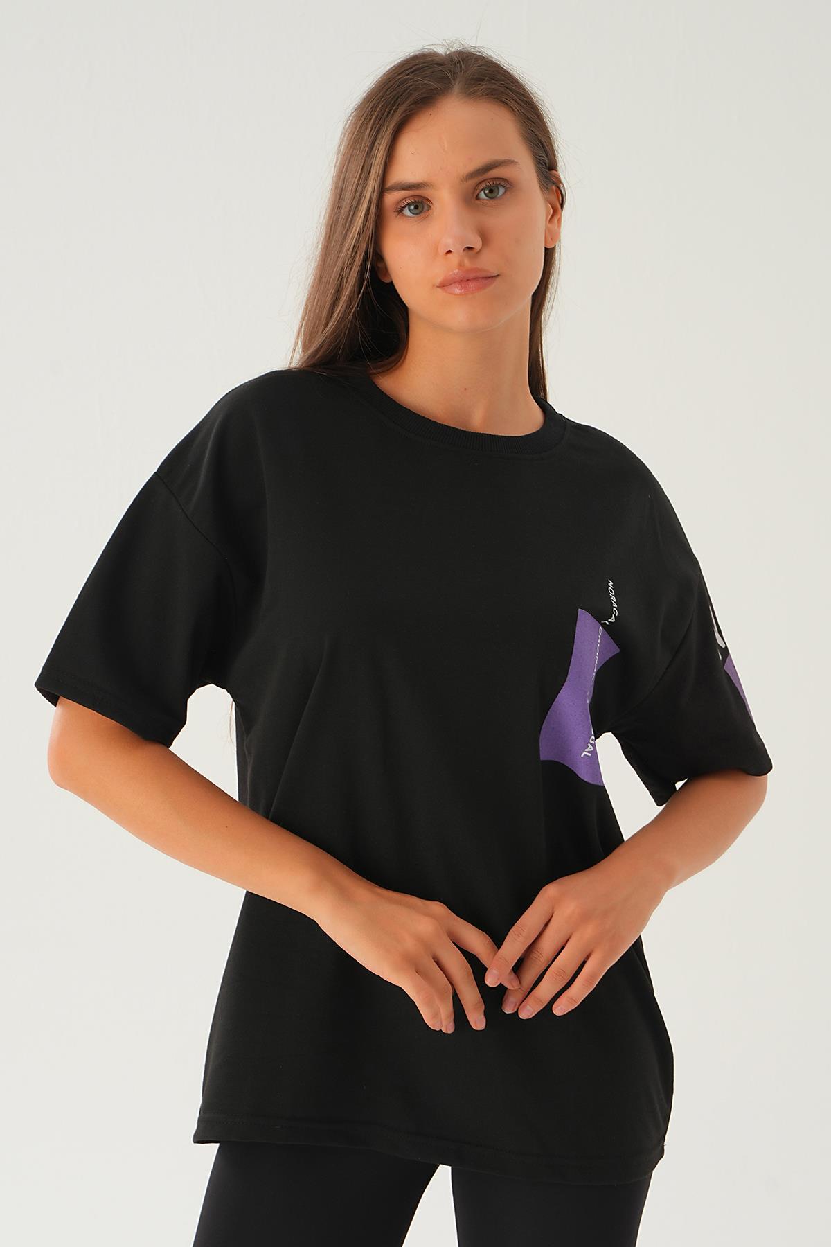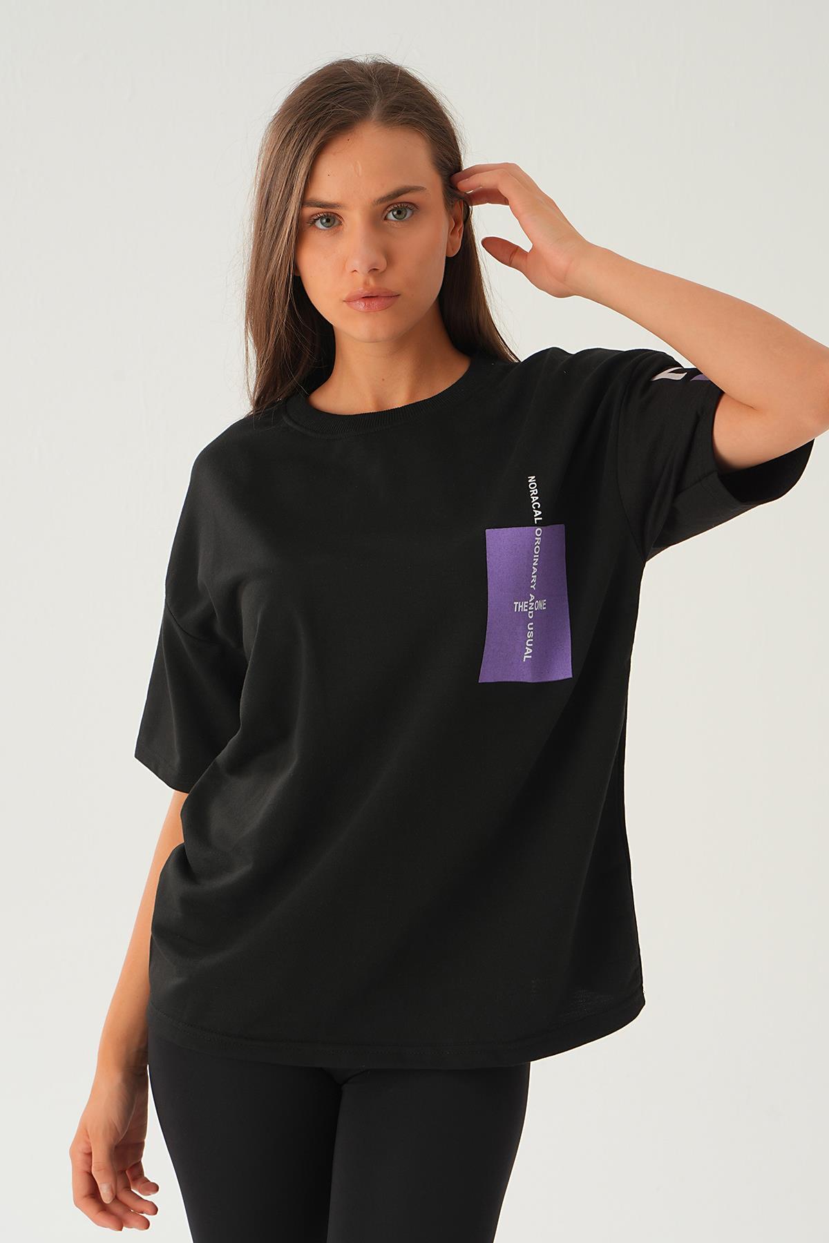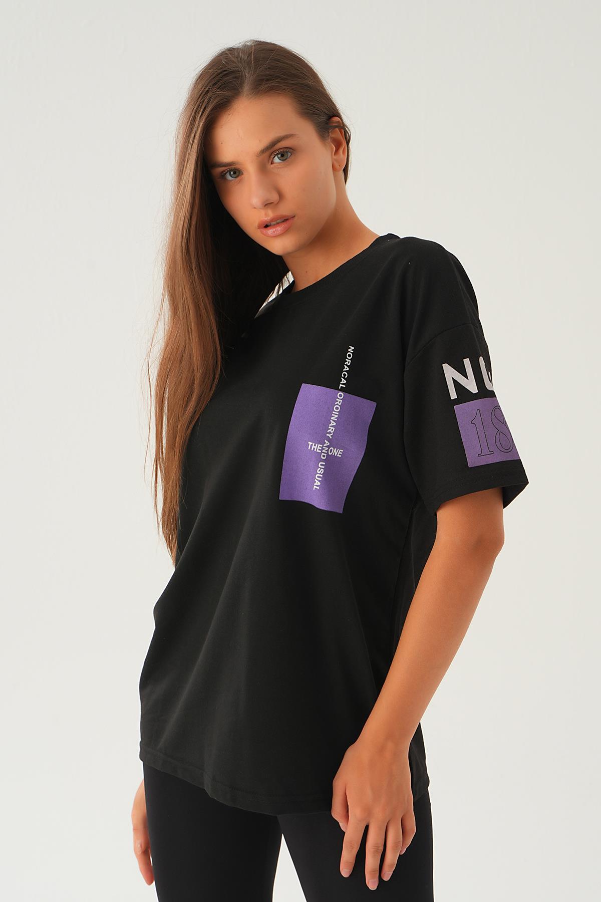 Siyah Arka Ön Yazı Baskılı Tişört 2447