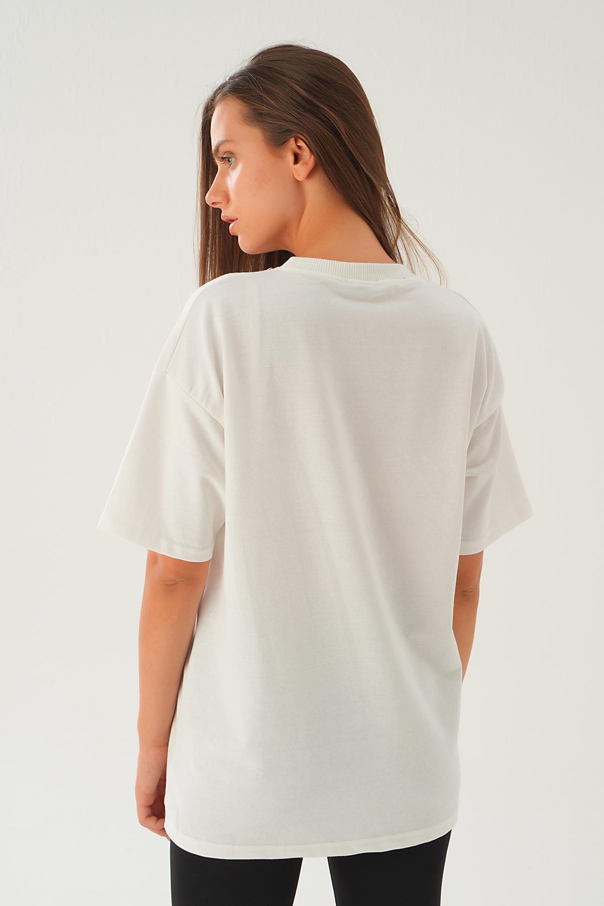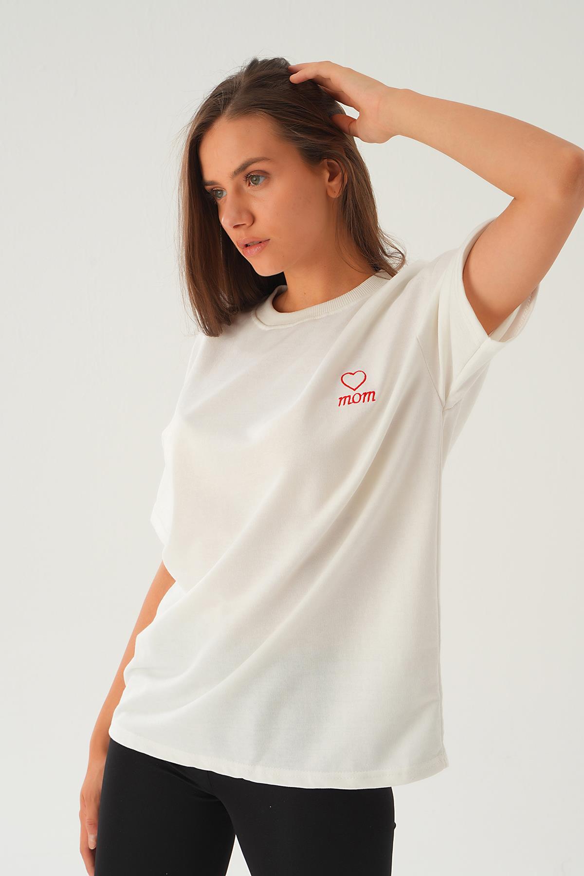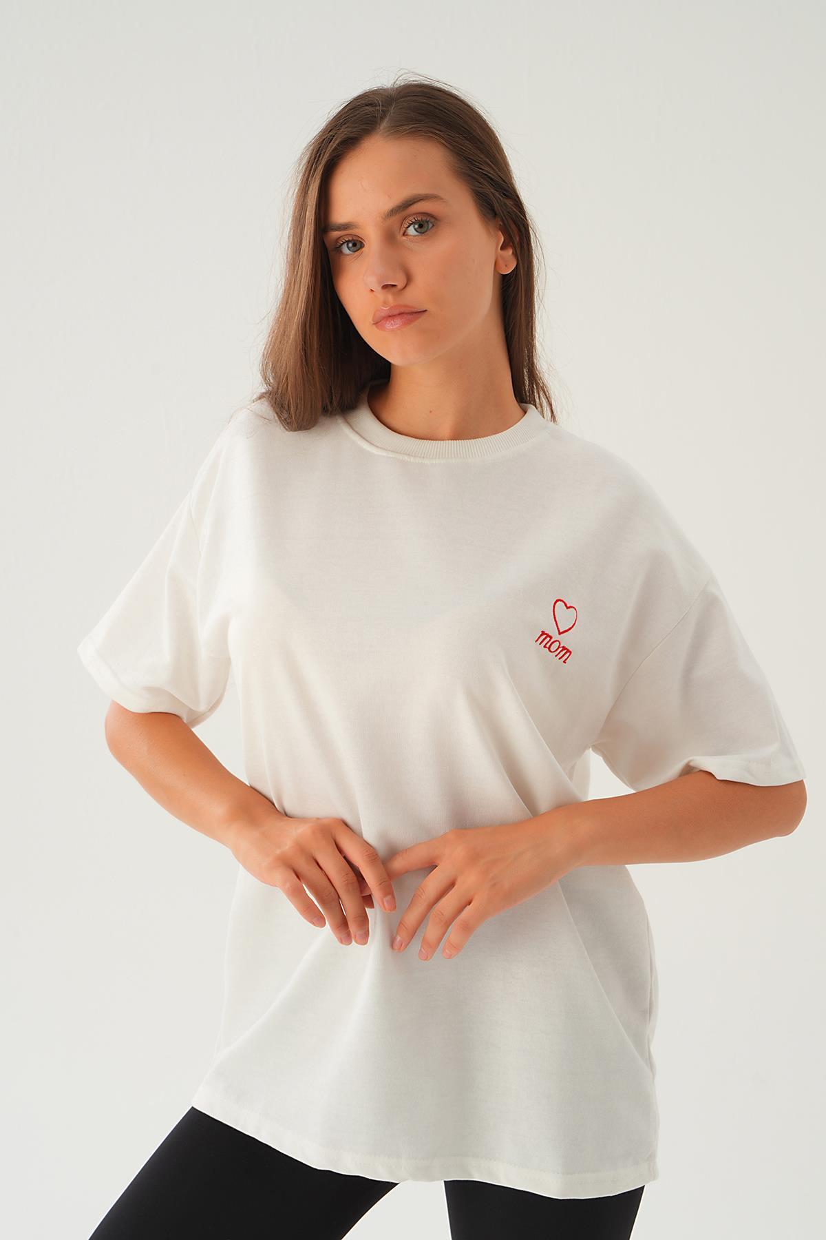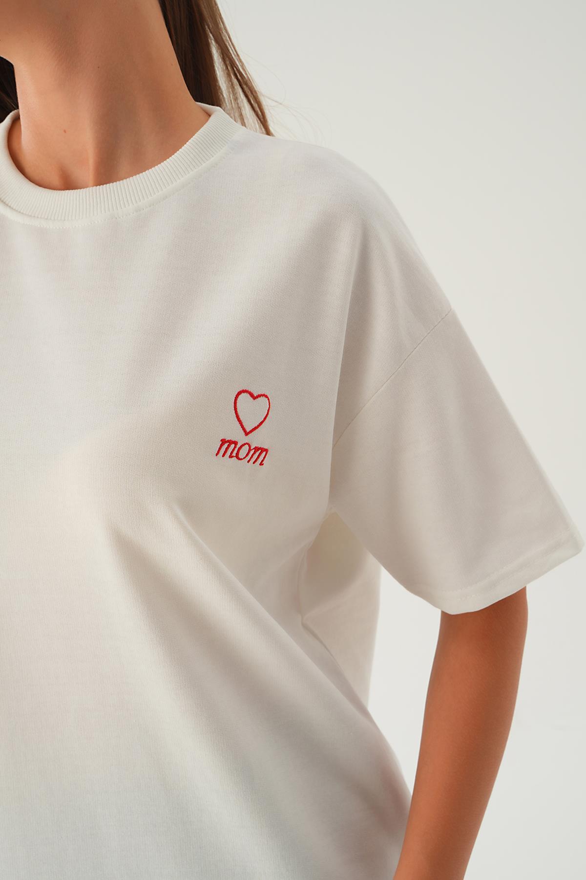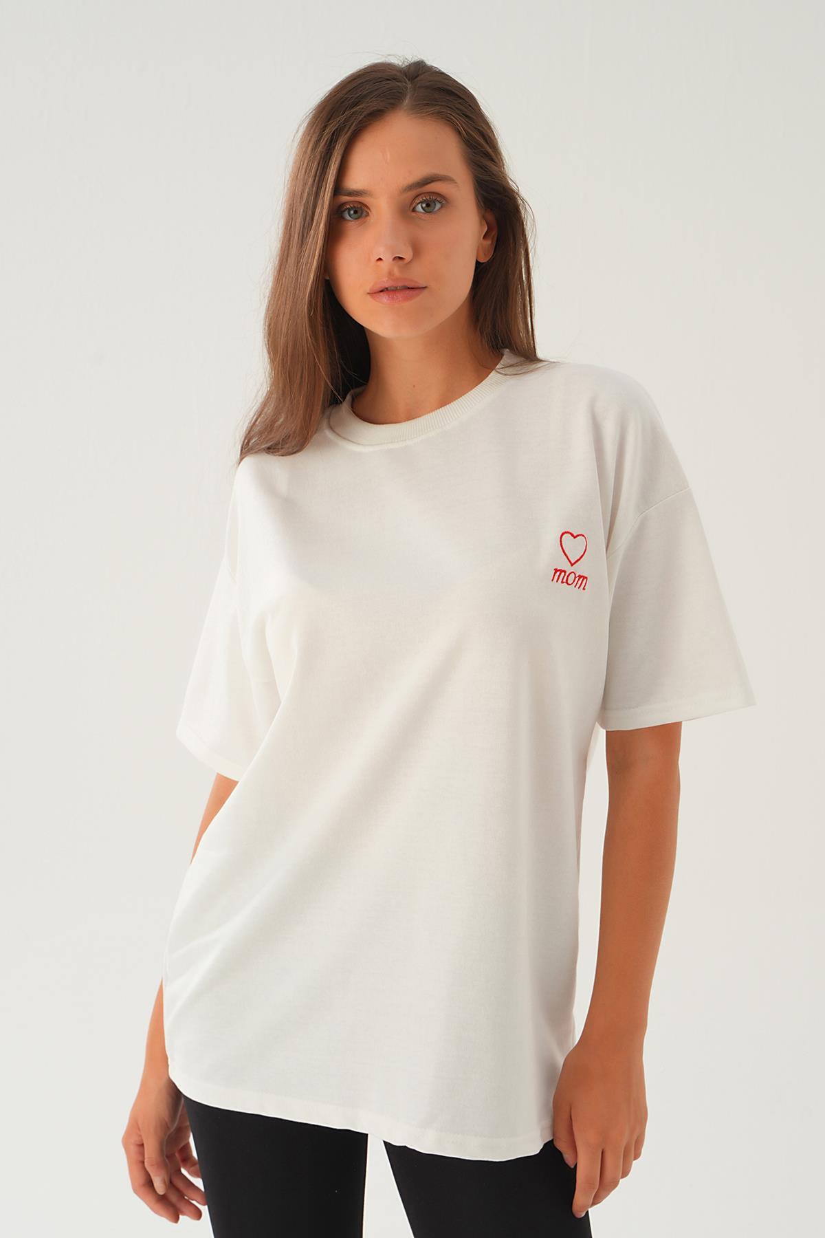 Beyaz Kalp Nakış Detay Tişört 2448
