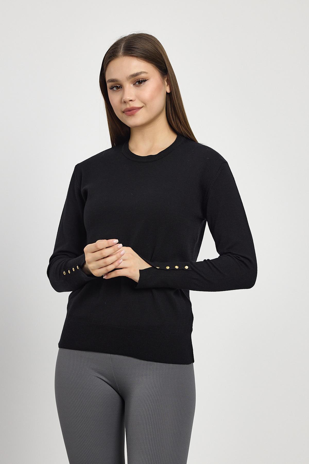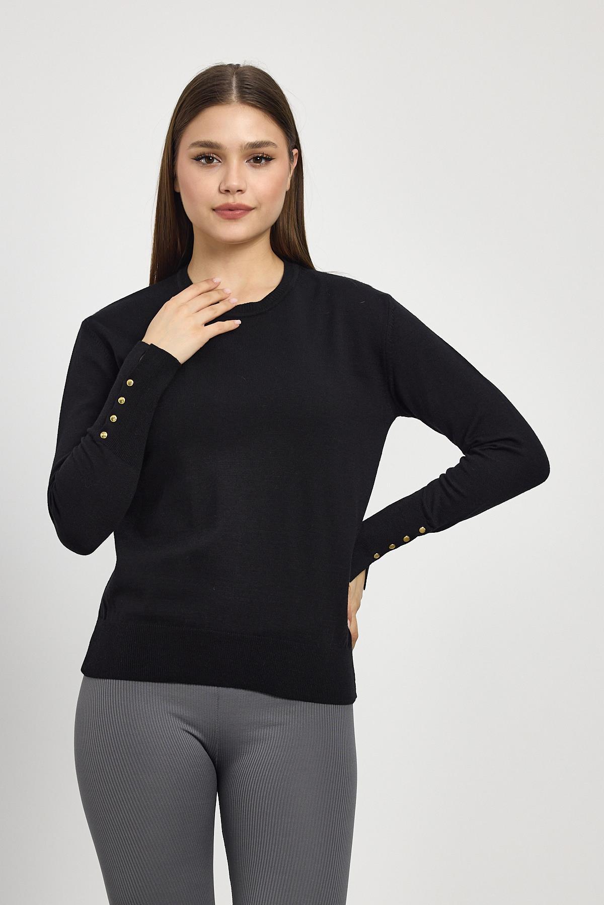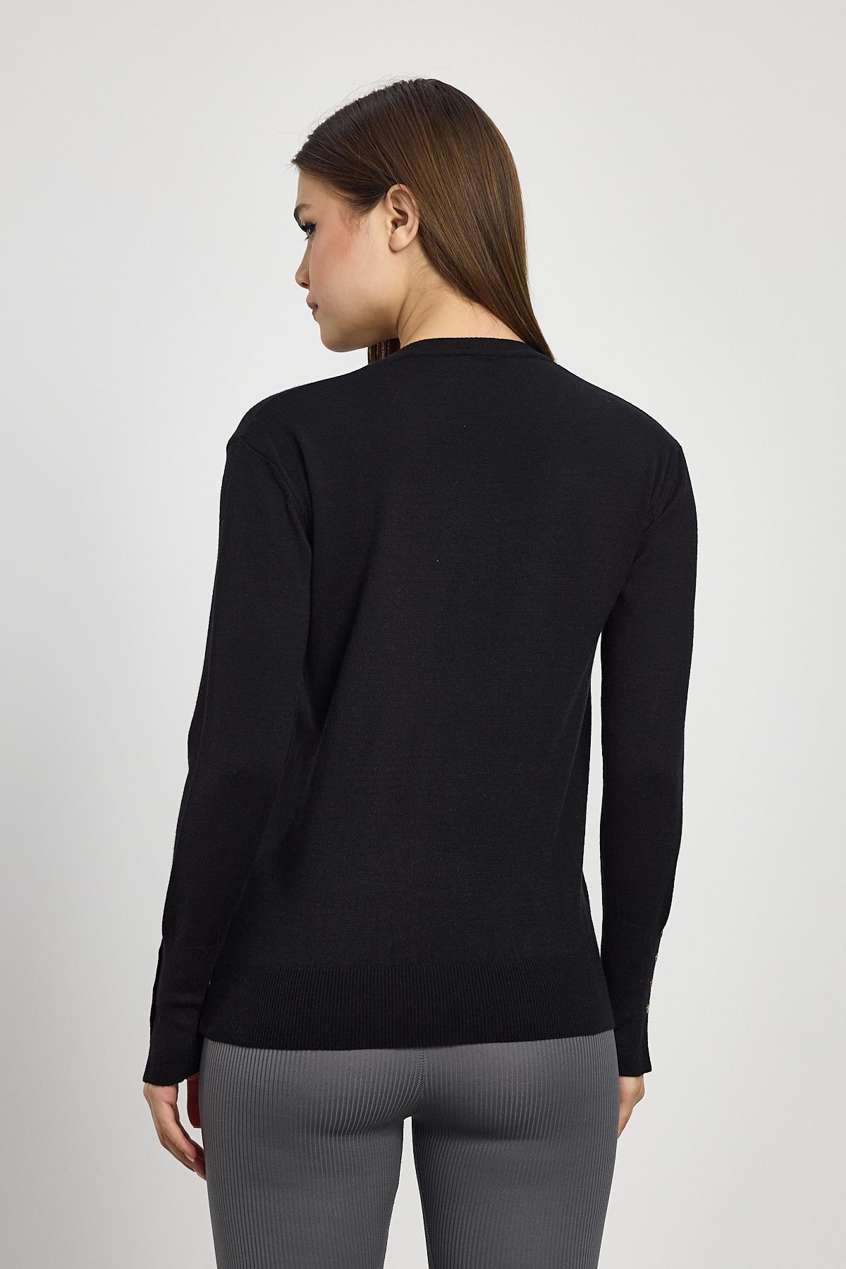 Siyah Bisiklet Yaka Kol Düğmeli Kadın Triko Kazak 2455