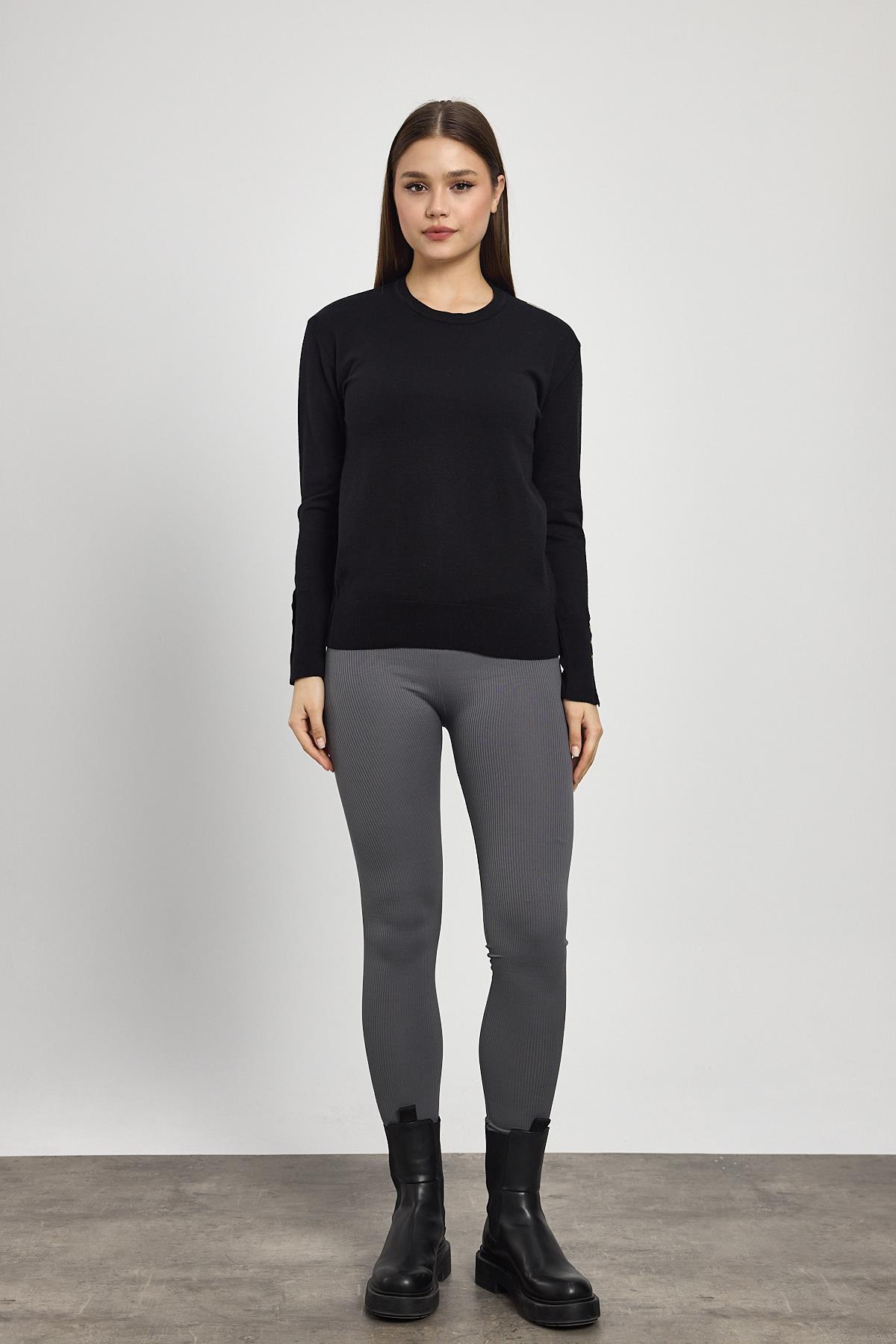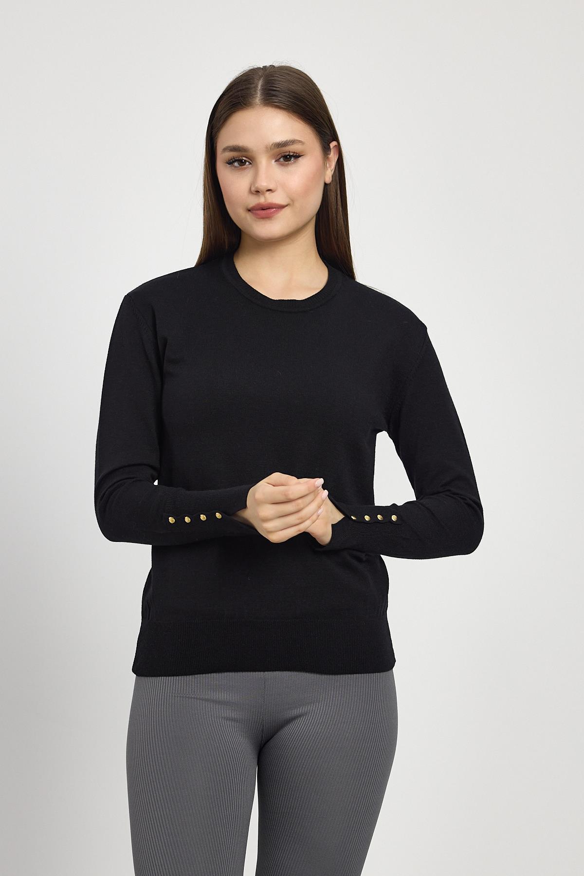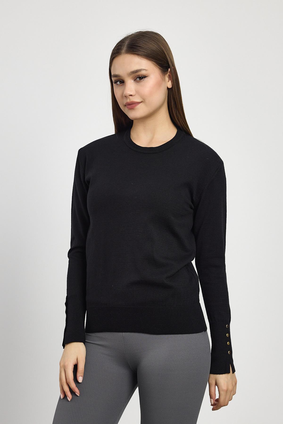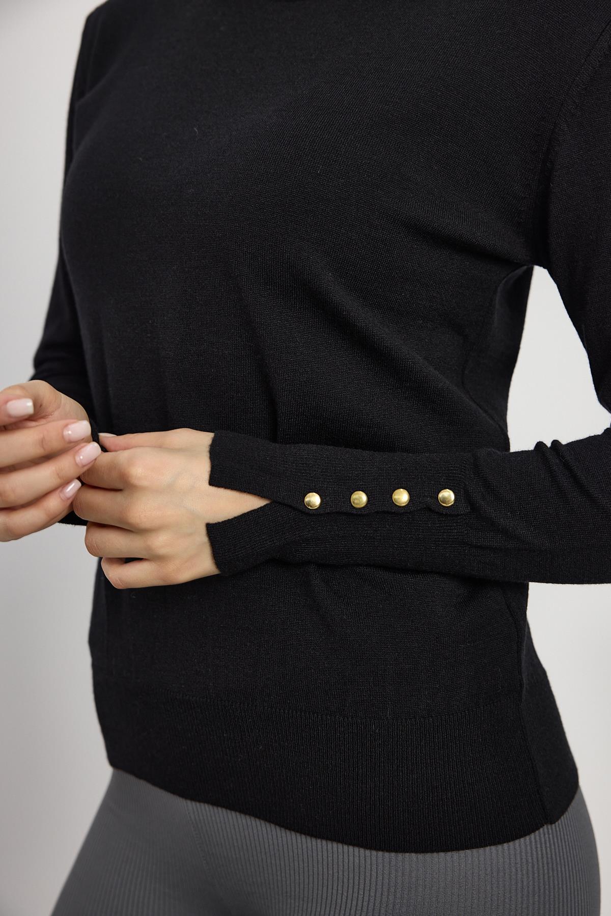 Siyah Bisiklet Yaka Kol Düğmeli Kadın Triko Kazak 2455