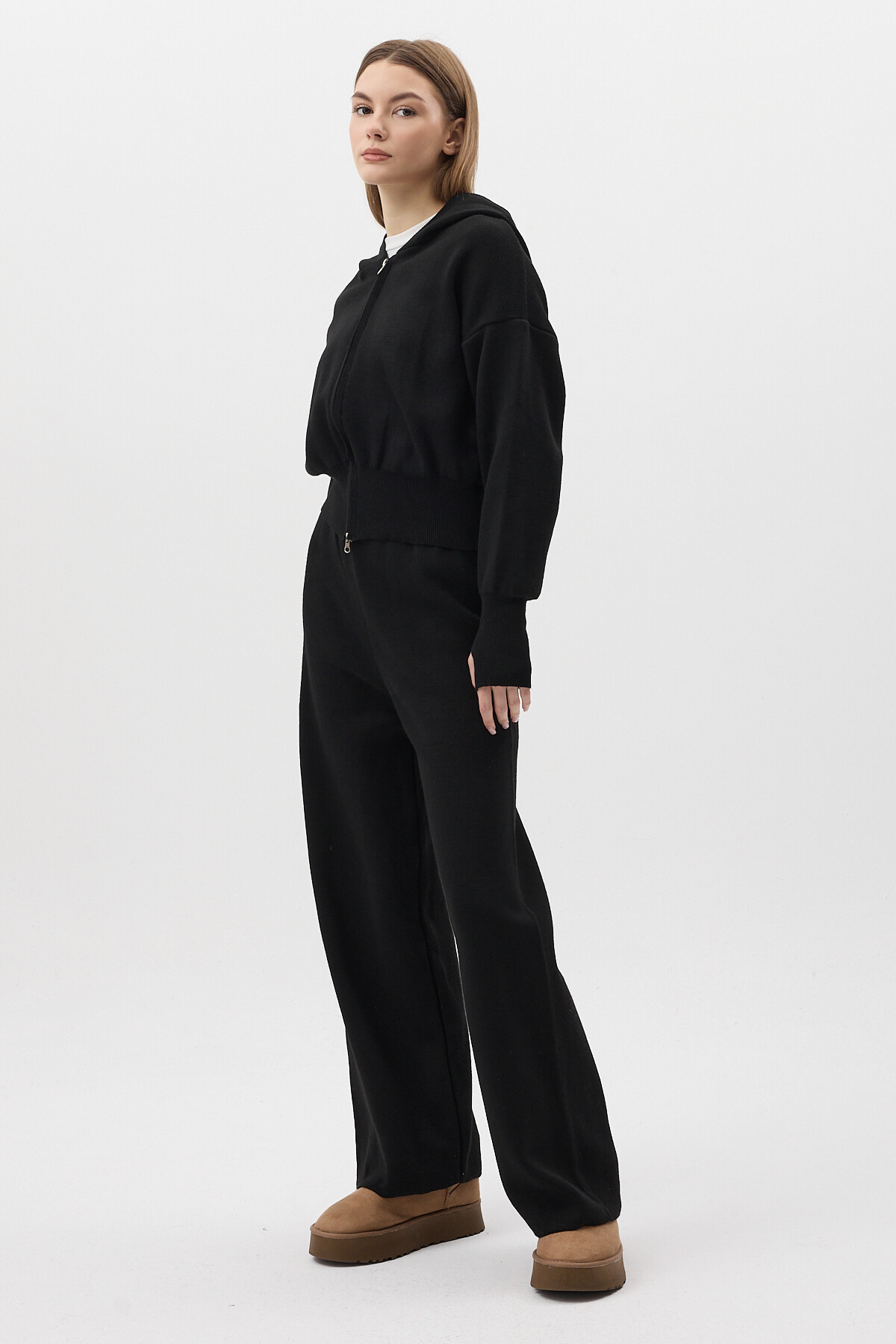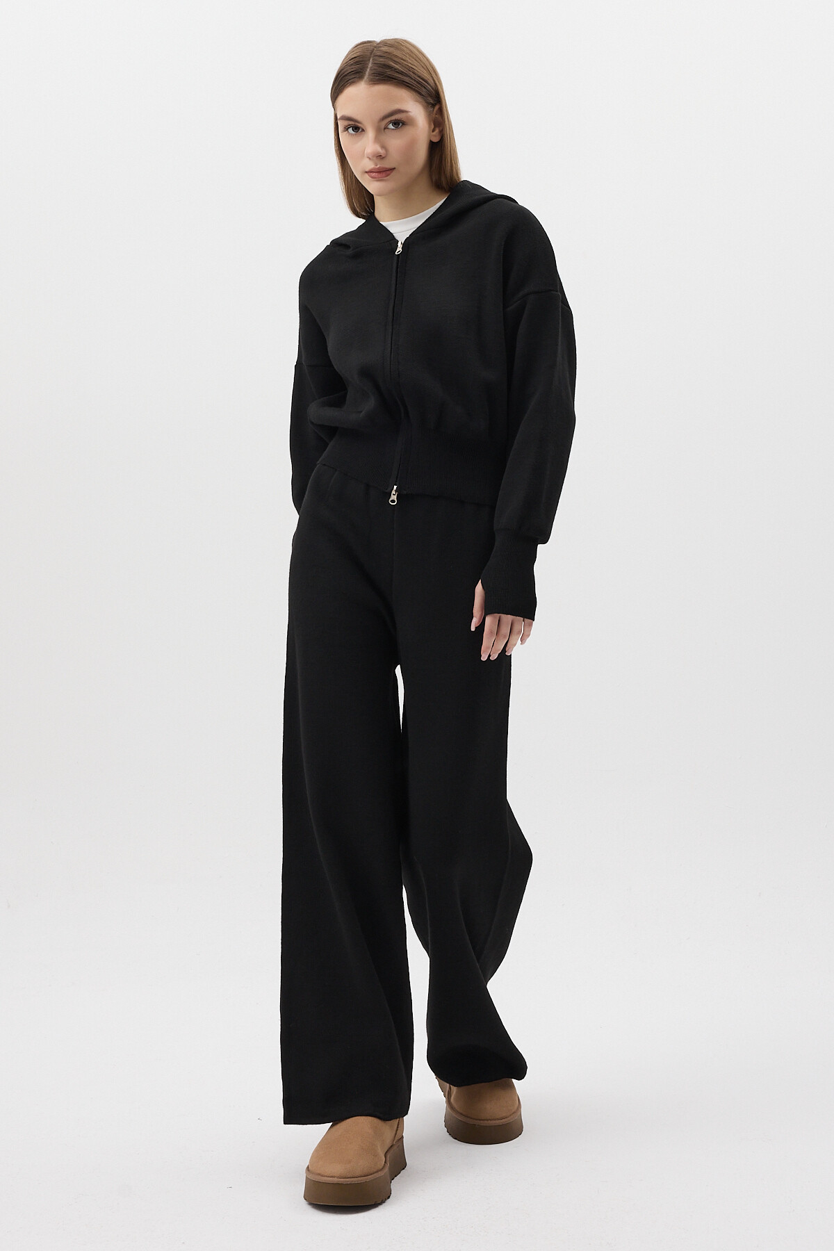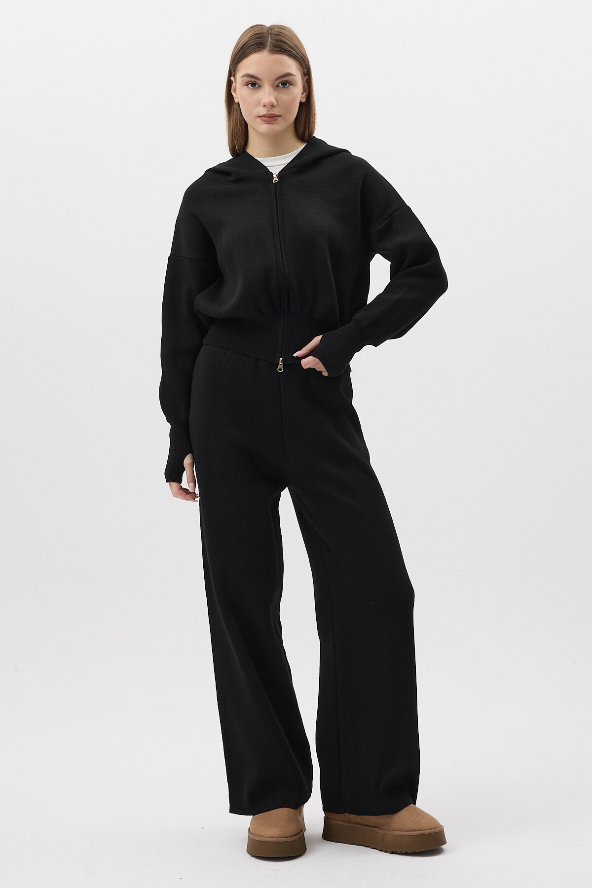 Siyah Kapüşonlu Fermuarlı Triko Örme Pantolon Kadın Takım 2460