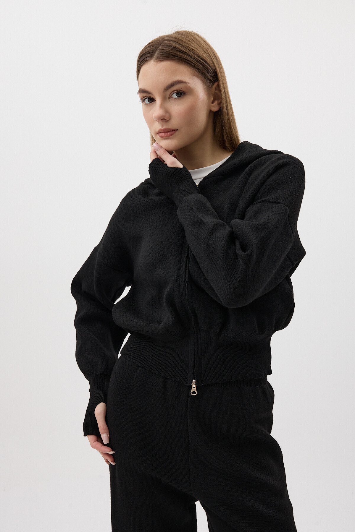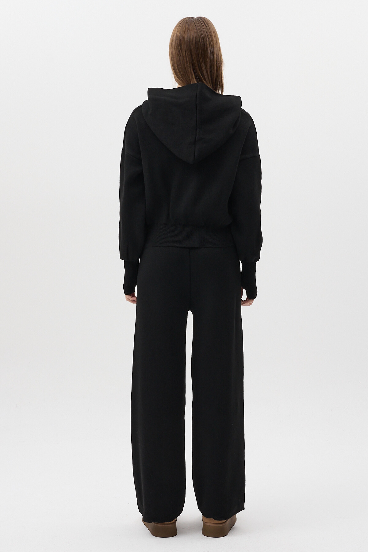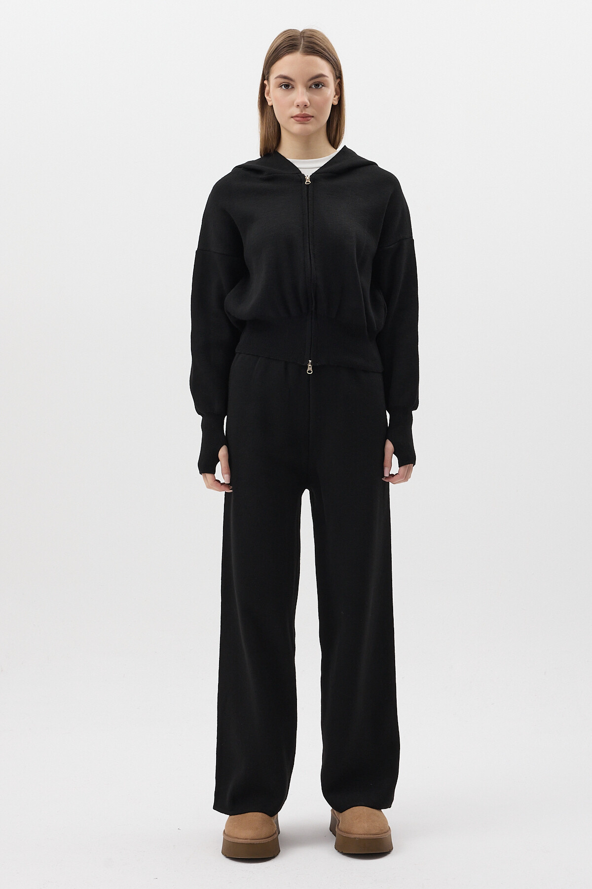Siyah Kapüşonlu Fermuarlı Triko Örme Pantolon Kadın Takım 2460