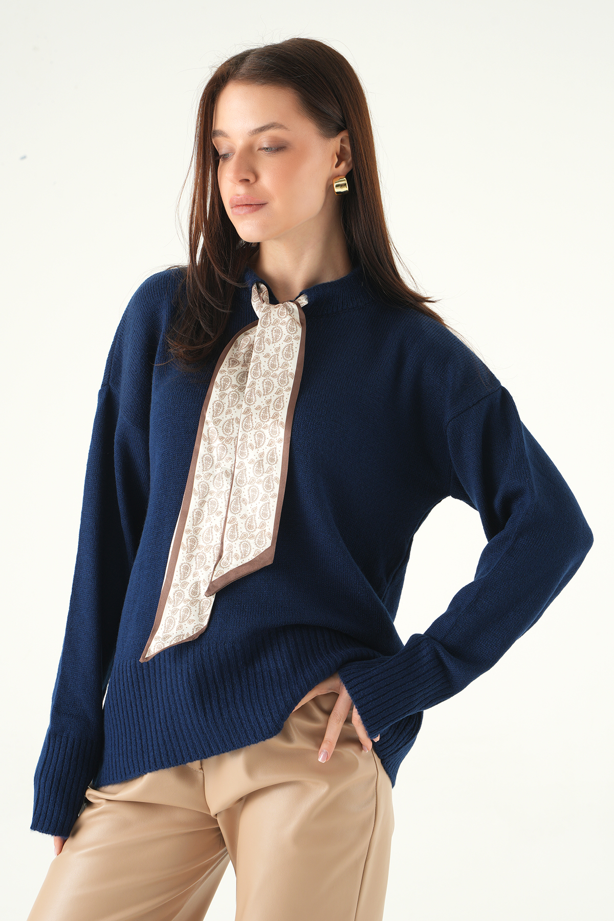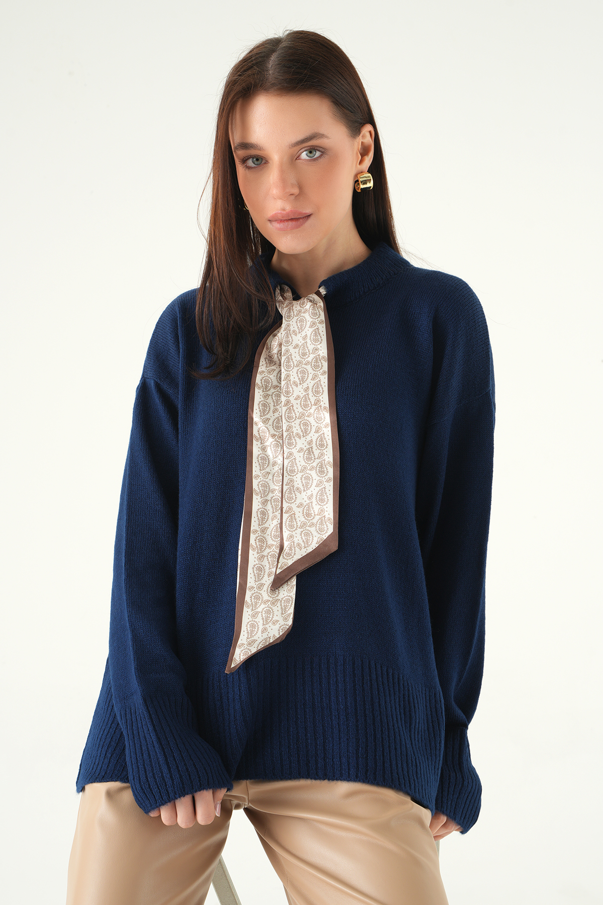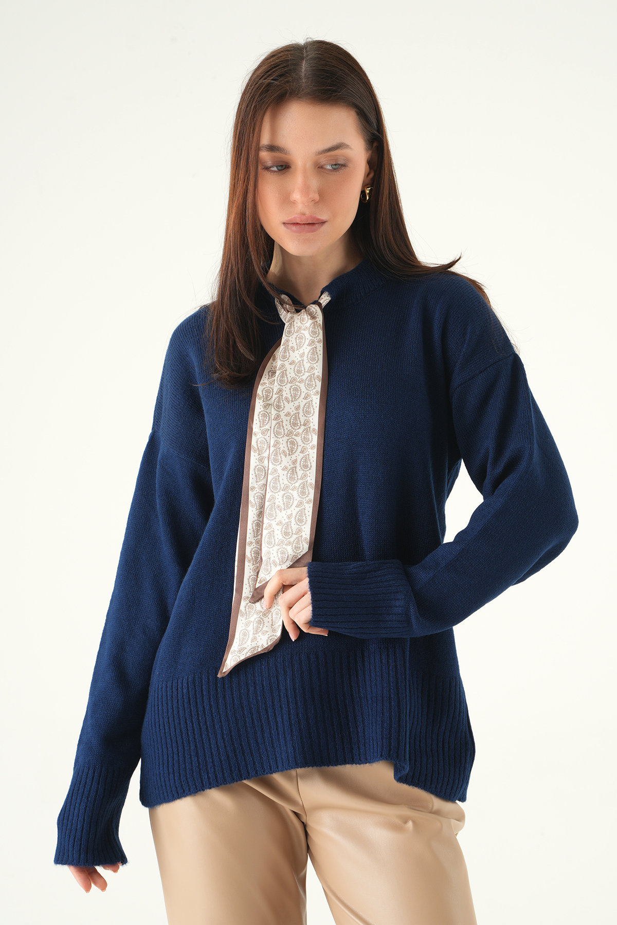 Laci Fular Detaylı Dik Yaka Kadın Triko Kazak 2465