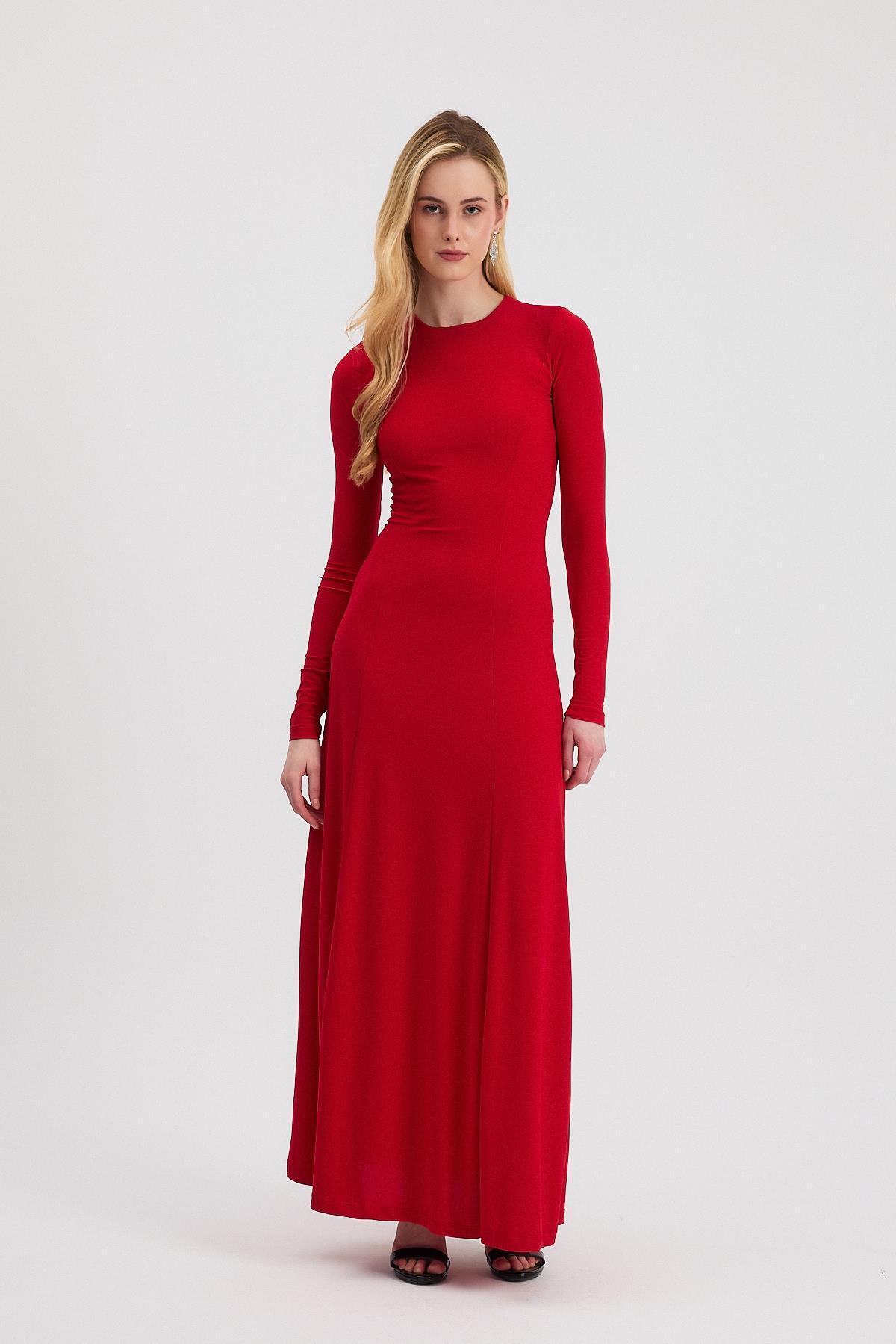 2510 Bisiklet Yaka Uzun Elbise Kırmızı