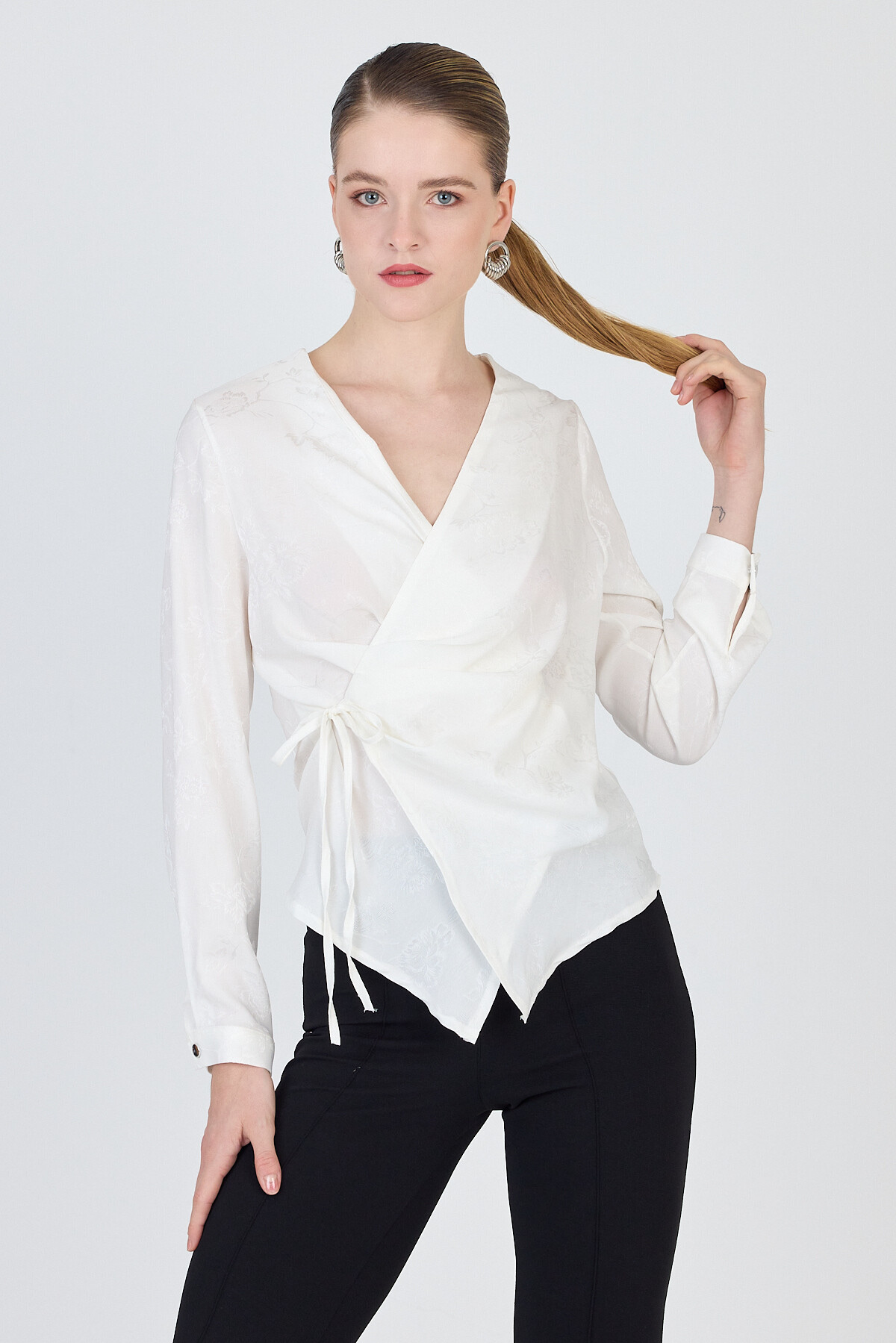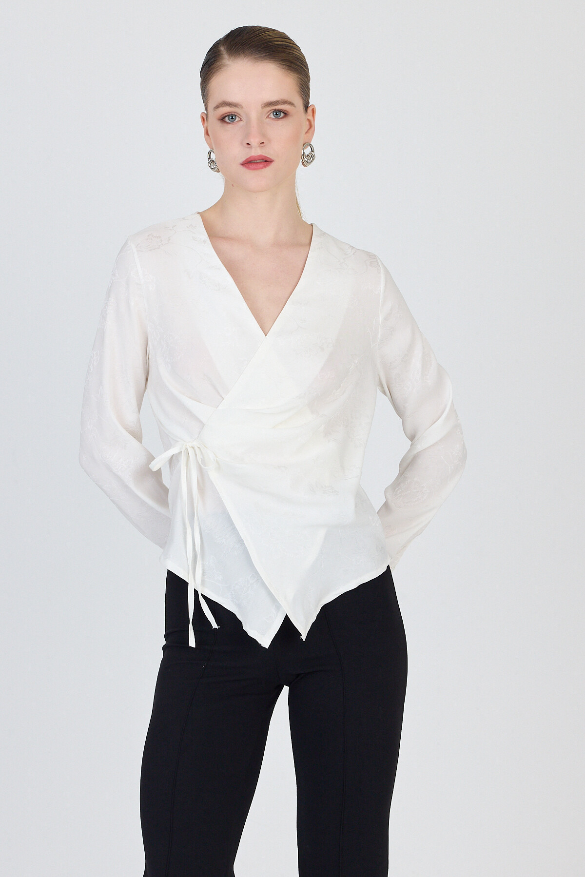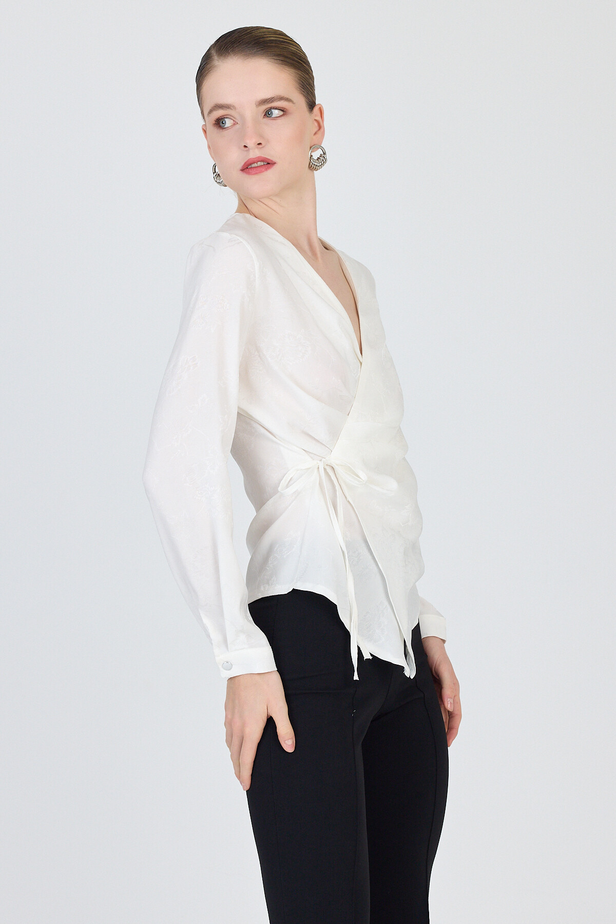 Ekru Jakarlı Kruvaze Yaka Bağlamalı Bluz 251156