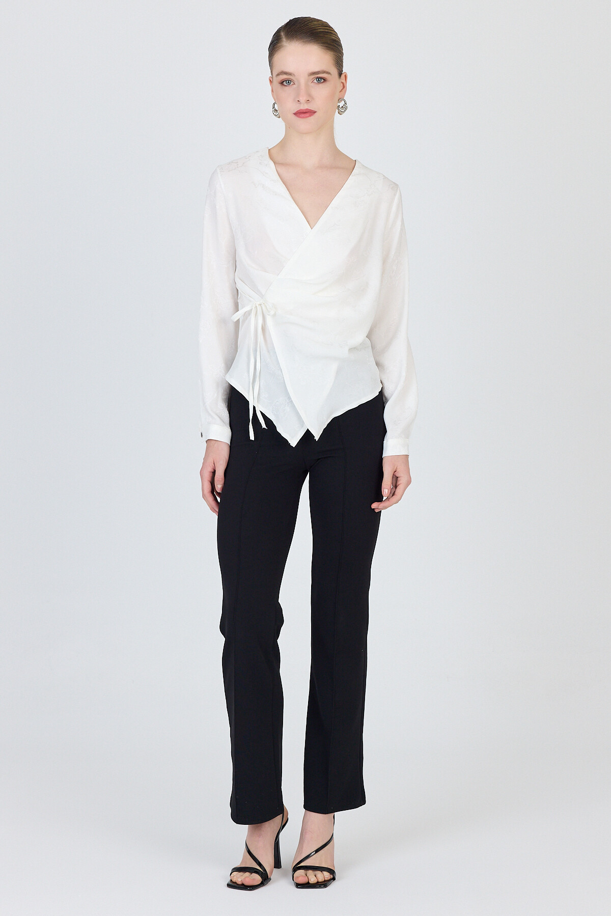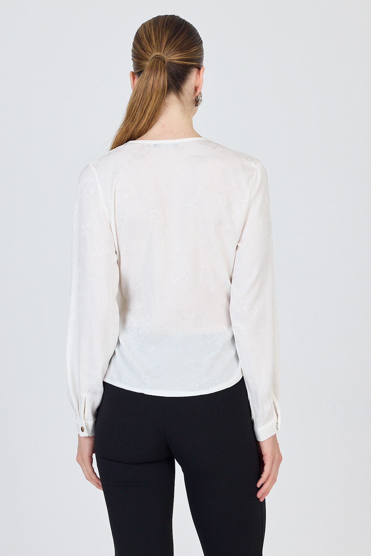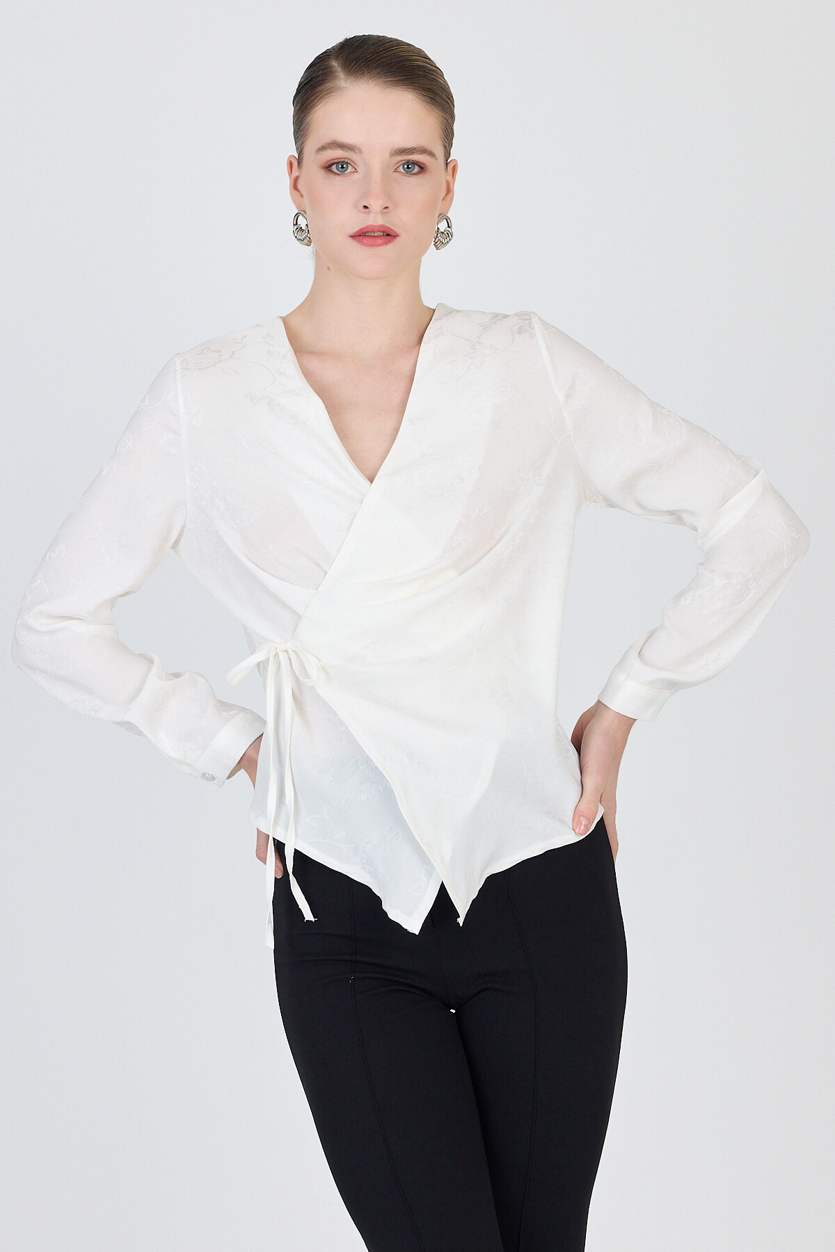 Ekru Jakarlı Kruvaze Yaka Bağlamalı Bluz 251156