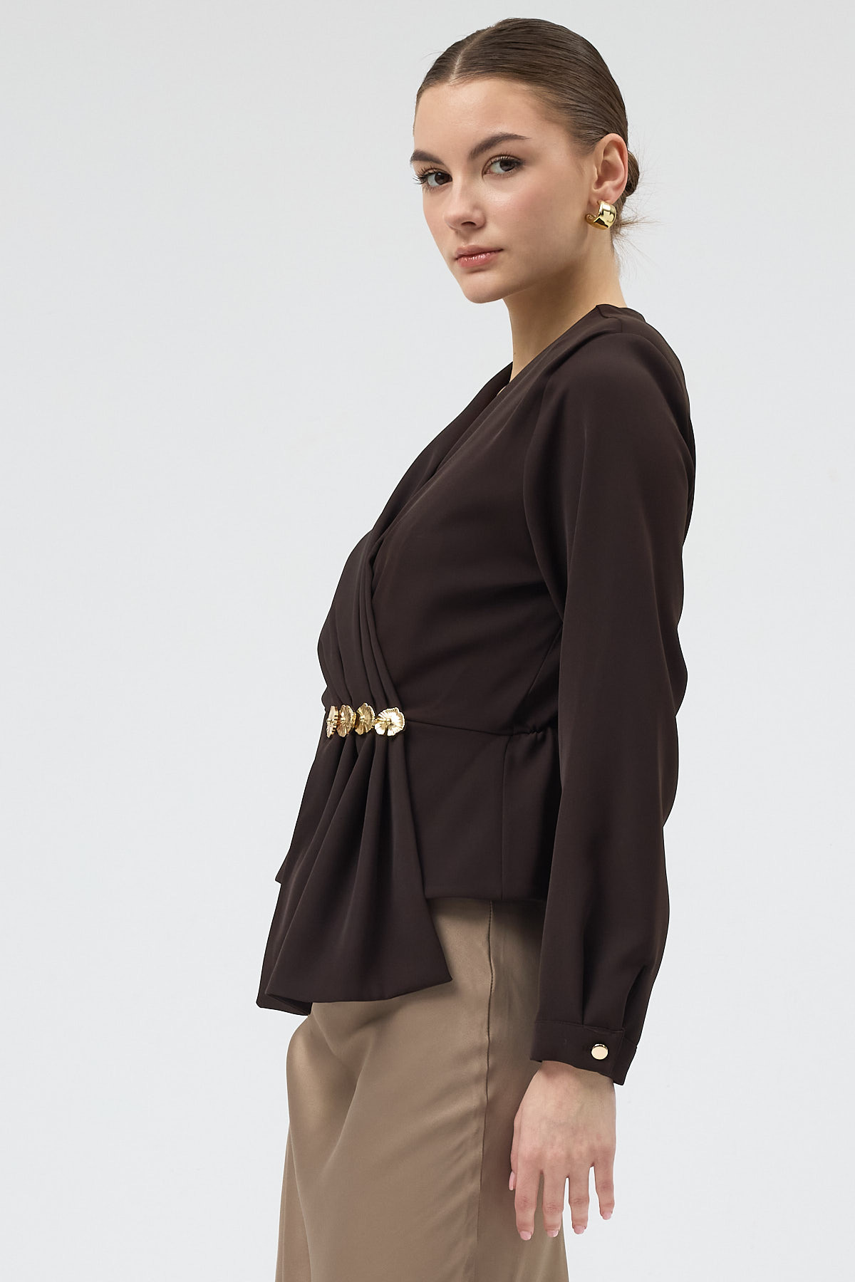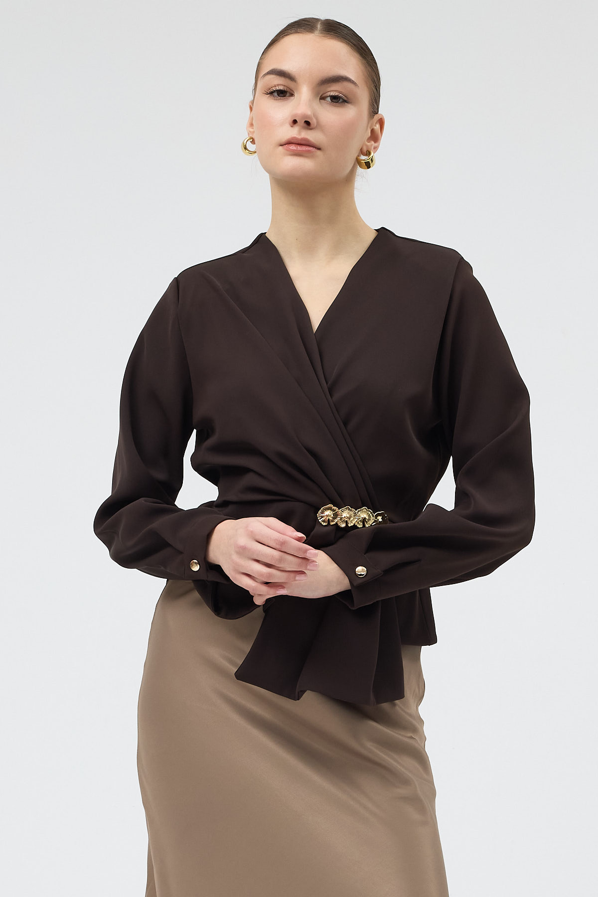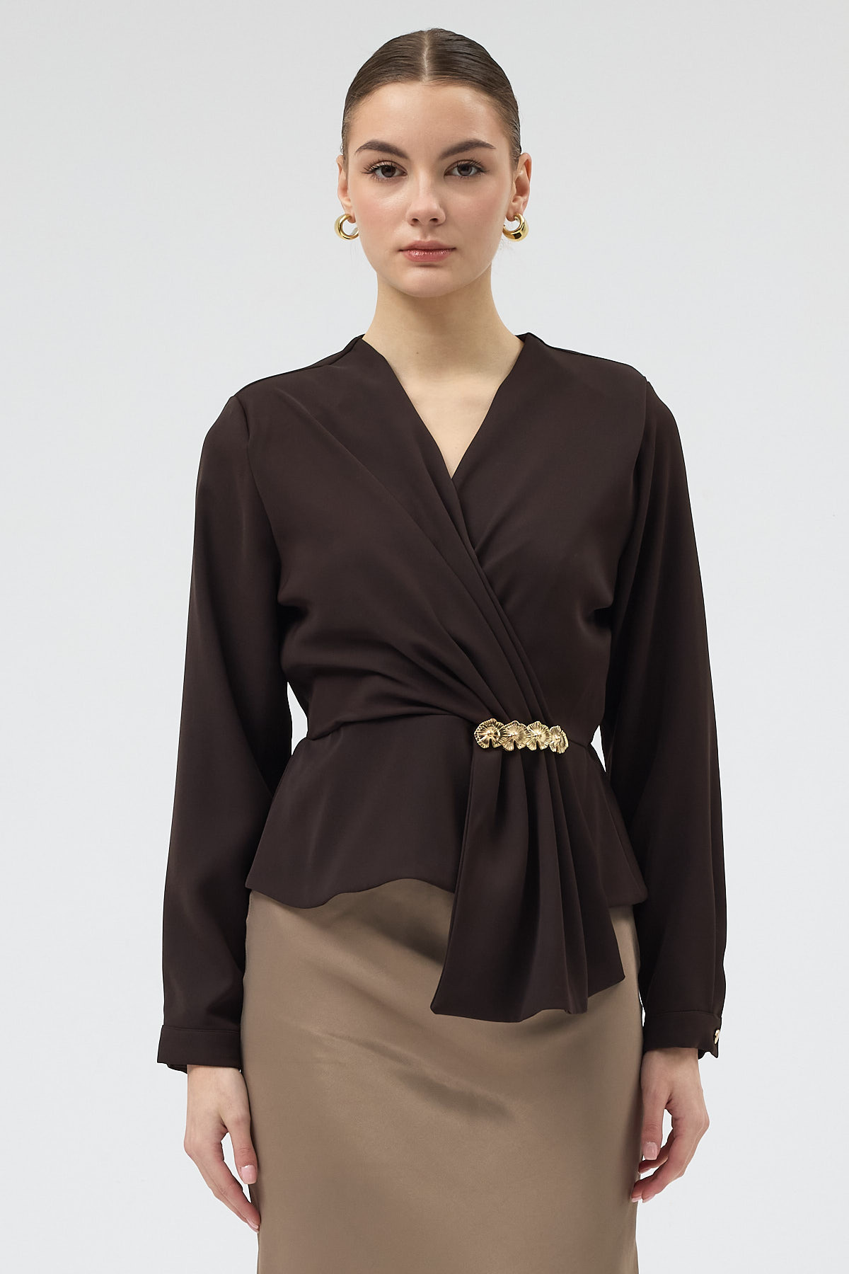 Acı Kahve Kruvaze Yaka Taş Toka Detaylı Uzun Kollu Kadın Bluz 251279